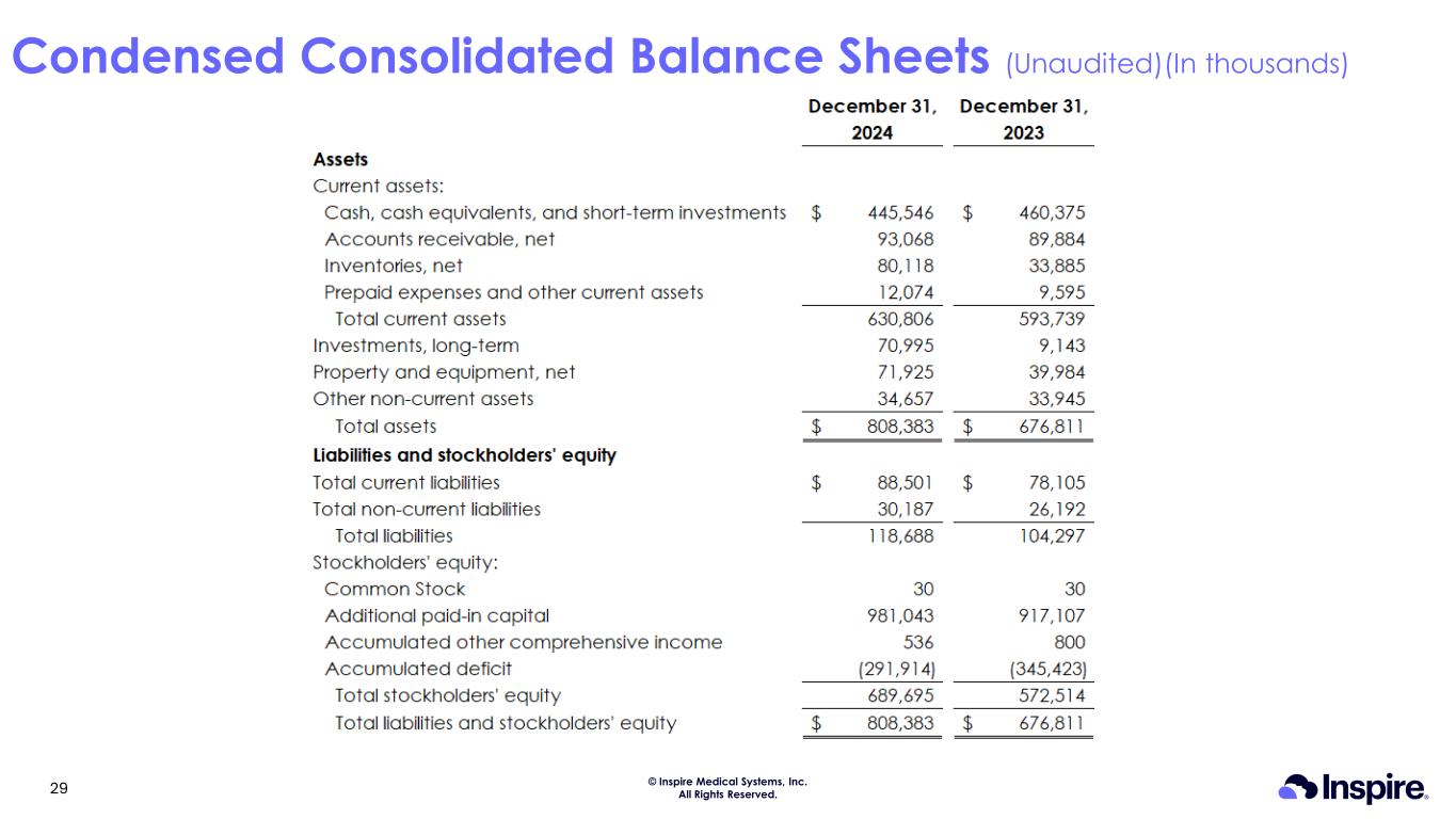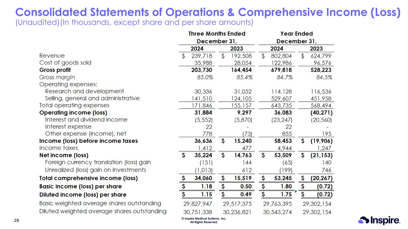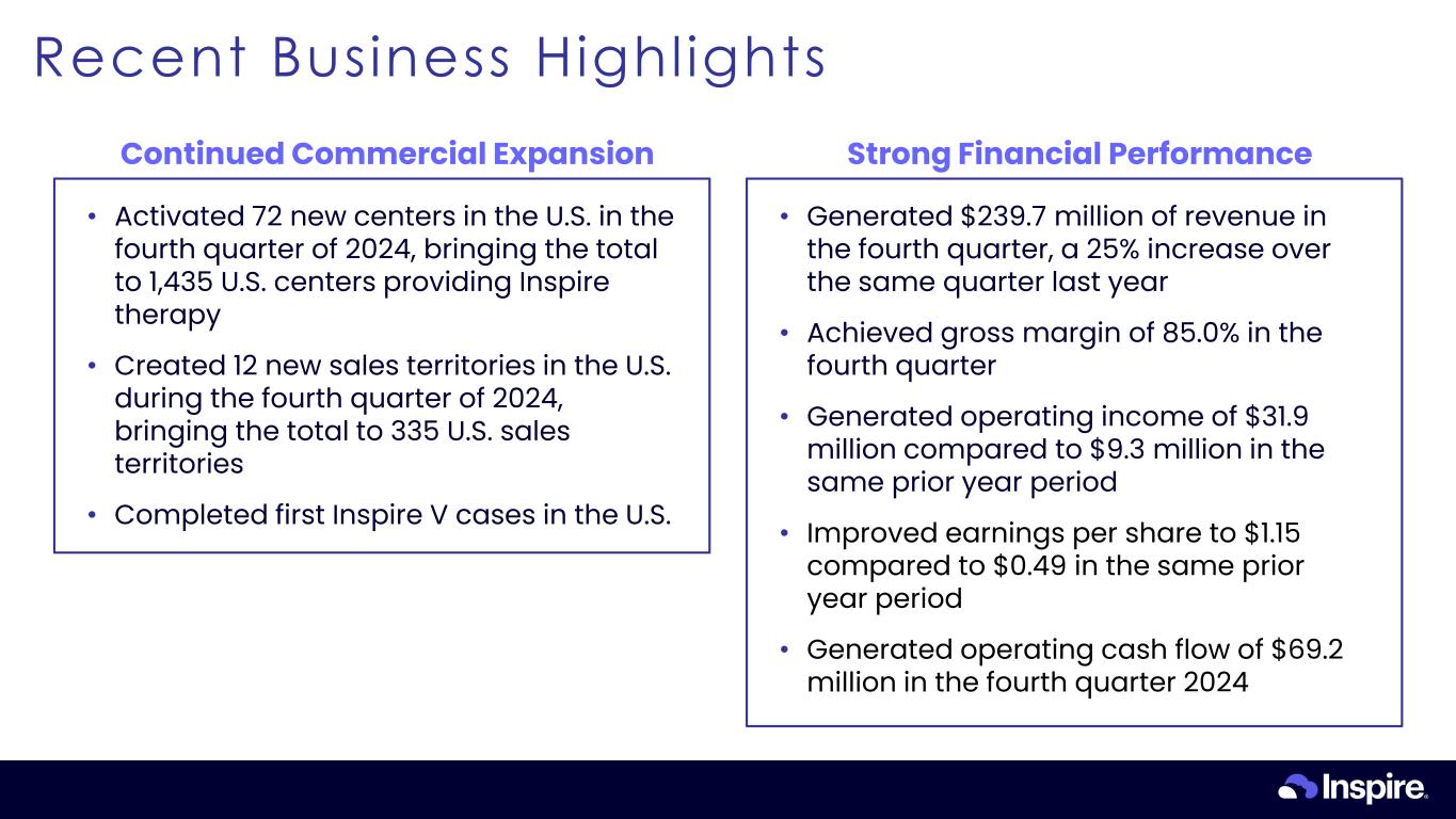 ミネソタ州ミネアポリス-2025年2月10日-閉塞性睡眠時無呼吸症候群患者のための革新的で低侵襲なソリューションの開発と商業化に注力する医療技術企業であるインスパイア・メディカル・システムズ社(NYSE:INSP)(インスパイア)は本日、2024年12月31日を期末とする四半期および年度の決算を発表した。