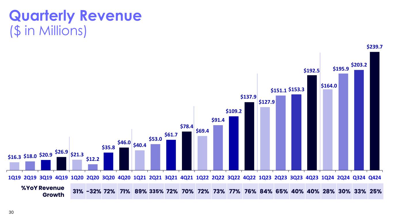 -2024年第4四半期の売上高は前年同期比25%増の2億3,970万ドル、2024年通年の売上高は2023年通年比28%増の8億2,080万ドル。