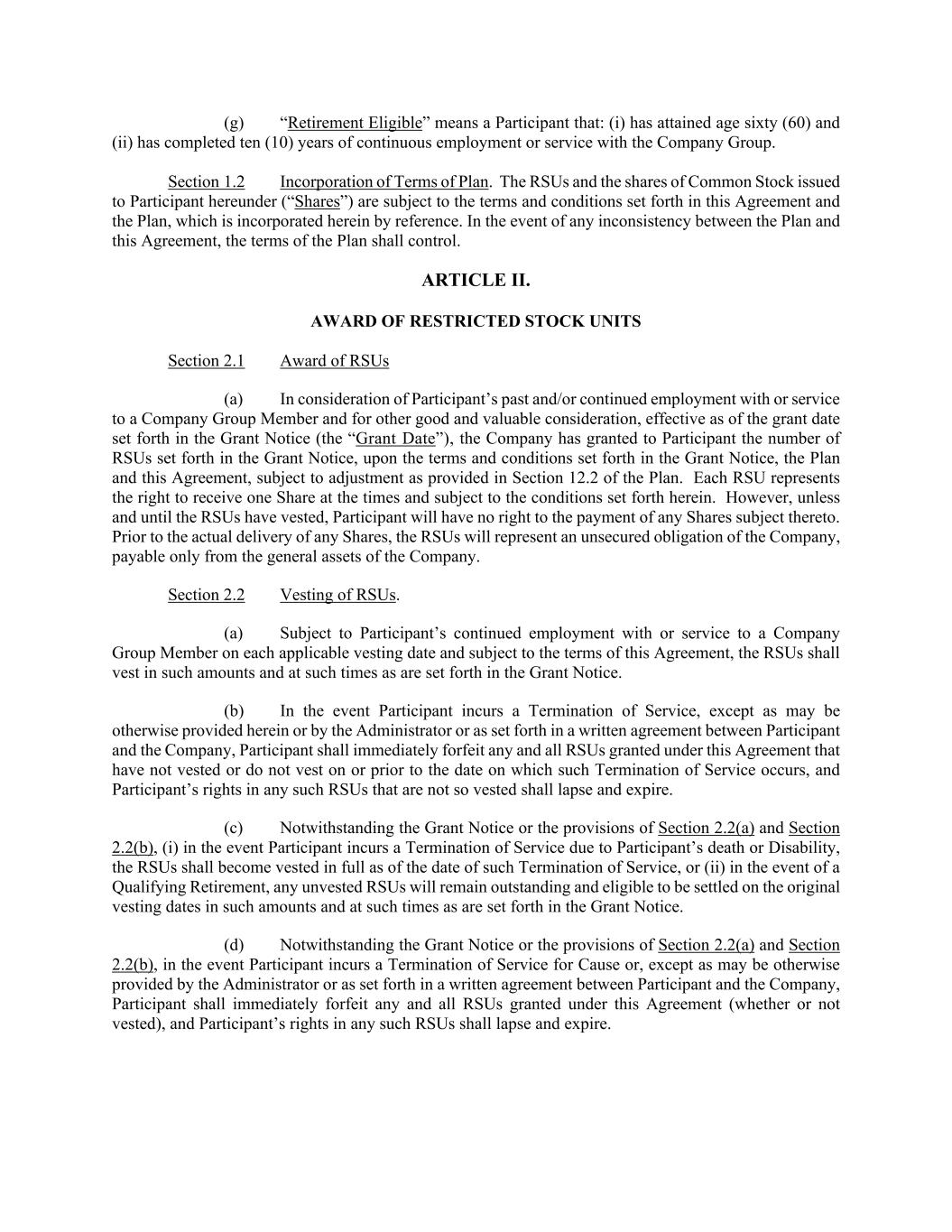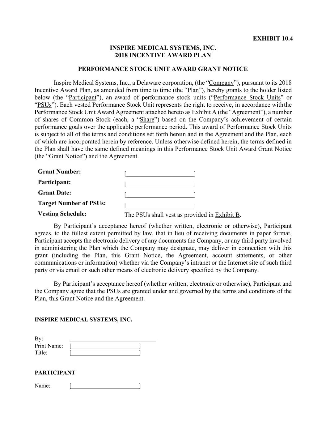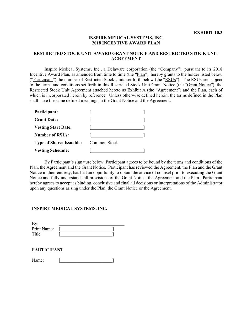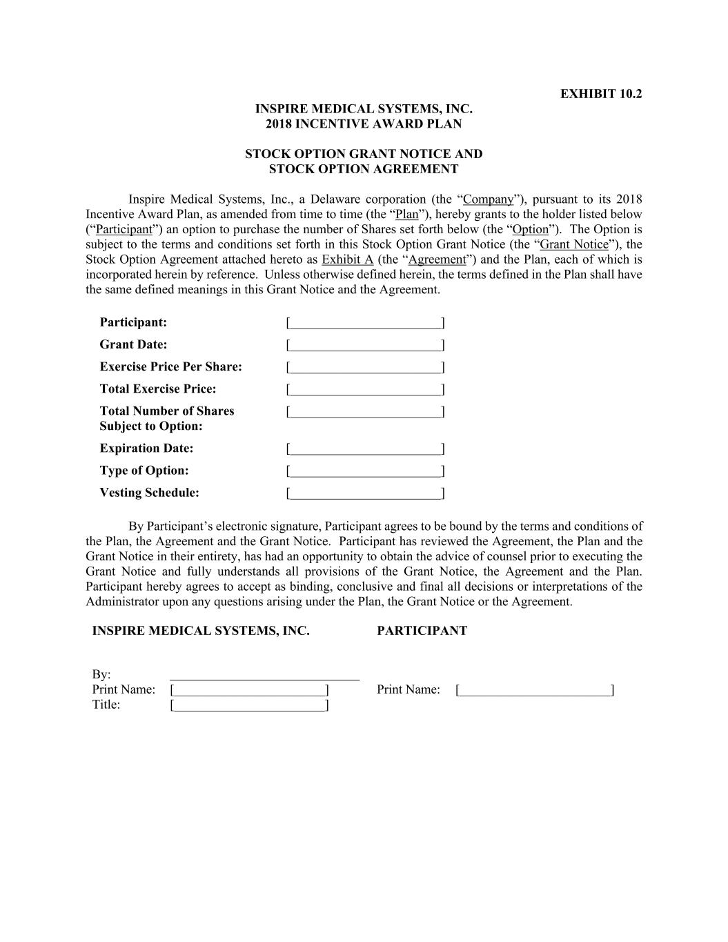 Non‐Employee Director Compensation Policy Inspire Medical Systems, Inc. (a) Annual Awards. Each Non‐Employee Director who (i) serves on the Board as of the date of any annual meeting of the Company’s stockholders (an “Annual Meeting”) after the Effective Time and (ii) will continue to serve as a Non‐Employee Director immediately following such Annual Meeting shall be automatically granted, on the date of such Annual Meeting, an award of restricted stock units (“RSUs”) having an aggregate fair value on the date of grant of $200,000 (as determined in accordance with FASB Accounting Codification Topic 718 (“ASC 718”) and subject to adjustment as provided in the Equity Plan). If the number of shares of Common Stock subject to an RSU award granted under this Section 2(a) would include a fractional share of Common Stock, the value of that fractional share shall instead be paid in cash at the date of grant. The awards described in this Section 2(a) shall be referred to as the “Annual Awards.” For the avoidance of doubt, a Non‐Employee Director elected for the first time to the Board at an Annual Meeting shall receive only an Annual Award in connection with such election, and shall not receive any Initial Award on the date of such Annual Meeting as well. (b) Initial Awards. Each Non‐Employee Director who is initially elected or appointed to the Board after the date the IPO price of the shares of Common Stock is established in connection with the IPO, on any date other than the date of an Annual Meeting, shall be automatically granted, on the date of such Non‐Employee Director’s initial election or appointment (such Non‐Employee Director’s “Start Date”), an award of RSUs having an aggregate fair value on such Non‐Employee Director’s Start Date equal to $300,000 (as determined in accordance with ASC 718 and subject to adjustment as provided in the Equity Plan). If the number of shares of Common Stock subject to an RSU award granted under this Section 2(b) would include a fractional share of Common Stock, the value of that fractional share shall instead be paid in cash at the date of grant. The awards described in this Section 2(b) shall be referred to as “Initial Awards.” For the avoidance of doubt, no Non‐Employee Director shall be granted more than one Initial Award. (c) Termination of Employment of Employee Directors. Members of the Board who are employees of the Company or any parent or subsidiary of the Company who subsequently terminate their employment with the Company and any parent or subsidiary of the Company and remain on the Board will not receive an Initial Award pursuant to Section 2(b) above, but to the extent that they are otherwise eligible, will be eligible to receive, after termination from service with the Company and any parent or subsidiary of the Company, Annual Awards as described in Section 2(a) above. (d) Vesting of Awards Granted to Non‐Employee Directors. Each Annual Award shall vest and become exercisable on the first anniversary of the date of grant and each Initial Award shall vest and become exercisable in three equal annual installments following the date of grant (such that the Initial Award shall vest and become exercisable in full on the third anniversary of the date of grant), in each case subject to the Non‐Employee Director continuing in service through the applicable vesting dates. No portion of an Annual Award or Initial Award that is unvested or unexercisable at the time of a Non‐Employee Director’s termination of service on the Board shall become vested and exercisable thereafter. All of a Non‐ Employee Director’s Annual Awards and Initial Awards shall vest in full immediately prior to the occurrence of a Change in Control (as defined in the Equity Plan), to the extent outstanding at such time.