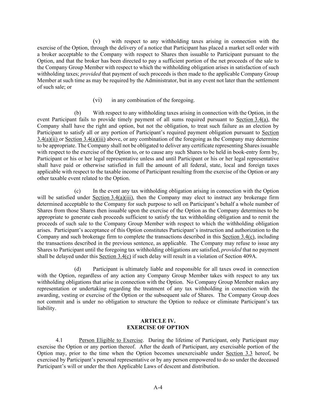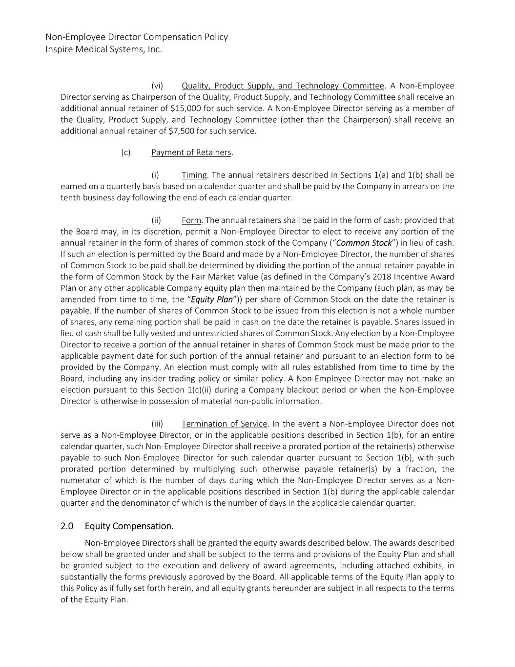 Non‐Employee Director Compensation Policy Inspire Medical Systems, Inc. (vi) Quality, Product Supply, and Technology Committee. A Non‐Employee Director serving as Chairperson of the Quality, Product Supply, and Technology Committee shall receive an additional annual retainer of $15,000 for such service. A Non‐Employee Director serving as a member of the Quality, Product Supply, and Technology Committee (other than the Chairperson) shall receive an additional annual retainer of $7,500 for such service. (c) Payment of Retainers. (i) Timing. The annual retainers described in Sections 1(a) and 1(b) shall be earned on a quarterly basis based on a calendar quarter and shall be paid by the Company in arrears on the tenth business day following the end of each calendar quarter. (ii) Form. The annual retainers shall be paid in the form of cash; provided that the Board may, in its discretion, permit a Non‐Employee Director to elect to receive any portion of the annual retainer in the form of shares of common stock of the Company (“Common Stock”) in lieu of cash. If such an election is permitted by the Board and made by a Non‐Employee Director, the number of shares of Common Stock to be paid shall be determined by dividing the portion of the annual retainer payable in the form of Common Stock by the Fair Market Value (as defined in the Company’s 2018 Incentive Award Plan or any other applicable Company equity plan then maintained by the Company (such plan, as may be amended from time to time, the “Equity Plan”)) per share of Common Stock on the date the retainer is payable. If the number of shares of Common Stock to be issued from this election is not a whole number of shares, any remaining portion shall be paid in cash on the date the retainer is payable. Shares issued in lieu of cash shall be fully vested and unrestricted shares of Common Stock. Any election by a Non‐Employee Director to receive a portion of the annual retainer in shares of Common Stock must be made prior to the applicable payment date for such portion of the annual retainer and pursuant to an election form to be provided by the Company. An election must comply with all rules established from time to time by the Board, including any insider trading policy or similar policy. A Non‐Employee Director may not make an election pursuant to this Section 1(c)(ii) during a Company blackout period or when the Non‐Employee Director is otherwise in possession of material non‐public information. (iii) Termination of Service. In the event a Non‐Employee Director does not serve as a Non‐Employee Director, or in the applicable positions described in Section 1(b), for an entire calendar quarter, such Non‐Employee Director shall receive a prorated portion of the retainer(s) otherwise payable to such Non‐Employee Director for such calendar quarter pursuant to Section 1(b), with such prorated portion determined by multiplying such otherwise payable retainer(s) by a fraction, the numerator of which is the number of days during which the Non‐Employee Director serves as a Non‐ Employee Director or in the applicable positions described in Section 1(b) during the applicable calendar quarter and the denominator of which is the number of days in the applicable calendar quarter. 2.0 Equity Compensation. Non‐Employee Directors shall be granted the equity awards described below. The awards described below shall be granted under and shall be subject to the terms and provisions of the Equity Plan and shall be granted subject to the execution and delivery of award agreements, including attached exhibits, in substantially the forms previously approved by the Board. All applicable terms of the Equity Plan apply to this Policy as if fully set forth herein, and all equity grants hereunder are subject in all respects to the terms of the Equity Plan.