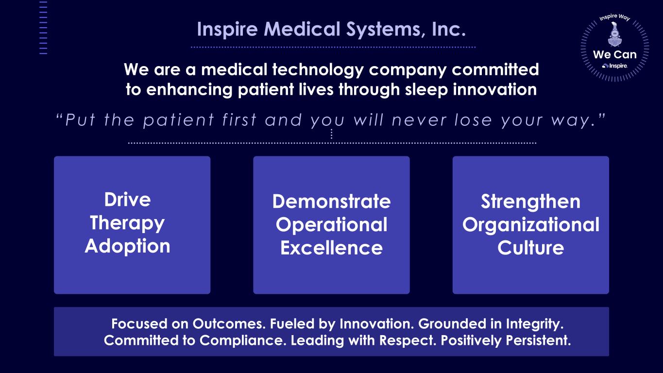 Inspire Medical Systems, Inc. We are a medical technology company committed to enhancing patient lives through sleep innovation “Put the pat ient f i r s t and you wi l l never lose your way.” Demonstrate Operational Excellence Drive Therapy Adoption Strengthen Organizational Culture Focused on Outcomes. Fueled by Innovation. Grounded in Integrity. Committed to Compliance. Leading with Respect. Positively Persistent.