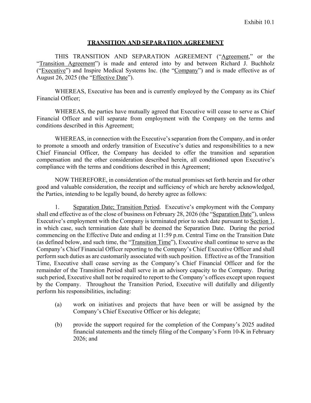 Exhibit 10.1 TRANSITION AND SEPARATION AGREEMENT THIS TRANSITION AND SEPARATION AGREEMENT (“Agreement,” or the “Transition Agreement”) is made and entered into by and between Richard J. Buchholz (“Executive”) and Inspire Medical Systems Inc. (the “Company”) and is made effective as of August 26, 2025 (the “Effective Date”). WHEREAS, Executive has been and is currently employed by the Company as its Chief Financial Officer; WHEREAS, the parties have mutually agreed that Executive will cease to serve as Chief Financial Officer and will separate from employment with the Company on the terms and conditions described in this Agreement; WHEREAS, in connection with the Executive’s separation from the Company, and in order to promote a smooth and orderly transition of Executive’s duties and responsibilities to a new Chief Financial Officer, the Company has decided to offer the transition and separation compensation and the other consideration described herein, all conditioned upon Executive’s compliance with the terms and conditions described in this Agreement; NOW THEREFORE, in consideration of the mutual promises set forth herein and for other good and valuable consideration, the receipt and sufficiency of which are hereby acknowledged, the Parties, intending to be legally bound, do hereby agree as follows: 1. Separation Date; Transition Period. Executive’s employment with the Company shall end effective as of the close of business on February 28, 2026 (the “Separation Date”), unless Executive’s employment with the Company is terminated prior to such date pursuant to Section 1, in which case, such termination date shall be deemed the Separation Date. During the period commencing on the Effective Date and ending at 11:59 p.m. Central Time on the Transition Date (as defined below, and such time, the “Transition Time”), Executive shall continue to serve as the Company’s Chief Financial Officer reporting to the Company’s Chief Executive Officer and shall perform such duties as are customarily associated with such position. Effective as of the Transition Time, Executive shall cease serving as the Company’s Chief Financial Officer and for the remainder of the Transition Period shall serve in an advisory capacity to the Company. During such period, Executive shall not be required to report to the Company’s offices except upon request by the Company. Throughout the Transition Period, Executive will dutifully and diligently perform his responsibilities, including: (a) work on initiatives and projects that have been or will be assigned by the Company’s Chief Executive Officer or his delegate; (b) provide the support required for the completion of the Company’s 2025 audited financial statements and the timely filing of the Company’s Form 10-K in February 2026; and