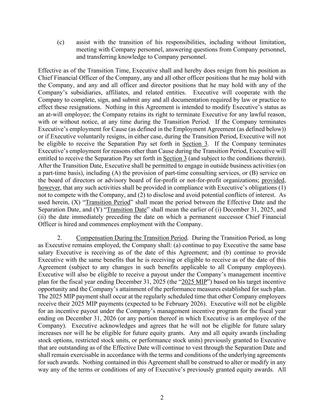 2 (c) assist with the transition of his responsibilities, including without limitation, meeting with Company personnel, answering questions from Company personnel, and transferring knowledge to Company personnel. Effective as of the Transition Time, Executive shall and hereby does resign from his position as Chief Financial Officer of the Company, any and all other officer positions that he may hold with the Company, and any and all officer and director positions that he may hold with any of the Company’s subsidiaries, affiliates, and related entities. Executive will cooperate with the Company to complete, sign, and submit any and all documentation required by law or practice to effect these resignations. Nothing in this Agreement is intended to modify Executive’s status as an at-will employee; the Company retains its right to terminate Executive for any lawful reason, with or without notice, at any time during the Transition Period. If the Company terminates Executive’s employment for Cause (as defined in the Employment Agreement (as defined below)) or if Executive voluntarily resigns, in either case, during the Transition Period, Executive will not be eligible to receive the Separation Pay set forth in Section 3. If the Company terminates Executive’s employment for reasons other than Cause during the Transition Period, Executive will entitled to receive the Separation Pay set forth in Section 3 (and subject to the conditions therein). After the Transition Date, Executive shall be permitted to engage in outside business activities (on a part-time basis), including (A) the provision of part-time consulting services, or (B) service on the board of directors or advisory board of for-profit or not-for-profit organizations; provided, however, that any such activities shall be provided in compliance with Executive’s obligations (1) not to compete with the Company, and (2) to disclose and avoid potential conflicts of interest. As used herein, (X) “Transition Period” shall mean the period between the Effective Date and the Separation Date, and (Y) “Transition Date” shall mean the earlier of (i) December 31, 2025, and (ii) the date immediately preceding the date on which a permanent successor Chief Financial Officer is hired and commences employment with the Company. 2. Compensation During the Transition Period. During the Transition Period, as long as Executive remains employed, the Company shall: (a) continue to pay Executive the same base salary Executive is receiving as of the date of this Agreement; and (b) continue to provide Executive with the same benefits that he is receiving or eligible to receive as of the date of this Agreement (subject to any changes in such benefits applicable to all Company employees). Executive will also be eligible to receive a payout under the Company’s management incentive plan for the fiscal year ending December 31, 2025 (the “2025 MIP”) based on his target incentive opportunity and the Company’s attainment of the performance measures established for such plan. The 2025 MIP payment shall occur at the regularly scheduled time that other Company employees receive their 2025 MIP payments (expected to be February 2026). Executive will not be eligible for an incentive payout under the Company’s management incentive program for the fiscal year ending on December 31, 2026 (or any portion thereof in which Executive is an employee of the Company). Executive acknowledges and agrees that he will not be eligible for future salary increases nor will he be eligible for future equity grants. Any and all equity awards (including stock options, restricted stock units, or performance stock units) previously granted to Executive that are outstanding as of the Effective Date will continue to vest through the Separation Date and shall remain exercisable in accordance with the terms and conditions of the underlying agreements for such awards. Nothing contained in this Agreement shall be construed to alter or modify in any way any of the terms or conditions of any of Executive’s previously granted equity awards. All
