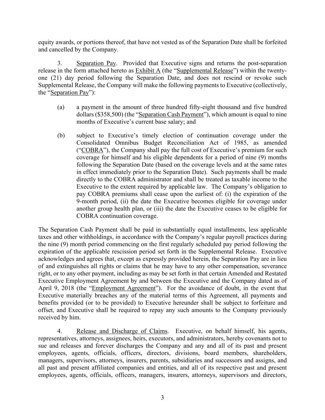 3 equity awards, or portions thereof, that have not vested as of the Separation Date shall be forfeited and cancelled by the Company. 3. Separation Pay. Provided that Executive signs and returns the post-separation release in the form attached hereto as Exhibit A (the “Supplemental Release”) within the twenty- one (21) day period following the Separation Date, and does not rescind or revoke such Supplemental Release, the Company will make the following payments to Executive (collectively, the “Separation Pay”): (a) a payment in the amount of three hundred fifty-eight thousand and five hundred dollars ($358,500) (the “Separation Cash Payment”), which amount is equal to nine months of Executive’s current base salary; and (b) subject to Executive’s timely election of continuation coverage under the Consolidated Omnibus Budget Reconciliation Act of 1985, as amended (“COBRA”), the Company shall pay the full cost of Executive’s premium for such coverage for himself and his eligible dependents for a period of nine (9) months following the Separation Date (based on the coverage levels and at the same rates in effect immediately prior to the Separation Date). Such payments shall be made directly to the COBRA administrator and shall be treated as taxable income to the Executive to the extent required by applicable law. The Company’s obligation to pay COBRA premiums shall cease upon the earliest of: (i) the expiration of the 9-month period, (ii) the date the Executive becomes eligible for coverage under another group health plan, or (iii) the date the Executive ceases to be eligible for COBRA continuation coverage. The Separation Cash Payment shall be paid in substantially equal installments, less applicable taxes and other withholdings, in accordance with the Company’s regular payroll practices during the nine (9) month period commencing on the first regularly scheduled pay period following the expiration of the applicable rescission period set forth in the Supplemental Release. Executive acknowledges and agrees that, except as expressly provided herein, the Separation Pay are in lieu of and extinguishes all rights or claims that he may have to any other compensation, severance right, or to any other payment, including as may be set forth in that certain Amended and Restated Executive Employment Agreement by and between the Executive and the Company dated as of April 9, 2018 (the “Employment Agreement”). For the avoidance of doubt, in the event that Executive materially breaches any of the material terms of this Agreement, all payments and benefits provided (or to be provided) to Executive hereunder shall be subject to forfeiture and offset, and Executive shall be required to repay any such amounts to the Company previously received by him. 4. Release and Discharge of Claims. Executive, on behalf himself, his agents, representatives, attorneys, assignees, heirs, executors, and administrators, hereby covenants not to sue and releases and forever discharges the Company and any and all of its past and present employees, agents, officials, officers, directors, divisions, board members, shareholders, managers, supervisors, attorneys, insurers, parents, subsidiaries and successors and assigns, and all past and present affiliated companies and entities, and all of its respective past and present employees, agents, officials, officers, managers, insurers, attorneys, supervisors and directors,