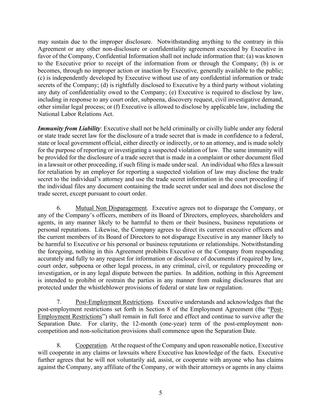 5 may sustain due to the improper disclosure. Notwithstanding anything to the contrary in this Agreement or any other non-disclosure or confidentiality agreement executed by Executive in favor of the Company, Confidential Information shall not include information that: (a) was known to the Executive prior to receipt of the information from or through the Company; (b) is or becomes, through no improper action or inaction by Executive, generally available to the public; (c) is independently developed by Executive without use of any confidential information or trade secrets of the Company; (d) is rightfully disclosed to Executive by a third party without violating any duty of confidentiality owed to the Company; (e) Executive is required to disclose by law, including in response to any court order, subpoena, discovery request, civil investigative demand, other similar legal process; or (f) Executive is allowed to disclose by applicable law, including the National Labor Relations Act. Immunity from Liability: Executive shall not be held criminally or civilly liable under any federal or state trade secret law for the disclosure of a trade secret that is made in confidence to a federal, state or local government official, either directly or indirectly, or to an attorney, and is made solely for the purpose of reporting or investigating a suspected violation of law. The same immunity will be provided for the disclosure of a trade secret that is made in a complaint or other document filed in a lawsuit or other proceeding, if such filing is made under seal. An individual who files a lawsuit for retaliation by an employer for reporting a suspected violation of law may disclose the trade secret to the individual’s attorney and use the trade secret information in the court proceeding if the individual files any document containing the trade secret under seal and does not disclose the trade secret, except pursuant to court order. 6. Mutual Non Disparagement. Executive agrees not to disparage the Company, or any of the Company’s officers, members of its Board of Directors, employees, shareholders and agents, in any manner likely to be harmful to them or their business, business reputations or personal reputations. Likewise, the Company agrees to direct its current executive officers and the current members of its Board of Directors to not disparage Executive in any manner likely to be harmful to Executive or his personal or business reputations or relationships. Notwithstanding the foregoing, nothing in this Agreement prohibits Executive or the Company from responding accurately and fully to any request for information or disclosure of documents if required by law, court order, subpoena or other legal process, in any criminal, civil, or regulatory proceeding or investigation, or in any legal dispute between the parties. In addition, nothing in this Agreement is intended to prohibit or restrain the parties in any manner from making disclosures that are protected under the whistleblower provisions of federal or state law or regulation. 7. Post-Employment Restrictions. Executive understands and acknowledges that the post-employment restrictions set forth in Section 8 of the Employment Agreement (the “Post- Employment Restrictions”) shall remain in full force and effect and continue to survive after the Separation Date. For clarity, the 12-month (one-year) term of the post-employment non- competition and non-solicitation provisions shall commence upon the Separation Date. 8. Cooperation. At the request of the Company and upon reasonable notice, Executive will cooperate in any claims or lawsuits where Executive has knowledge of the facts. Executive further agrees that he will not voluntarily aid, assist, or cooperate with anyone who has claims against the Company, any affiliate of the Company, or with their attorneys or agents in any claims