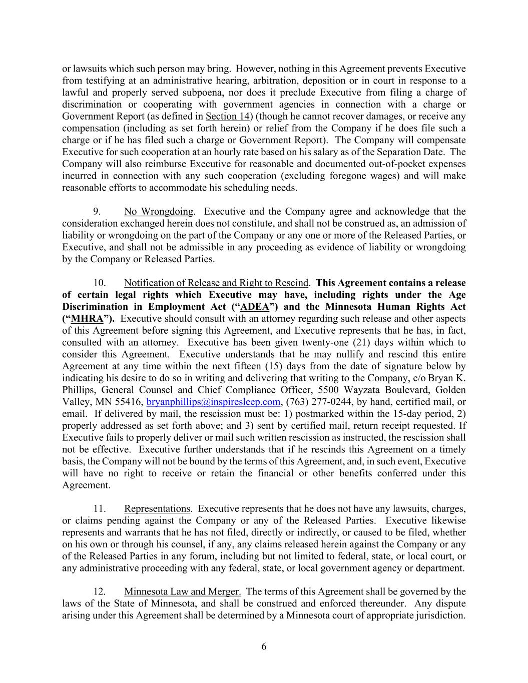 6 or lawsuits which such person may bring. However, nothing in this Agreement prevents Executive from testifying at an administrative hearing, arbitration, deposition or in court in response to a lawful and properly served subpoena, nor does it preclude Executive from filing a charge of discrimination or cooperating with government agencies in connection with a charge or Government Report (as defined in Section 14) (though he cannot recover damages, or receive any compensation (including as set forth herein) or relief from the Company if he does file such a charge or if he has filed such a charge or Government Report). The Company will compensate Executive for such cooperation at an hourly rate based on his salary as of the Separation Date. The Company will also reimburse Executive for reasonable and documented out-of-pocket expenses incurred in connection with any such cooperation (excluding foregone wages) and will make reasonable efforts to accommodate his scheduling needs. 9. No Wrongdoing. Executive and the Company agree and acknowledge that the consideration exchanged herein does not constitute, and shall not be construed as, an admission of liability or wrongdoing on the part of the Company or any one or more of the Released Parties, or Executive, and shall not be admissible in any proceeding as evidence of liability or wrongdoing by the Company or Released Parties. 10. Notification of Release and Right to Rescind. This Agreement contains a release of certain legal rights which Executive may have, including rights under the Age Discrimination in Employment Act (“ADEA”) and the Minnesota Human Rights Act (“MHRA”). Executive should consult with an attorney regarding such release and other aspects of this Agreement before signing this Agreement, and Executive represents that he has, in fact, consulted with an attorney. Executive has been given twenty-one (21) days within which to consider this Agreement. Executive understands that he may nullify and rescind this entire Agreement at any time within the next fifteen (15) days from the date of signature below by indicating his desire to do so in writing and delivering that writing to the Company, c/o Bryan K. Phillips, General Counsel and Chief Compliance Officer, 5500 Wayzata Boulevard, Golden Valley, MN 55416, bryanphillips@inspiresleep.com, (763) 277-0244, by hand, certified mail, or email. If delivered by mail, the rescission must be: 1) postmarked within the 15-day period, 2) properly addressed as set forth above; and 3) sent by certified mail, return receipt requested. If Executive fails to properly deliver or mail such written rescission as instructed, the rescission shall not be effective. Executive further understands that if he rescinds this Agreement on a timely basis, the Company will not be bound by the terms of this Agreement, and, in such event, Executive will have no right to receive or retain the financial or other benefits conferred under this Agreement. 11. Representations. Executive represents that he does not have any lawsuits, charges, or claims pending against the Company or any of the Released Parties. Executive likewise represents and warrants that he has not filed, directly or indirectly, or caused to be filed, whether on his own or through his counsel, if any, any claims released herein against the Company or any of the Released Parties in any forum, including but not limited to federal, state, or local court, or any administrative proceeding with any federal, state, or local government agency or department. 12. Minnesota Law and Merger. The terms of this Agreement shall be governed by the laws of the State of Minnesota, and shall be construed and enforced thereunder. Any dispute arising under this Agreement shall be determined by a Minnesota court of appropriate jurisdiction.
