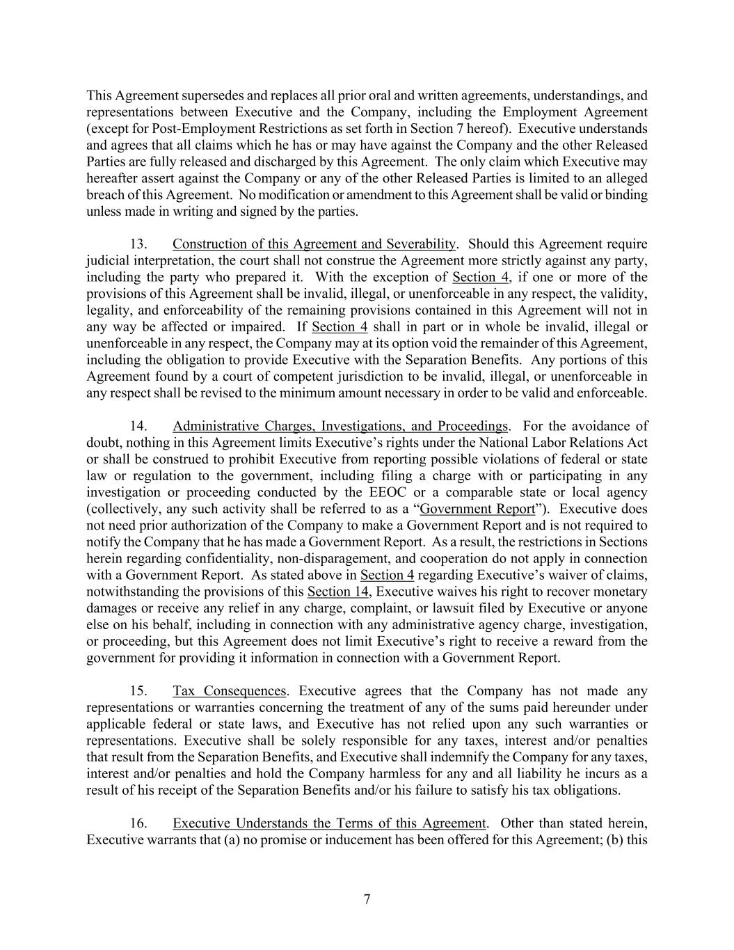 7 This Agreement supersedes and replaces all prior oral and written agreements, understandings, and representations between Executive and the Company, including the Employment Agreement (except for Post-Employment Restrictions as set forth in Section 7 hereof). Executive understands and agrees that all claims which he has or may have against the Company and the other Released Parties are fully released and discharged by this Agreement. The only claim which Executive may hereafter assert against the Company or any of the other Released Parties is limited to an alleged breach of this Agreement. No modification or amendment to this Agreement shall be valid or binding unless made in writing and signed by the parties. 13. Construction of this Agreement and Severability. Should this Agreement require judicial interpretation, the court shall not construe the Agreement more strictly against any party, including the party who prepared it. With the exception of Section 4, if one or more of the provisions of this Agreement shall be invalid, illegal, or unenforceable in any respect, the validity, legality, and enforceability of the remaining provisions contained in this Agreement will not in any way be affected or impaired. If Section 4 shall in part or in whole be invalid, illegal or unenforceable in any respect, the Company may at its option void the remainder of this Agreement, including the obligation to provide Executive with the Separation Benefits. Any portions of this Agreement found by a court of competent jurisdiction to be invalid, illegal, or unenforceable in any respect shall be revised to the minimum amount necessary in order to be valid and enforceable. 14. Administrative Charges, Investigations, and Proceedings. For the avoidance of doubt, nothing in this Agreement limits Executive’s rights under the National Labor Relations Act or shall be construed to prohibit Executive from reporting possible violations of federal or state law or regulation to the government, including filing a charge with or participating in any investigation or proceeding conducted by the EEOC or a comparable state or local agency (collectively, any such activity shall be referred to as a “Government Report”). Executive does not need prior authorization of the Company to make a Government Report and is not required to notify the Company that he has made a Government Report. As a result, the restrictions in Sections herein regarding confidentiality, non-disparagement, and cooperation do not apply in connection with a Government Report. As stated above in Section 4 regarding Executive’s waiver of claims, notwithstanding the provisions of this Section 14, Executive waives his right to recover monetary damages or receive any relief in any charge, complaint, or lawsuit filed by Executive or anyone else on his behalf, including in connection with any administrative agency charge, investigation, or proceeding, but this Agreement does not limit Executive’s right to receive a reward from the government for providing it information in connection with a Government Report. 15. Tax Consequences. Executive agrees that the Company has not made any representations or warranties concerning the treatment of any of the sums paid hereunder under applicable federal or state laws, and Executive has not relied upon any such warranties or representations. Executive shall be solely responsible for any taxes, interest and/or penalties that result from the Separation Benefits, and Executive shall indemnify the Company for any taxes, interest and/or penalties and hold the Company harmless for any and all liability he incurs as a result of his receipt of the Separation Benefits and/or his failure to satisfy his tax obligations. 16. Executive Understands the Terms of this Agreement. Other than stated herein, Executive warrants that (a) no promise or inducement has been offered for this Agreement; (b) this