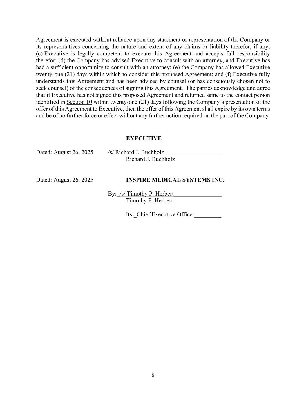 8 Agreement is executed without reliance upon any statement or representation of the Company or its representatives concerning the nature and extent of any claims or liability therefor, if any; (c) Executive is legally competent to execute this Agreement and accepts full responsibility therefor; (d) the Company has advised Executive to consult with an attorney, and Executive has had a sufficient opportunity to consult with an attorney; (e) the Company has allowed Executive twenty-one (21) days within which to consider this proposed Agreement; and (f) Executive fully understands this Agreement and has been advised by counsel (or has consciously chosen not to seek counsel) of the consequences of signing this Agreement. The parties acknowledge and agree that if Executive has not signed this proposed Agreement and returned same to the contact person identified in Section 10 within twenty-one (21) days following the Company’s presentation of the offer of this Agreement to Executive, then the offer of this Agreement shall expire by its own terms and be of no further force or effect without any further action required on the part of the Company. EXECUTIVE Dated: August 26, 2025 /s/ Richard J. Buchholz___________________ Richard J. Buchholz Dated: August 26, 2025 INSPIRE MEDICAL SYSTEMS INC. By:_/s/ Timothy P. Herbert________________ Timothy P. Herbert Its:_Chief Executive Officer_________