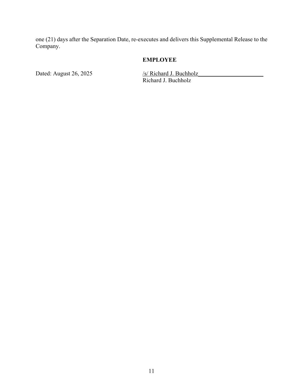 11 one (21) days after the Separation Date, re-executes and delivers this Supplemental Release to the Company. EMPLOYEE Dated: August 26, 2025 /s/ Richard J. Buchholz______________________ Richard J. Buchholz