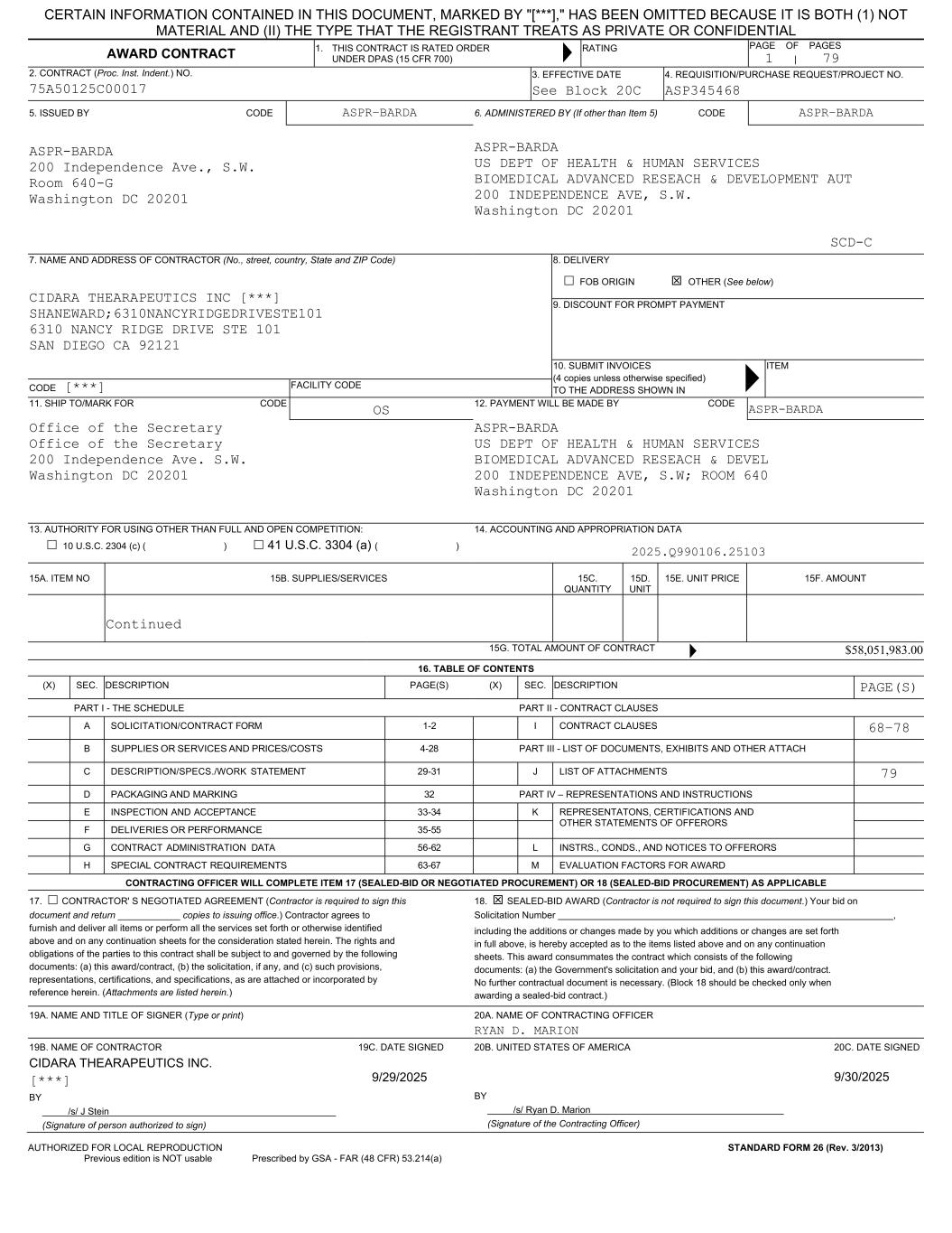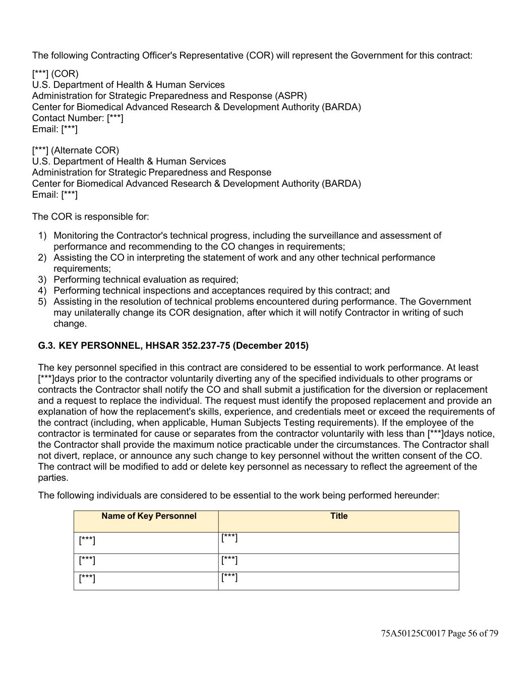 75A50125C0017 Page 56 of 79 The following Contracting Officer's Representative (COR) will represent the Government for this contract: [***] (COR) U.S. Department of Health & Human Services Administration for Strategic Preparedness and Response (ASPR) Center for Biomedical Advanced Research & Development Authority (BARDA) Contact Number: [***] Email: [***] [***] (Alternate COR) U.S. Department of Health & Human Services Administration for Strategic Preparedness and Response Center for Biomedical Advanced Research & Development Authority (BARDA) Email: [***] The COR is responsible for: 1) Monitoring the Contractor's technical progress, including the surveillance and assessment of performance and recommending to the CO changes in requirements; 2) Assisting the CO in interpreting the statement of work and any other technical performance requirements; 3) Performing technical evaluation as required; 4) Performing technical inspections and acceptances required by this contract; and 5) Assisting in the resolution of technical problems encountered during performance. The Government may unilaterally change its COR designation, after which it will notify Contractor in writing of such change. G.3. KEY PERSONNEL, HHSAR 352.237-75 (December 2015) The key personnel specified in this contract are considered to be essential to work performance. At least [***]days prior to the contractor voluntarily diverting any of the specified individuals to other programs or contracts the Contractor shall notify the CO and shall submit a justification for the diversion or replacement and a request to replace the individual. The request must identify the proposed replacement and provide an explanation of how the replacement's skills, experience, and credentials meet or exceed the requirements of the contract (including, when applicable, Human Subjects Testing requirements). If the employee of the contractor is terminated for cause or separates from the contractor voluntarily with less than [***]days notice, the Contractor shall provide the maximum notice practicable under the circumstances. The Contractor shall not divert, replace, or announce any such change to key personnel without the written consent of the CO. The contract will be modified to add or delete key personnel as necessary to reflect the agreement of the parties. The following individuals are considered to be essential to the work being performed hereunder: Name of Key Personnel Title [***] [***] [***] [***] [***] [***]