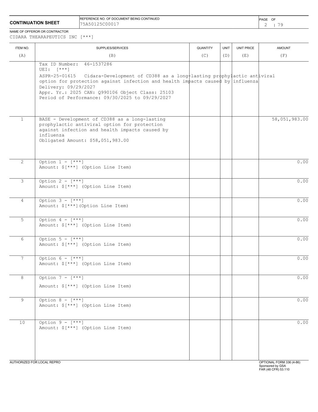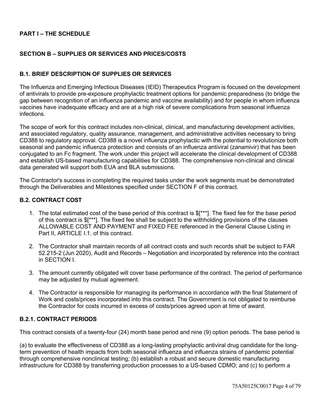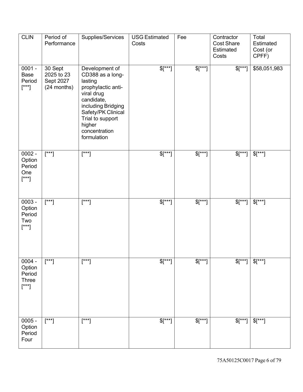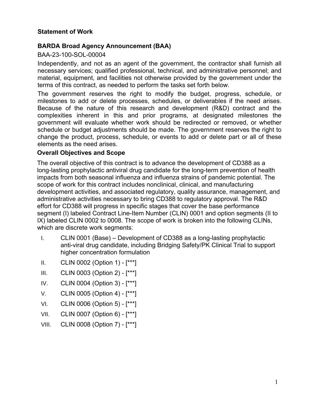 1 Statement of Work BARDA Broad Agency Announcement (BAA) BAA-23-100-SOL-00004 Independently, and not as an agent of the government, the contractor shall furnish all necessary services; qualified professional, technical, and administrative personnel; and material, equipment, and facilities not otherwise provided by the government under the terms of this contract, as needed to perform the tasks set forth below. The government reserves the right to modify the budget, progress, schedule, or milestones to add or delete processes, schedules, or deliverables if the need arises. Because of the nature of this research and development (R&D) contract and the complexities inherent in this and prior programs, at designated milestones the government will evaluate whether work should be redirected or removed, or whether schedule or budget adjustments should be made. The government reserves the right to change the product, process, schedule, or events to add or delete part or all of these elements as the need arises. Overall Objectives and Scope The overall objective of this contract is to advance the development of CD388 as a long-lasting prophylactic antiviral drug candidate for the long-term prevention of health impacts from both seasonal influenza and influenza strains of pandemic potential. The scope of work for this contract includes nonclinical, clinical, and manufacturing development activities, and associated regulatory, quality assurance, management, and administrative activities necessary to bring CD388 to regulatory approval. The R&D effort for CD388 will progress in specific stages that cover the base performance segment (I) labeled Contract Line-Item Number (CLIN) 0001 and option segments (II to IX) labeled CLIN 0002 to 0008. The scope of work is broken into the following CLINs, which are discrete work segments: I. CLIN 0001 (Base) – Development of CD388 as a long-lasting prophylactic anti-viral drug candidate, including Bridging Safety/PK Clinical Trial to support higher concentration formulation II. CLIN 0002 (Option 1) - [***] III. CLIN 0003 (Option 2) - [***] IV. CLIN 0004 (Option 3) - [***] V. CLIN 0005 (Option 4) - [***] VI. CLIN 0006 (Option 5) - [***] VII. CLIN 0007 (Option 6) - [***] VIII. CLIN 0008 (Option 7) - [***]