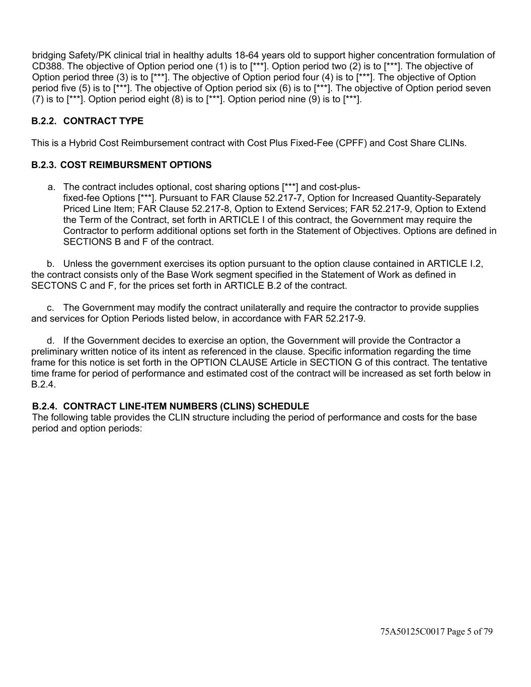 7 2. PHASE II: (CLIN 0002 – Option 1) [***]. The contractor shall perform the following tasks and subtasks in accordance with the agreed upon IMS and IMP (defined in 1.1.8 and 1.1.9, respectively), which shall further detail the conduct of the specific tasks and subtasks. 2.1. Program Management (WBS 2.1) – Consistent with section 1.1 2.2. Nonclinical Toxicology (WBS 2.2) – RESERVED 2.3. Nonclinical Studies (WBS 2.3) – RESERVED 2.4 Clinical Studies (WBS 2.4) - [***] 2.4.1 [***]. 2.4.2. [***]. 2.4.3. [***]. 2.5. Regulatory (WBS 2.5) 2.5.1. [***]. 2.5.2. [***]. 3. PHASE III: (CLIN 0003 - Option 2) [***] The contractor shall perform the following tasks and subtasks in accordance with the agreed upon IMS and IMP (defined in 1.1.8 and 1.1.9, respectively), further detail the conduct of the specific tasks and subtasks. 3.1 Program Management (WBS 3.1) – Consistent with section 1.1 3.2. Nonclinical Toxicology (WBS 3.2) – RESERVED 3.3 Nonclinical Studies (WBS 3.3) – RESERVED 3.4. Clinical Studies (WBS 3.4) - [***] [***]. 3.4.1. [***]. 3.4.3 [***]. 3.5. Regulatory (WBS 3.5) 3.5.1. [***]. 3.5.2. [***]. 3.6. CMC (WBS 3.6) 3.6.1. [***]. CLIN 0003 Objective: [***]. CLIN 0003 Deliverable: [***]. CLIN 0003 Go/No-Go: [***]. 4. PHASE IV: (CLIN 0004 - Option 3) [***] The contractor shall perform the following tasks and subtasks in accordance with the agreed upon IMS and IMP (defined in 1.1.8 and 1.1.9, respectively), further detail the