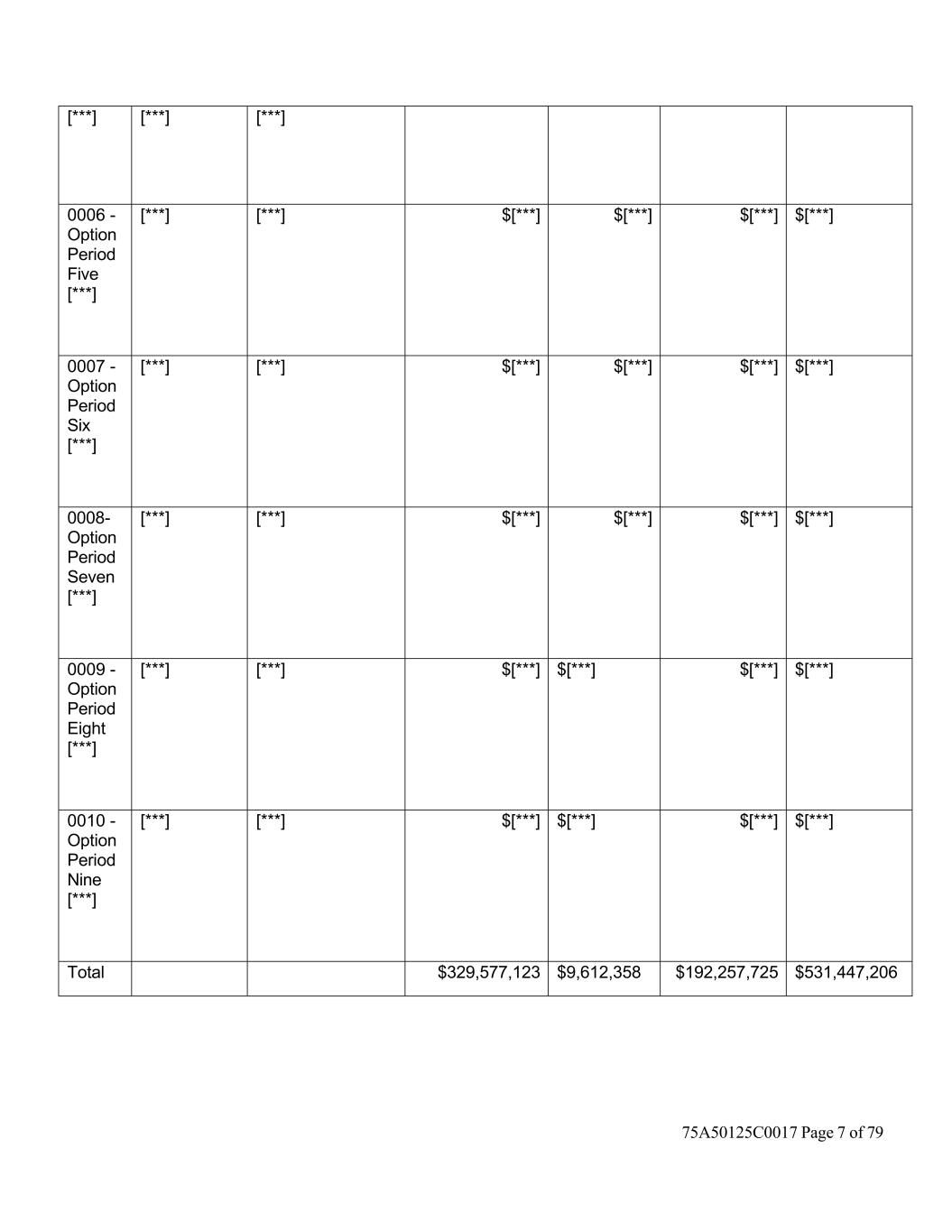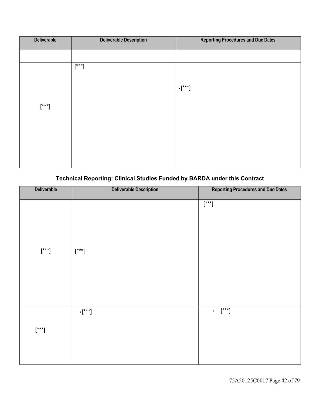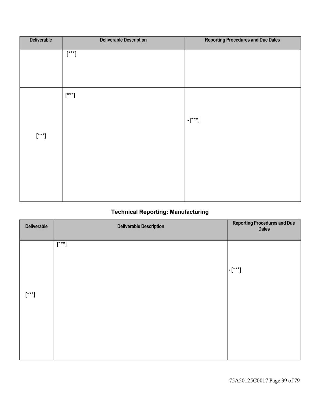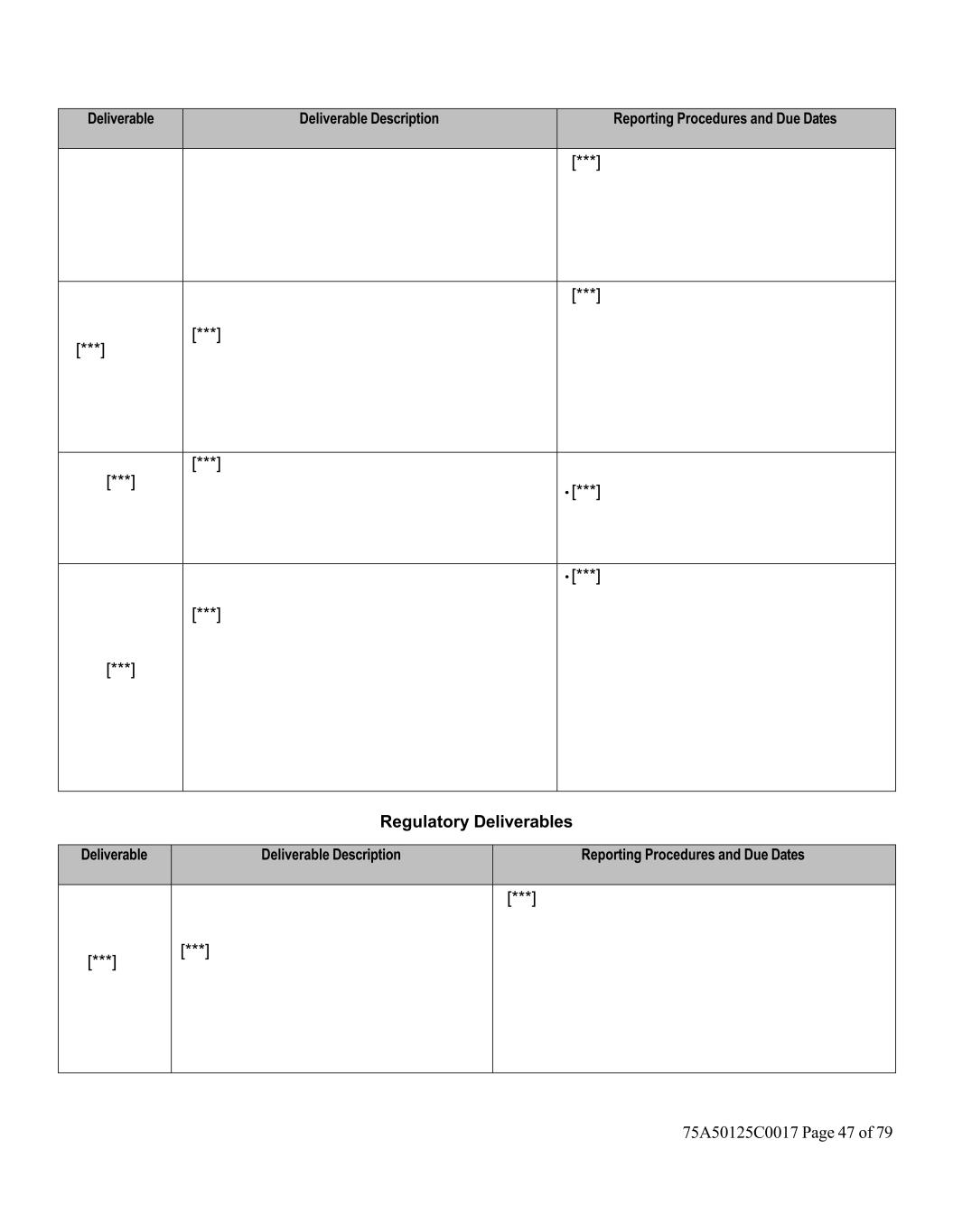 75A50125C0017 Page 47 of 79 Deliverable Deliverable Description Reporting Procedures and Due Dates [***] [***] [***] [***] [***] [***] • [***] [***] [***] • [***] Regulatory Deliverables Deliverable Deliverable Description Reporting Procedures and Due Dates [***] [***] [***]
