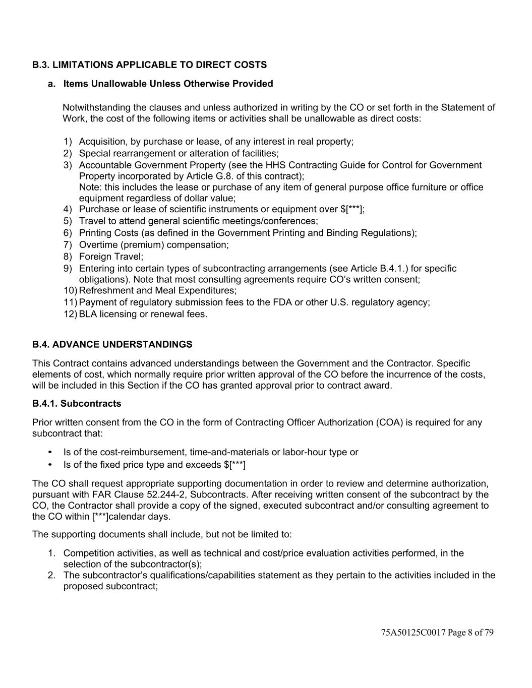 75A50125C0017 Page 60 of 79 If applicable, the Contractor shall convert any foreign currency amount(s) in the monthly invoice to U.S. dollars each month, on the [***], using the foreign exchange rate index published on www.federalreserve.gov. Payment of invoices is subject to the U.S. dollar limits within the Total Costs of CLIN 0001 in SECTION B of the contract. The Government may request additional information (timecards, receipts, etc.) to support costs claimed in the Contractor’s invoices. Incomplete invoices may be suspended by the CO if the Contractor’s claimed costs cannot be substantiated. G.5. REIMBURSEMENT OF COST (Does not apply to Fixed Unit Priced Items) The Government shall reimburse the Contractor the cost determined by the CO to be allowable (hereinafter referred to as allowable cost) in accordance with FAR Clause 52.216-7, Allowable Cost and Payment incorporated by reference in SECTION I, Contract Clauses, of this contract, and FAR Subpart 31.2. Examples of allowable costs include, but are not limited to, the following: a) All direct materials and supplies that are used in performing the work provided for under the contract, including those purchased for subcontracts and purchase orders. b) All direct labor, including supervisory, that is properly chargeable directly to the contract, plus fringe benefits. c) All other items of cost budgeted for and accepted in the negotiation of this basic contract or modifications thereto. d) Travel costs including per diem or actual subsistence for personnel while in an actual travel status in direct performance of the work and services required under this contract subject to the following: (i) Air travel shall be by the most direct route using “air coach” or “air tourist” (less than first class) unless it is clearly unreasonable or impractical (e.g., not available for reasons other than avoidable delay in making reservations, would require circuitous routing or entail additional expense offsetting the savings on fare, or would not make necessary connections). (ii) Rail travel shall be by the most direct route, first class with lower berth or nearest equivalent. (iii) Costs incurred for lodging, meals, and incidental expenses shall be considered reasonable and allowable to the extent that they do not exceed on a daily basis the per diem rates set forth in the Federal Travel Regulation (FTR). (iv) Travel via privately owned automobile shall be reimbursed at not more than the current General Services Administration (GSA) FTR established mileage rate. G.5.1 NEGOTIATED INDIRECT RATES AND CEILING Pending the establishment of final indirect cost rates, which shall be determined based on audit of actual costs as provided in Subpart 42.7 of the Federal Acquisition Regulation, the Contractor shall be reimbursed for allowable indirect costs at the agreed upon provisional billing rates. The Contractor's audited final indirect costs are allowable, to the extent that they do not lead the Contractor to exceed the total estimated costs for performance of the contract awarded, or the Ceiling Rates established under this contract. The Contractor is also directed to the requirement to provide the Government with notice, that actual costs are expected to