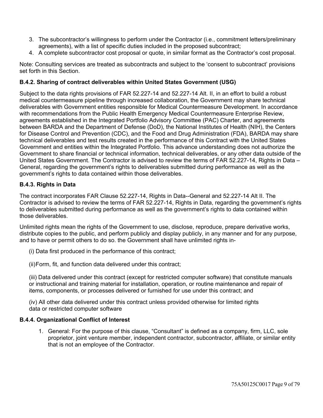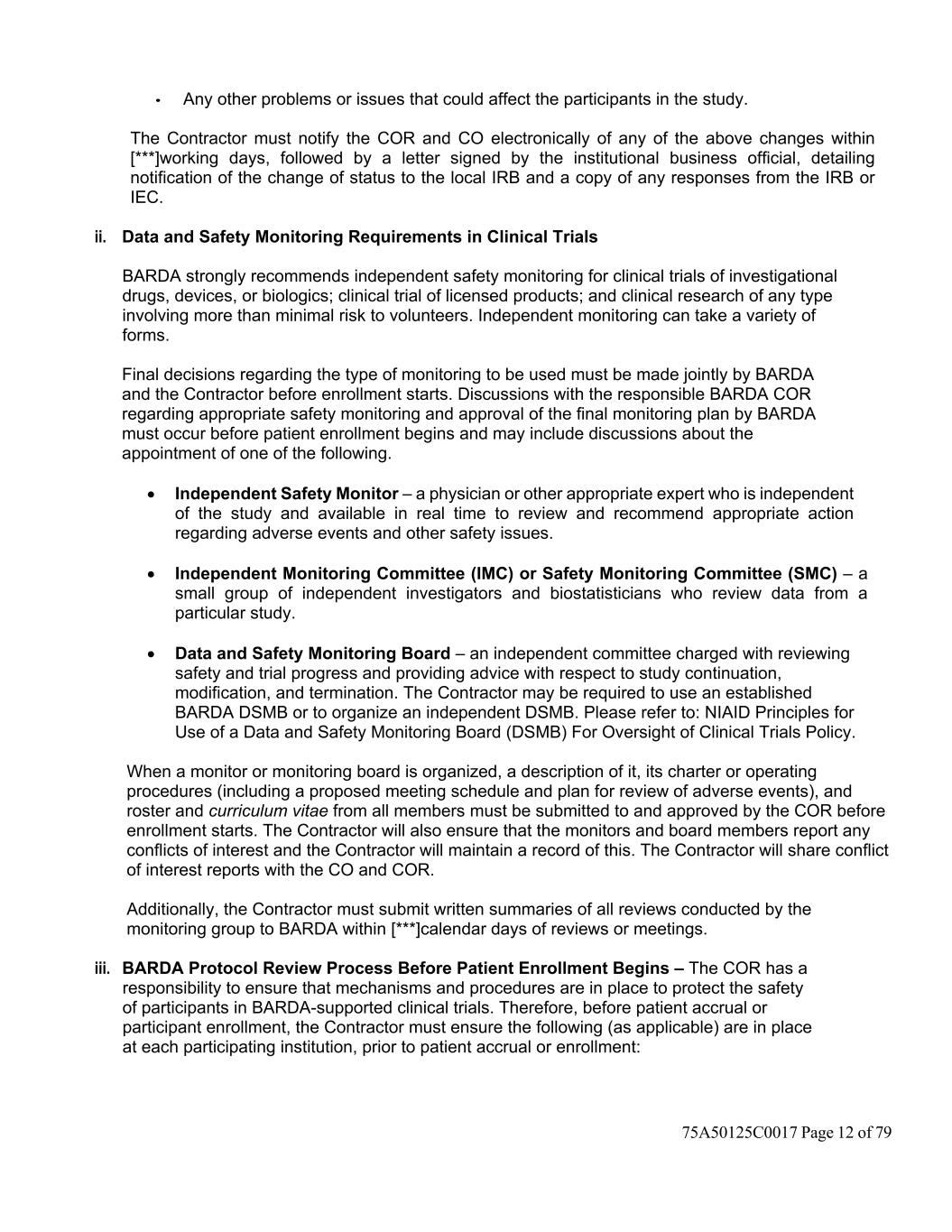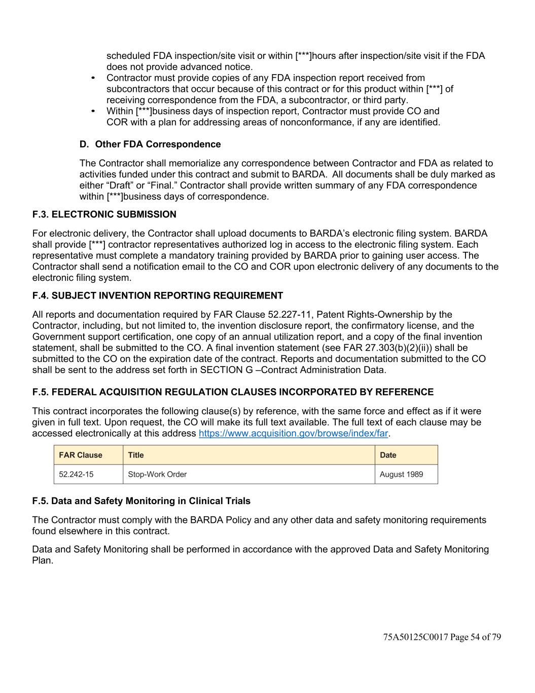 75A50125C0017 Page 54 of 79 scheduled FDA inspection/site visit or within [***]hours after inspection/site visit if the FDA does not provide advanced notice. • Contractor must provide copies of any FDA inspection report received from subcontractors that occur because of this contract or for this product within [***] of receiving correspondence from the FDA, a subcontractor, or third party. • Within [***]business days of inspection report, Contractor must provide CO and COR with a plan for addressing areas of nonconformance, if any are identified. D. Other FDA Correspondence The Contractor shall memorialize any correspondence between Contractor and FDA as related to activities funded under this contract and submit to BARDA. All documents shall be duly marked as either “Draft” or “Final.” Contractor shall provide written summary of any FDA correspondence within [***]business days of correspondence. F.3. ELECTRONIC SUBMISSION For electronic delivery, the Contractor shall upload documents to BARDA’s electronic filing system. BARDA shall provide [***] contractor representatives authorized log in access to the electronic filing system. Each representative must complete a mandatory training provided by BARDA prior to gaining user access. The Contractor shall send a notification email to the CO and COR upon electronic delivery of any documents to the electronic filing system. F.4. SUBJECT INVENTION REPORTING REQUIREMENT All reports and documentation required by FAR Clause 52.227-11, Patent Rights-Ownership by the Contractor, including, but not limited to, the invention disclosure report, the confirmatory license, and the Government support certification, one copy of an annual utilization report, and a copy of the final invention statement, shall be submitted to the CO. A final invention statement (see FAR 27.303(b)(2)(ii)) shall be submitted to the CO on the expiration date of the contract. Reports and documentation submitted to the CO shall be sent to the address set forth in SECTION G –Contract Administration Data. F.5. FEDERAL ACQUISITION REGULATION CLAUSES INCORPORATED BY REFERENCE This contract incorporates the following clause(s) by reference, with the same force and effect as if it were given in full text. Upon request, the CO will make its full text available. The full text of each clause may be accessed electronically at this address https://www.acquisition.gov/browse/index/far. FAR Clause Title Date 52.242-15 Stop-Work Order August 1989 F.5. Data and Safety Monitoring in Clinical Trials The Contractor must comply with the BARDA Policy and any other data and safety monitoring requirements found elsewhere in this contract. Data and Safety Monitoring shall be performed in accordance with the approved Data and Safety Monitoring Plan.