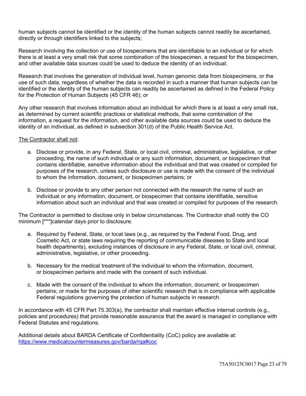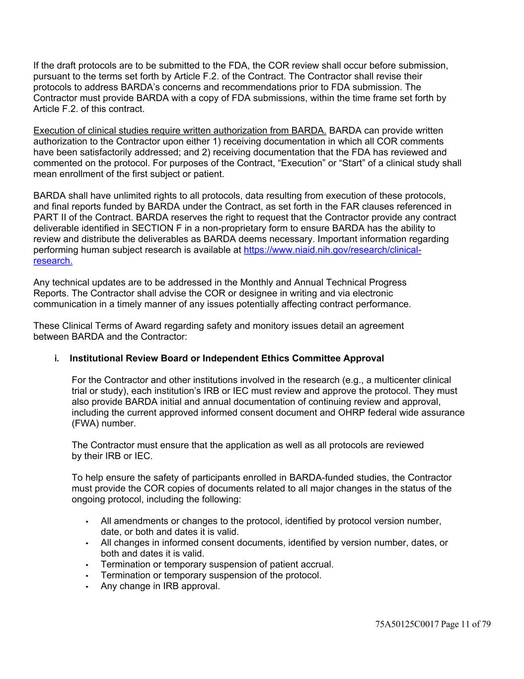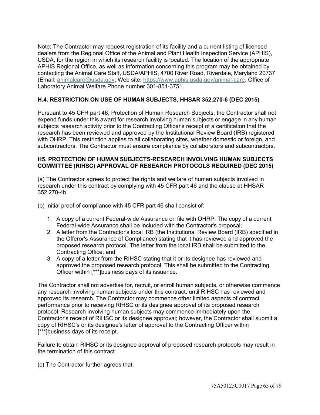 75A50125C0017 Page 65 of 79 Note: The Contractor may request registration of its facility and a current listing of licensed dealers from the Regional Office of the Animal and Plant Health Inspection Service (APHIS), USDA, for the region in which its research facility is located. The location of the appropriate APHIS Regional Office, as well as information concerning this program may be obtained by contacting the Animal Care Staff, USDA/APHIS, 4700 River Road, Riverdale, Maryland 20737 (Email: animalcare@usda.gov; Web site: https://www.aphis.usda.gov/animal-care. Office of Laboratory Animal Welfare Phone number 301-851-3751. H.4. RESTRICTION ON USE OF HUMAN SUBJECTS, HHSAR 352.270-6 (DEC 2015) Pursuant to 45 CFR part 46, Protection of Human Research Subjects, the Contractor shall not expend funds under this award for research involving human subjects or engage in any human subjects research activity prior to the Contracting Officer's receipt of a certification that the research has been reviewed and approved by the Institutional Review Board (IRB) registered with OHRP. This restriction applies to all collaborating sites, whether domestic or foreign, and subcontractors. The Contractor must ensure compliance by collaborators and subcontractors. H5. PROTECTION OF HUMAN SUBJECTS-RESEARCH INVOLVING HUMAN SUBJECTS COMMITTEE (RIHSC) APPROVAL OF RESEARCH PROTOCOLS REQUIRED (DEC 2015) (a) The Contractor agrees to protect the rights and welfare of human subjects involved in research under this contract by complying with 45 CFR part 46 and the clause at HHSAR 352.270-4b. (b) Initial proof of compliance with 45 CFR part 46 shall consist of: 1. A copy of a current Federal-wide Assurance on file with OHRP. The copy of a current Federal-wide Assurance shall be included with the Contractor's proposal; 2. A letter from the Contractor's local IRB (the Institutional Review Board (IRB) specified in the Offeror's Assurance of Compliance) stating that it has reviewed and approved the proposed research protocol. The letter from the local IRB shall be submitted to the Contracting Office; and 3. A copy of a letter from the RIHSC stating that it or its designee has reviewed and approved the proposed research protocol. This shall be submitted to the Contracting Officer within [***]business days of its issuance. The Contractor shall not advertise for, recruit, or enroll human subjects, or otherwise commence any research involving human subjects under this contract, until RIHSC has reviewed and approved its research. The Contractor may commence other limited aspects of contract performance prior to receiving RIHSC or its designee approval of its proposed research protocol. Research involving human subjects may commence immediately upon the Contractor's receipt of RIHSC or its designee approval; however, the Contractor shall submit a copy of RIHSC's or its designee's letter of approval to the Contracting Officer within [***]business days of its receipt. Failure to obtain RIHSC or its designee approval of proposed research protocols may result in the termination of this contract. (c) The Contractor further agrees that: