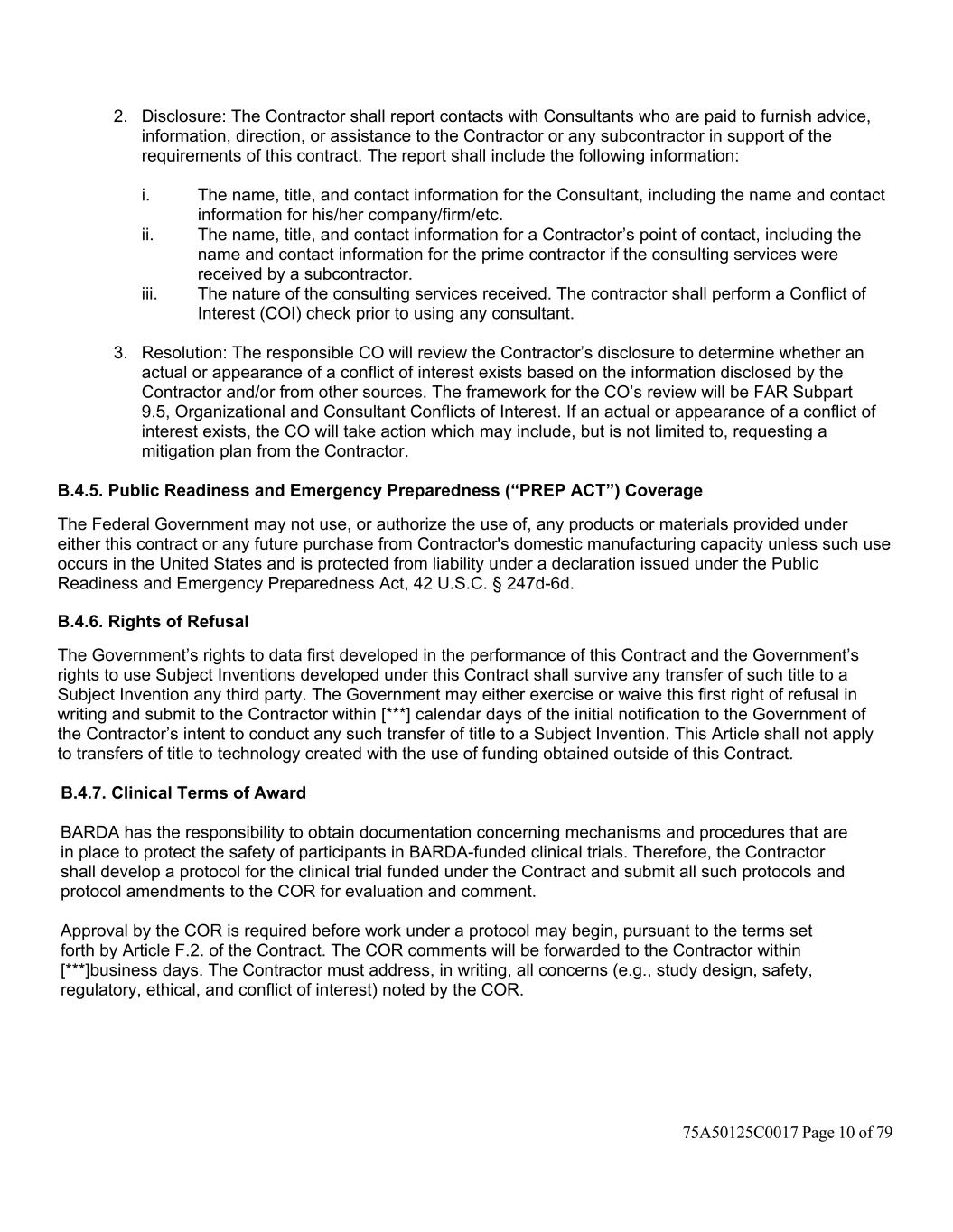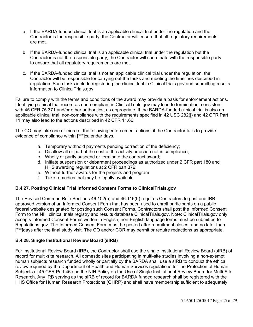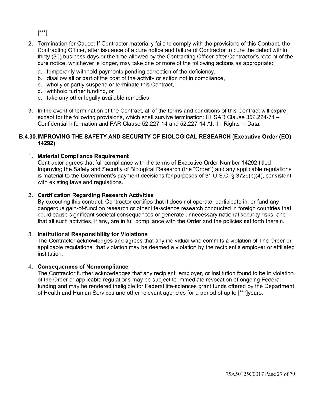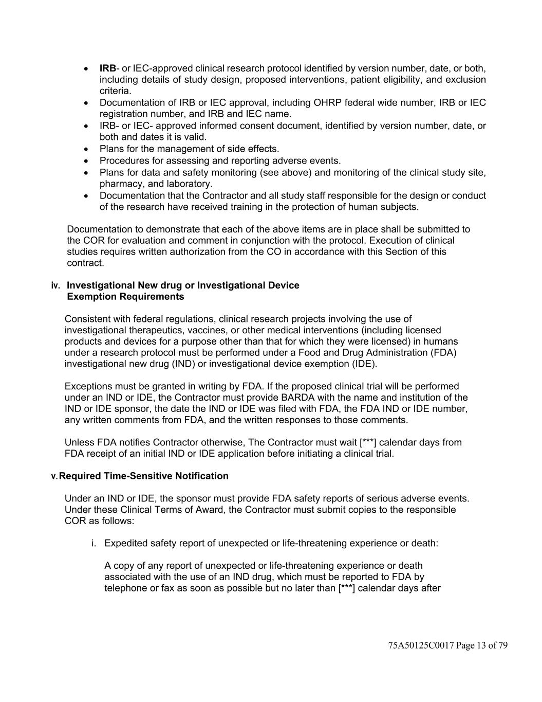 75A50125C0017 Page 65 of 79 Note: The Contractor may request registration of its facility and a current listing of licensed dealers from the Regional Office of the Animal and Plant Health Inspection Service (APHIS), USDA, for the region in which its research facility is located. The location of the appropriate APHIS Regional Office, as well as information concerning this program may be obtained by contacting the Animal Care Staff, USDA/APHIS, 4700 River Road, Riverdale, Maryland 20737 (Email: animalcare@usda.gov; Web site: https://www.aphis.usda.gov/animal-care. Office of Laboratory Animal Welfare Phone number 301-851-3751. H.4. RESTRICTION ON USE OF HUMAN SUBJECTS, HHSAR 352.270-6 (DEC 2015) Pursuant to 45 CFR part 46, Protection of Human Research Subjects, the Contractor shall not expend funds under this award for research involving human subjects or engage in any human subjects research activity prior to the Contracting Officer's receipt of a certification that the research has been reviewed and approved by the Institutional Review Board (IRB) registered with OHRP. This restriction applies to all collaborating sites, whether domestic or foreign, and subcontractors. The Contractor must ensure compliance by collaborators and subcontractors. H5. PROTECTION OF HUMAN SUBJECTS-RESEARCH INVOLVING HUMAN SUBJECTS COMMITTEE (RIHSC) APPROVAL OF RESEARCH PROTOCOLS REQUIRED (DEC 2015) (a) The Contractor agrees to protect the rights and welfare of human subjects involved in research under this contract by complying with 45 CFR part 46 and the clause at HHSAR 352.270-4b. (b) Initial proof of compliance with 45 CFR part 46 shall consist of: 1. A copy of a current Federal-wide Assurance on file with OHRP. The copy of a current Federal-wide Assurance shall be included with the Contractor's proposal; 2. A letter from the Contractor's local IRB (the Institutional Review Board (IRB) specified in the Offeror's Assurance of Compliance) stating that it has reviewed and approved the proposed research protocol. The letter from the local IRB shall be submitted to the Contracting Office; and 3. A copy of a letter from the RIHSC stating that it or its designee has reviewed and approved the proposed research protocol. This shall be submitted to the Contracting Officer within [***]business days of its issuance. The Contractor shall not advertise for, recruit, or enroll human subjects, or otherwise commence any research involving human subjects under this contract, until RIHSC has reviewed and approved its research. The Contractor may commence other limited aspects of contract performance prior to receiving RIHSC or its designee approval of its proposed research protocol. Research involving human subjects may commence immediately upon the Contractor's receipt of RIHSC or its designee approval; however, the Contractor shall submit a copy of RIHSC's or its designee's letter of approval to the Contracting Officer within [***]business days of its receipt. Failure to obtain RIHSC or its designee approval of proposed research protocols may result in the termination of this contract. (c) The Contractor further agrees that: