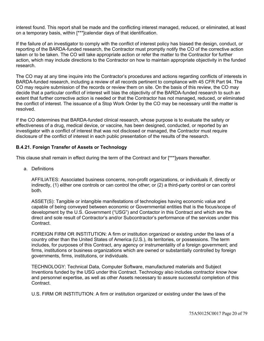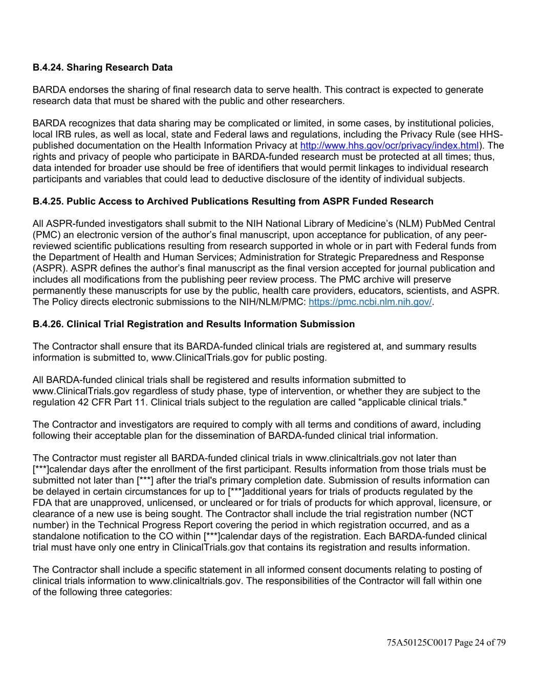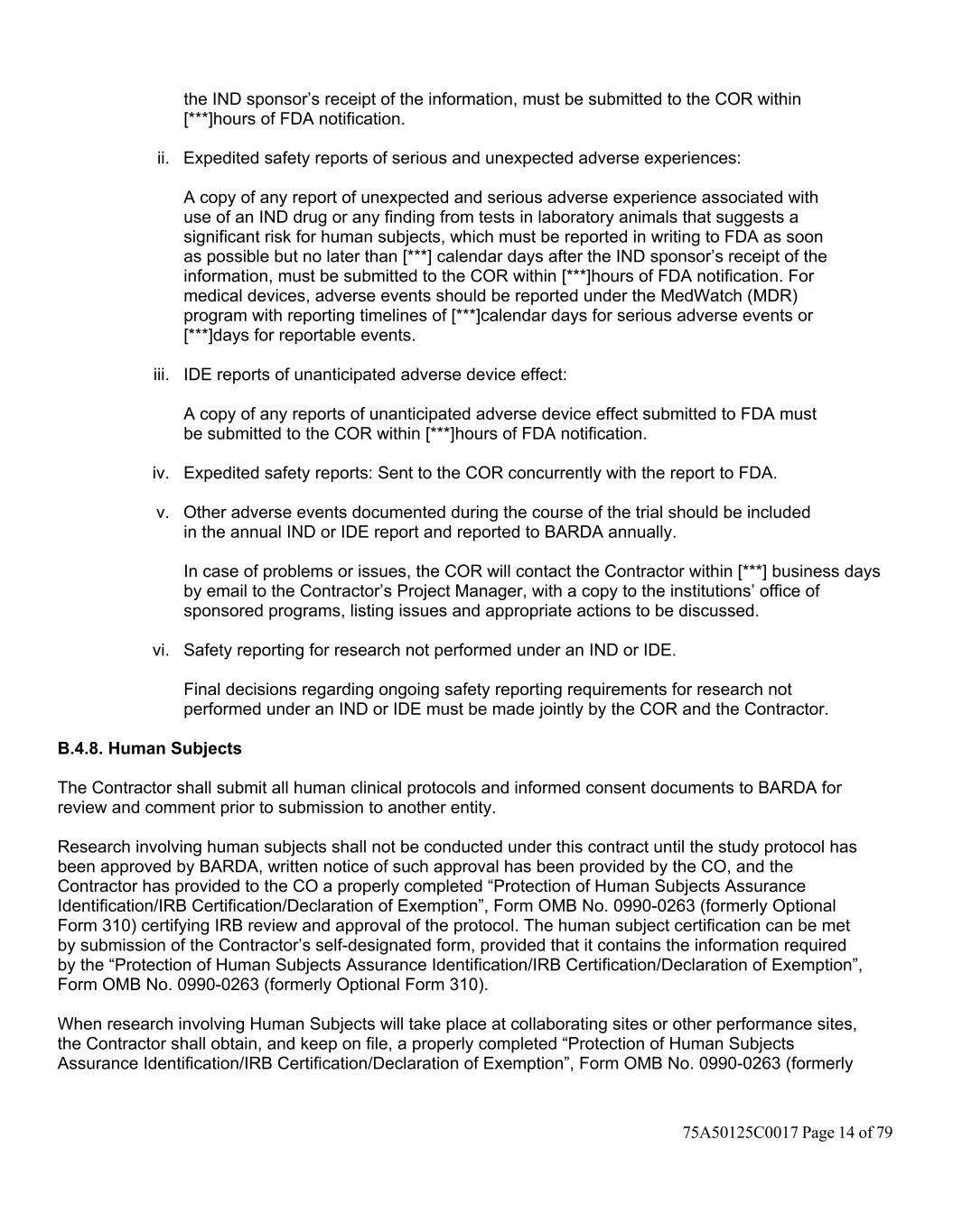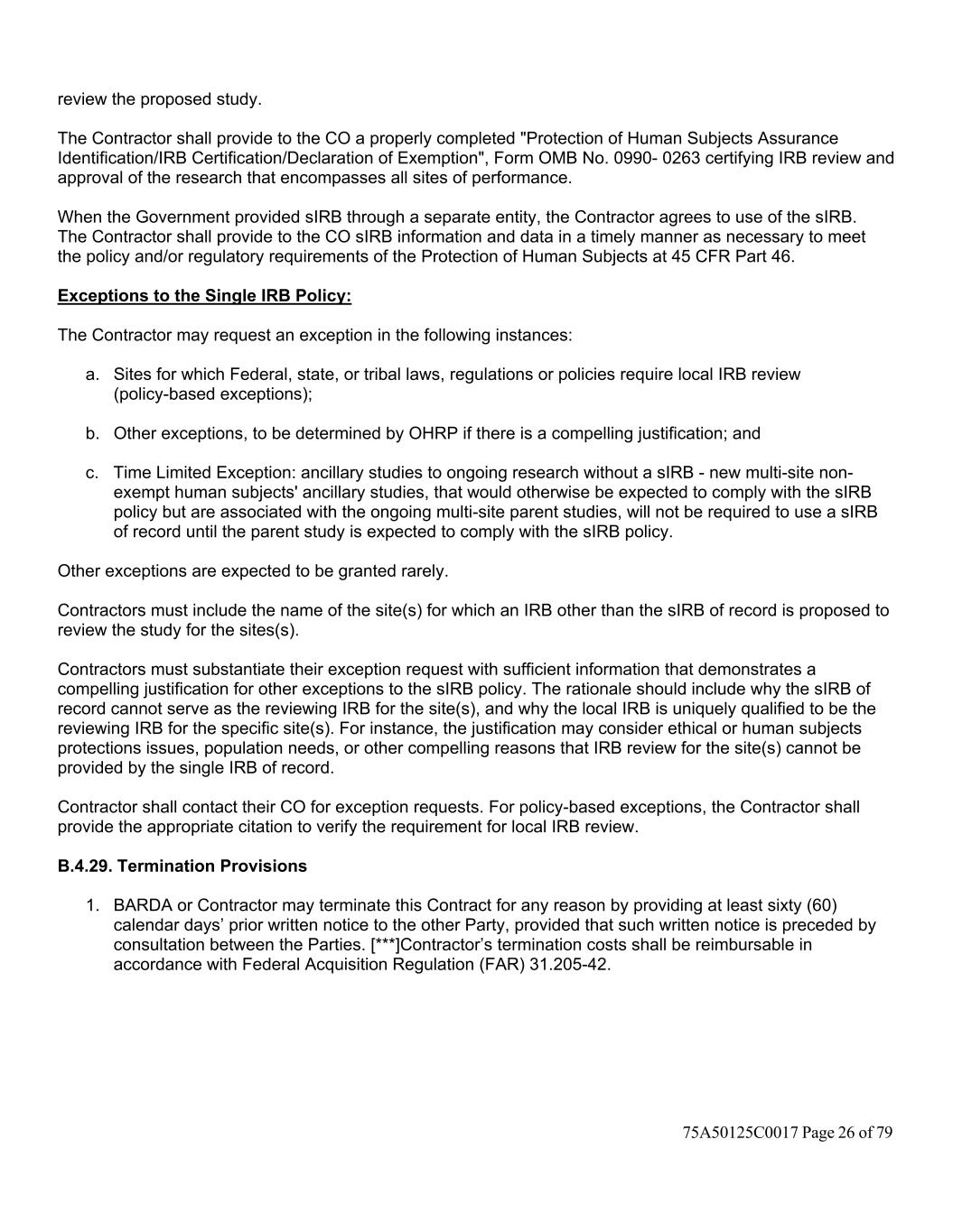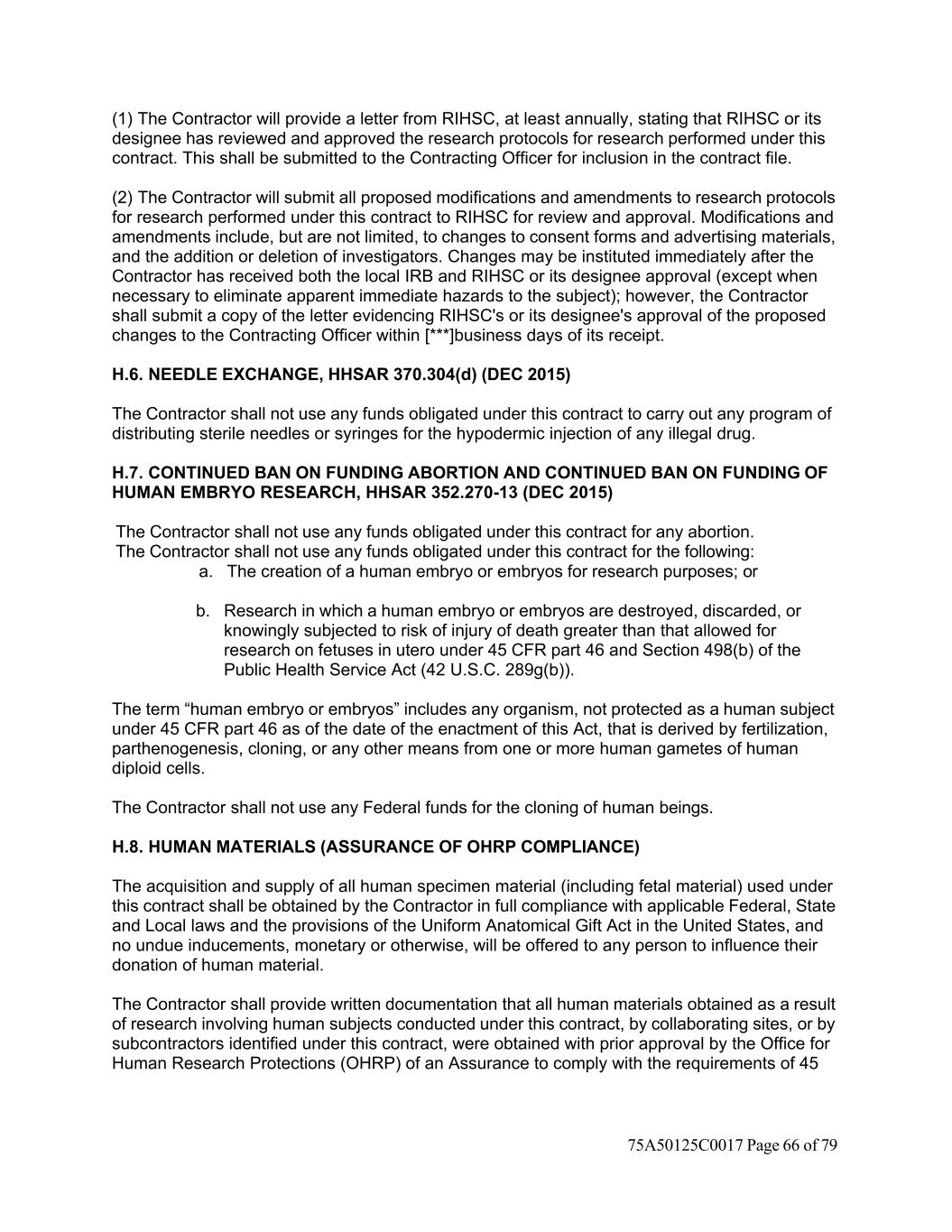 75A50125C0017 Page 66 of 79 (1) The Contractor will provide a letter from RIHSC, at least annually, stating that RIHSC or its designee has reviewed and approved the research protocols for research performed under this contract. This shall be submitted to the Contracting Officer for inclusion in the contract file. (2) The Contractor will submit all proposed modifications and amendments to research protocols for research performed under this contract to RIHSC for review and approval. Modifications and amendments include, but are not limited, to changes to consent forms and advertising materials, and the addition or deletion of investigators. Changes may be instituted immediately after the Contractor has received both the local IRB and RIHSC or its designee approval (except when necessary to eliminate apparent immediate hazards to the subject); however, the Contractor shall submit a copy of the letter evidencing RIHSC's or its designee's approval of the proposed changes to the Contracting Officer within [***]business days of its receipt. H.6. NEEDLE EXCHANGE, HHSAR 370.304(d) (DEC 2015) The Contractor shall not use any funds obligated under this contract to carry out any program of distributing sterile needles or syringes for the hypodermic injection of any illegal drug. H.7. CONTINUED BAN ON FUNDING ABORTION AND CONTINUED BAN ON FUNDING OF HUMAN EMBRYO RESEARCH, HHSAR 352.270-13 (DEC 2015) The Contractor shall not use any funds obligated under this contract for any abortion. The Contractor shall not use any funds obligated under this contract for the following: a. The creation of a human embryo or embryos for research purposes; or b. Research in which a human embryo or embryos are destroyed, discarded, or knowingly subjected to risk of injury of death greater than that allowed for research on fetuses in utero under 45 CFR part 46 and Section 498(b) of the Public Health Service Act (42 U.S.C. 289g(b)). The term “human embryo or embryos” includes any organism, not protected as a human subject under 45 CFR part 46 as of the date of the enactment of this Act, that is derived by fertilization, parthenogenesis, cloning, or any other means from one or more human gametes of human diploid cells. The Contractor shall not use any Federal funds for the cloning of human beings. H.8. HUMAN MATERIALS (ASSURANCE OF OHRP COMPLIANCE) The acquisition and supply of all human specimen material (including fetal material) used under this contract shall be obtained by the Contractor in full compliance with applicable Federal, State and Local laws and the provisions of the Uniform Anatomical Gift Act in the United States, and no undue inducements, monetary or otherwise, will be offered to any person to influence their donation of human material. The Contractor shall provide written documentation that all human materials obtained as a result of research involving human subjects conducted under this contract, by collaborating sites, or by subcontractors identified under this contract, were obtained with prior approval by the Office for Human Research Protections (OHRP) of an Assurance to comply with the requirements of 45