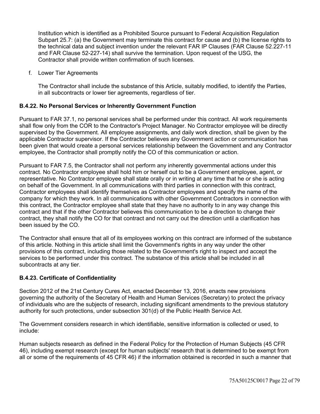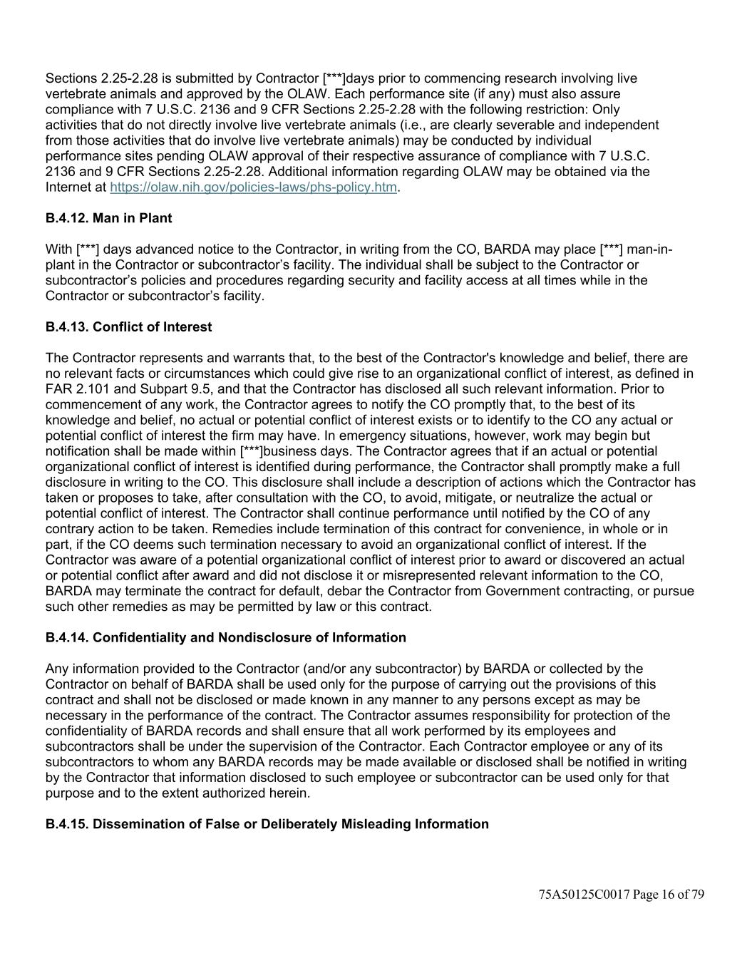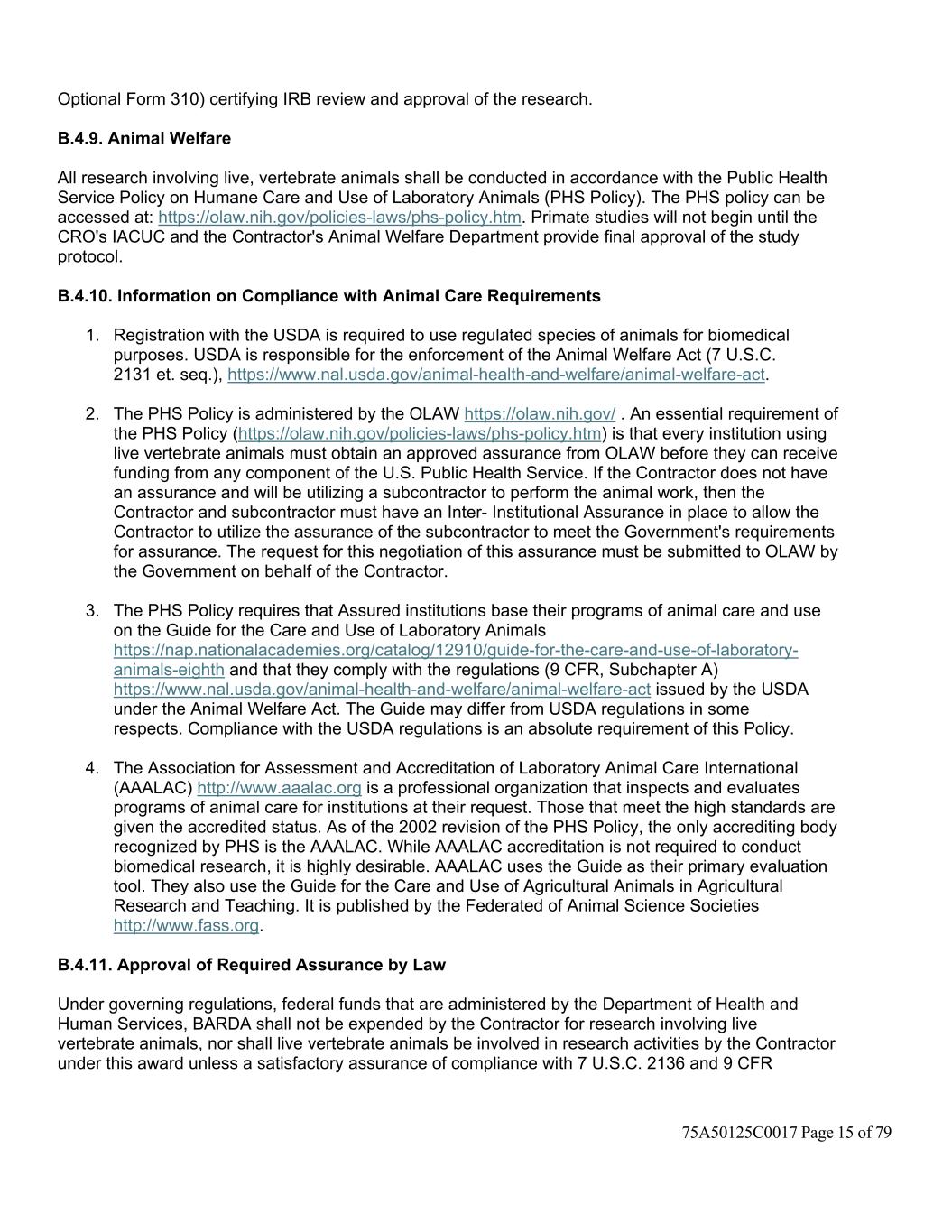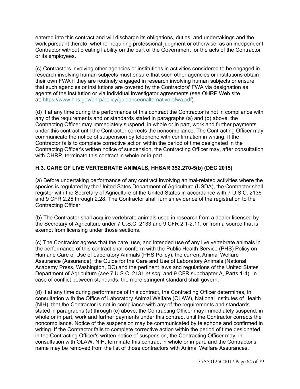 75A50125C0017 Page 64 of 79 entered into this contract and will discharge its obligations, duties, and undertakings and the work pursuant thereto, whether requiring professional judgment or otherwise, as an independent Contractor without creating liability on the part of the Government for the acts of the Contractor or its employees. (c) Contractors involving other agencies or institutions in activities considered to be engaged in research involving human subjects must ensure that such other agencies or institutions obtain their own FWA if they are routinely engaged in research involving human subjects or ensure that such agencies or institutions are covered by the Contractors' FWA via designation as agents of the institution or via individual investigator agreements (see OHRP Web site at: https://www.hhs.gov/ohrp/policy/guidanceonalternativetofwa.pdf). (d) If at any time during the performance of this contract the Contractor is not in compliance with any of the requirements and or standards stated in paragraphs (a) and (b) above, the Contracting Officer may immediately suspend, in whole or in part, work and further payments under this contract until the Contractor corrects the noncompliance. The Contracting Officer may communicate the notice of suspension by telephone with confirmation in writing. If the Contractor fails to complete corrective action within the period of time designated in the Contracting Officer's written notice of suspension, the Contracting Officer may, after consultation with OHRP, terminate this contract in whole or in part. H.3. CARE OF LIVE VERTEBRATE ANIMALS, HHSAR 352.270-5(b) (DEC 2015) (a) Before undertaking performance of any contract involving animal-related activities where the species is regulated by the United Sates Department of Agriculture (USDA), the Contractor shall register with the Secretary of Agriculture of the United States in accordance with 7 U.S.C. 2136 and 9 CFR 2.25 through 2.28. The Contractor shall furnish evidence of the registration to the Contracting Officer. (b) The Contractor shall acquire vertebrate animals used in research from a dealer licensed by the Secretary of Agriculture under 7 U.S.C. 2133 and 9 CFR 2.1-2.11, or from a source that is exempt from licensing under those sections. (c) The Contractor agrees that the care, use, and intended use of any live vertebrate animals in the performance of this contract shall conform with the Public Health Service (PHS) Policy on Humane Care of Use of Laboratory Animals (PHS Policy), the current Animal Welfare Assurance (Assurance), the Guide for the Care and Use of Laboratory Animals (National Academy Press, Washington, DC) and the pertinent laws and regulations of the United States Department of Agriculture (see 7 U.S.C. 2131 et seq. and 9 CFR subchapter A, Parts 1-4). In case of conflict between standards, the more stringent standard shall govern. (d) If at any time during performance of this contract, the Contracting Officer determines, in consultation with the Office of Laboratory Animal Welfare (OLAW), National Institutes of Health (NIH), that the Contractor is not in compliance with any of the requirements and standards stated in paragraphs (a) through (c) above, the Contracting Officer may immediately suspend, in whole or in part, work and further payments under this contract until the Contractor corrects the noncompliance. Notice of the suspension may be communicated by telephone and confirmed in writing. If the Contractor fails to complete corrective action within the period of time designated in the Contracting Officer's written notice of suspension, the Contracting Officer may, in consultation with OLAW, NIH, terminate this contract in whole or in part, and the Contractor's name may be removed from the list of those contractors with Animal Welfare Assurances.