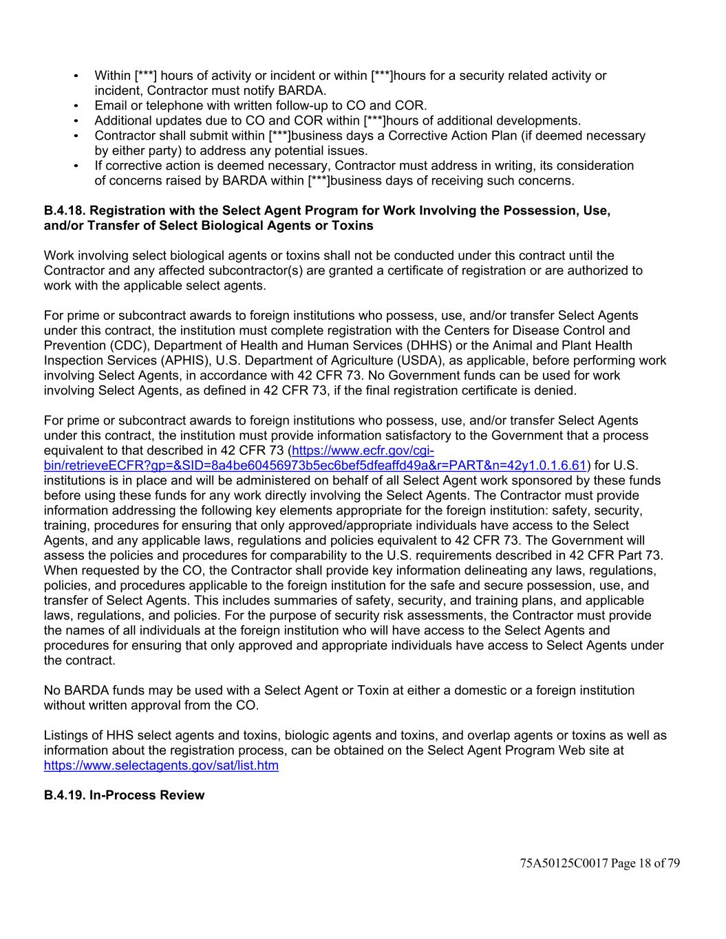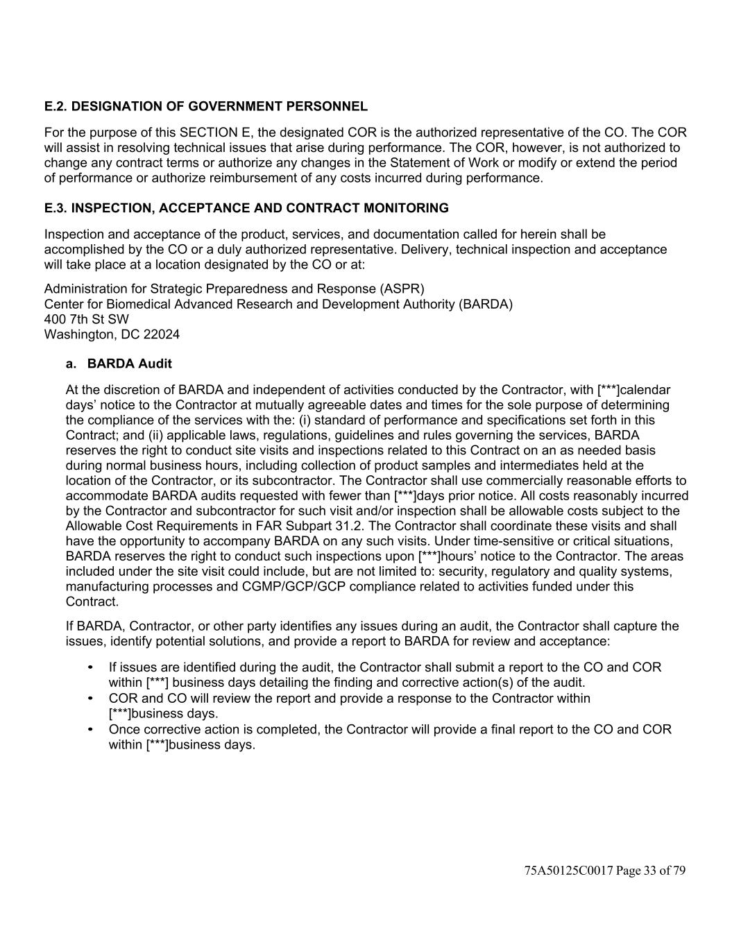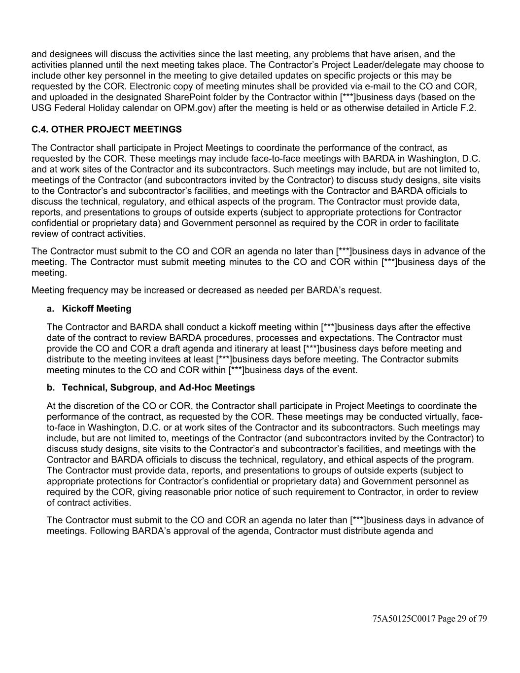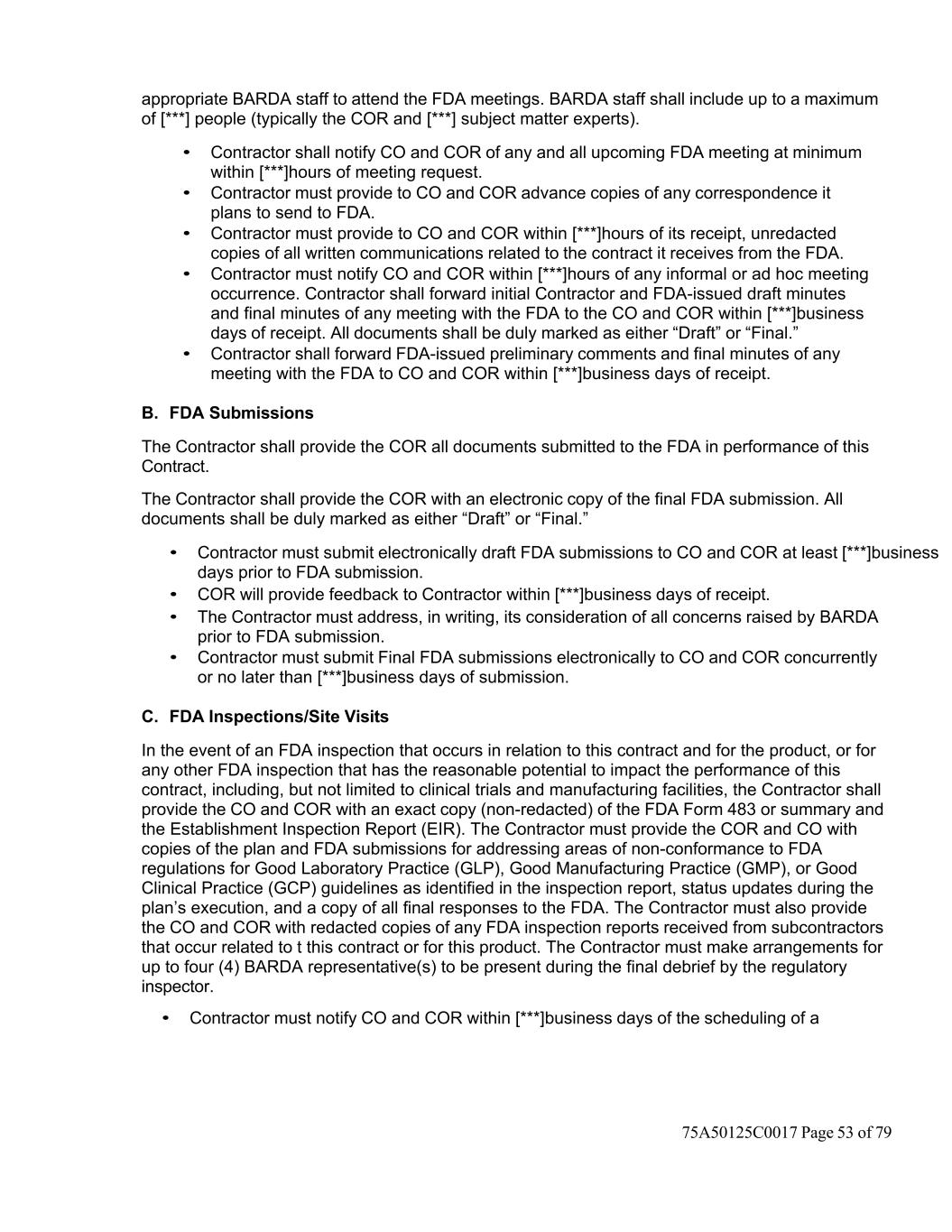75A50125C0017 Page 53 of 79 appropriate BARDA staff to attend the FDA meetings. BARDA staff shall include up to a maximum of [***] people (typically the COR and [***] subject matter experts). • Contractor shall notify CO and COR of any and all upcoming FDA meeting at minimum within [***]hours of meeting request. • Contractor must provide to CO and COR advance copies of any correspondence it plans to send to FDA. • Contractor must provide to CO and COR within [***]hours of its receipt, unredacted copies of all written communications related to the contract it receives from the FDA. • Contractor must notify CO and COR within [***]hours of any informal or ad hoc meeting occurrence. Contractor shall forward initial Contractor and FDA-issued draft minutes and final minutes of any meeting with the FDA to the CO and COR within [***]business days of receipt. All documents shall be duly marked as either “Draft” or “Final.” • Contractor shall forward FDA-issued preliminary comments and final minutes of any meeting with the FDA to CO and COR within [***]business days of receipt. B. FDA Submissions The Contractor shall provide the COR all documents submitted to the FDA in performance of this Contract. The Contractor shall provide the COR with an electronic copy of the final FDA submission. All documents shall be duly marked as either “Draft” or “Final.” • Contractor must submit electronically draft FDA submissions to CO and COR at least [***]business days prior to FDA submission. • COR will provide feedback to Contractor within [***]business days of receipt. • The Contractor must address, in writing, its consideration of all concerns raised by BARDA prior to FDA submission. • Contractor must submit Final FDA submissions electronically to CO and COR concurrently or no later than [***]business days of submission. C. FDA Inspections/Site Visits In the event of an FDA inspection that occurs in relation to this contract and for the product, or for any other FDA inspection that has the reasonable potential to impact the performance of this contract, including, but not limited to clinical trials and manufacturing facilities, the Contractor shall provide the CO and COR with an exact copy (non-redacted) of the FDA Form 483 or summary and the Establishment Inspection Report (EIR). The Contractor must provide the COR and CO with copies of the plan and FDA submissions for addressing areas of non-conformance to FDA regulations for Good Laboratory Practice (GLP), Good Manufacturing Practice (GMP), or Good Clinical Practice (GCP) guidelines as identified in the inspection report, status updates during the plan’s execution, and a copy of all final responses to the FDA. The Contractor must also provide the CO and COR with redacted copies of any FDA inspection reports received from subcontractors that occur related to t this contract or for this product. The Contractor must make arrangements for up to four (4) BARDA representative(s) to be present during the final debrief by the regulatory inspector. • Contractor must notify CO and COR within [***]business days of the scheduling of a