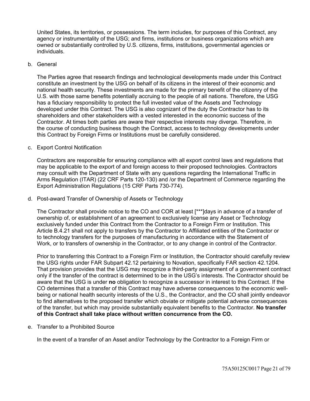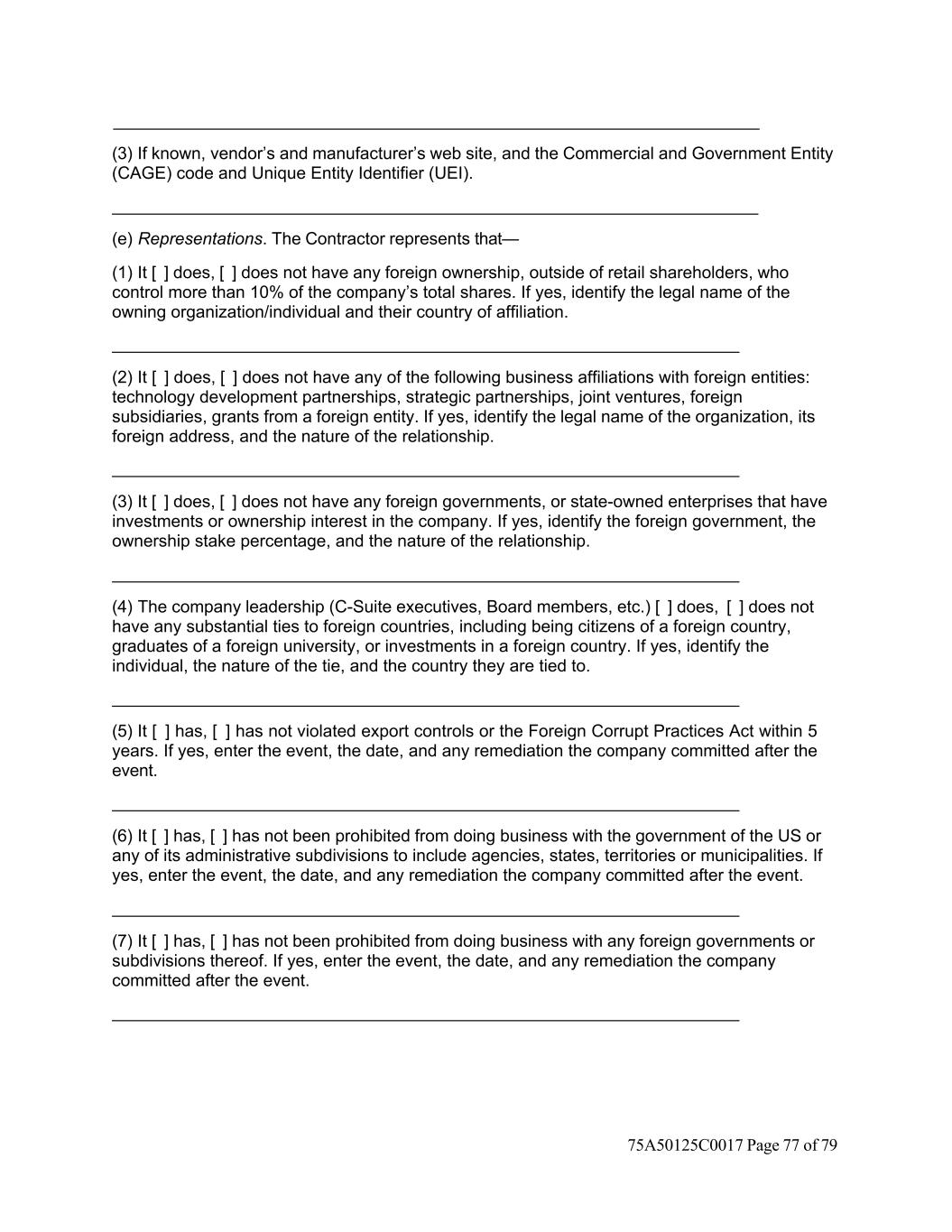 75A50125C0017 Page 77 of 79 (3) If known, vendor’s and manufacturer’s web site, and the Commercial and Government Entity (CAGE) code and Unique Entity Identifier (UEI). (e) Representations. The Contractor represents that— (1) It [ ] does, [ ] does not have any foreign ownership, outside of retail shareholders, who control more than 10% of the company’s total shares. If yes, identify the legal name of the owning organization/individual and their country of affiliation. (2) It [ ] does, [ ] does not have any of the following business affiliations with foreign entities: technology development partnerships, strategic partnerships, joint ventures, foreign subsidiaries, grants from a foreign entity. If yes, identify the legal name of the organization, its foreign address, and the nature of the relationship. (3) It [ ] does, [ ] does not have any foreign governments, or state-owned enterprises that have investments or ownership interest in the company. If yes, identify the foreign government, the ownership stake percentage, and the nature of the relationship. (4) The company leadership (C-Suite executives, Board members, etc.) [ ] does, [ ] does not have any substantial ties to foreign countries, including being citizens of a foreign country, graduates of a foreign university, or investments in a foreign country. If yes, identify the individual, the nature of the tie, and the country they are tied to. (5) It [ ] has, [ ] has not violated export controls or the Foreign Corrupt Practices Act within 5 years. If yes, enter the event, the date, and any remediation the company committed after the event. (6) It [ ] has, [ ] has not been prohibited from doing business with the government of the US or any of its administrative subdivisions to include agencies, states, territories or municipalities. If yes, enter the event, the date, and any remediation the company committed after the event. (7) It [ ] has, [ ] has not been prohibited from doing business with any foreign governments or subdivisions thereof. If yes, enter the event, the date, and any remediation the company committed after the event.