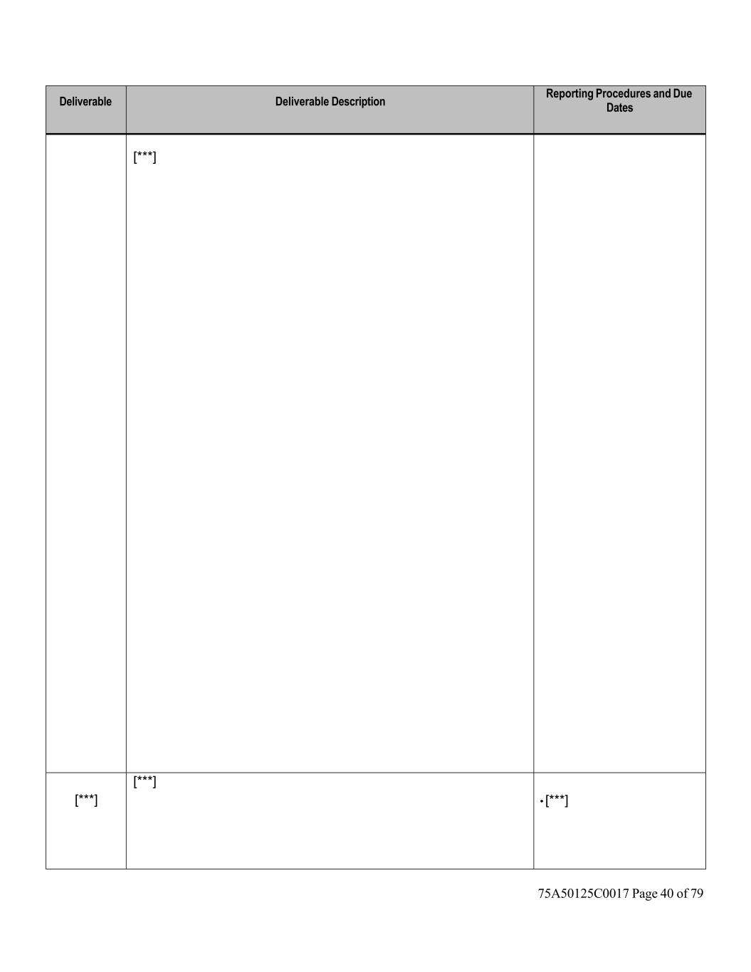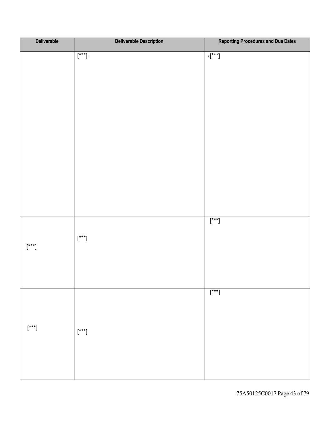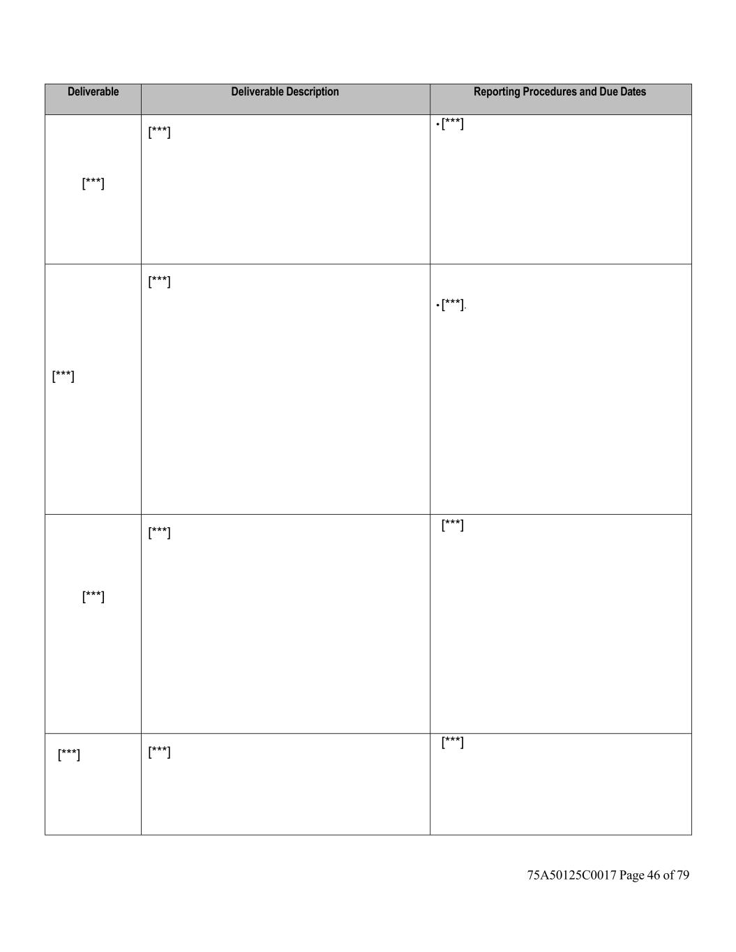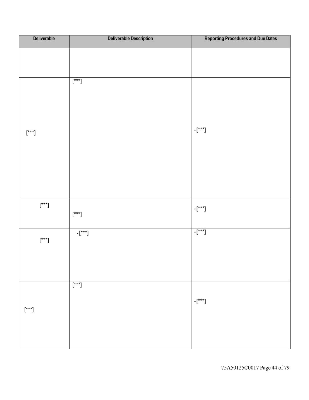 75A50125C0017 Page 46 of 79 Deliverable Deliverable Description Reporting Procedures and Due Dates [***] [***] • [***] [***] [***] • [***]. [***] [***] [***] [***] [***] [***]