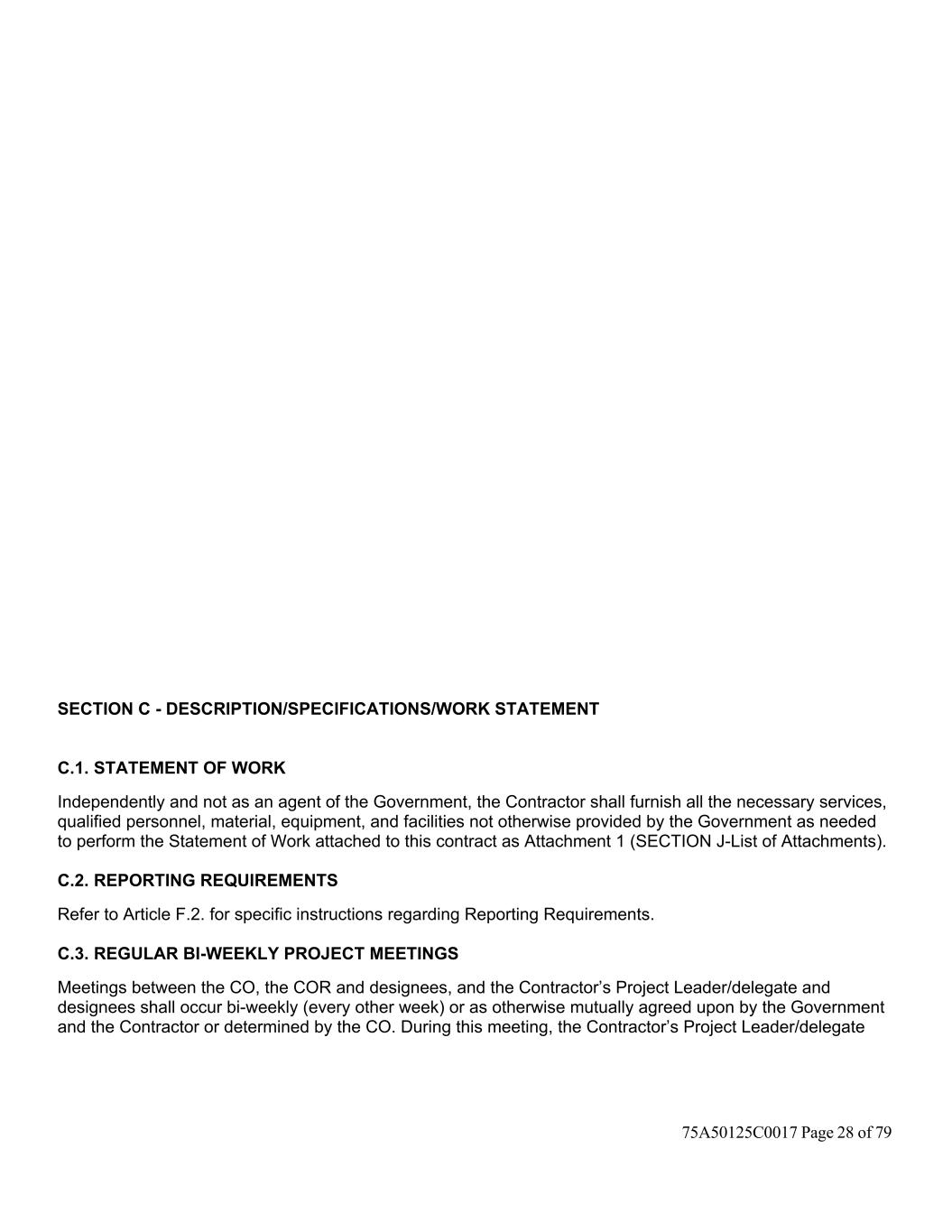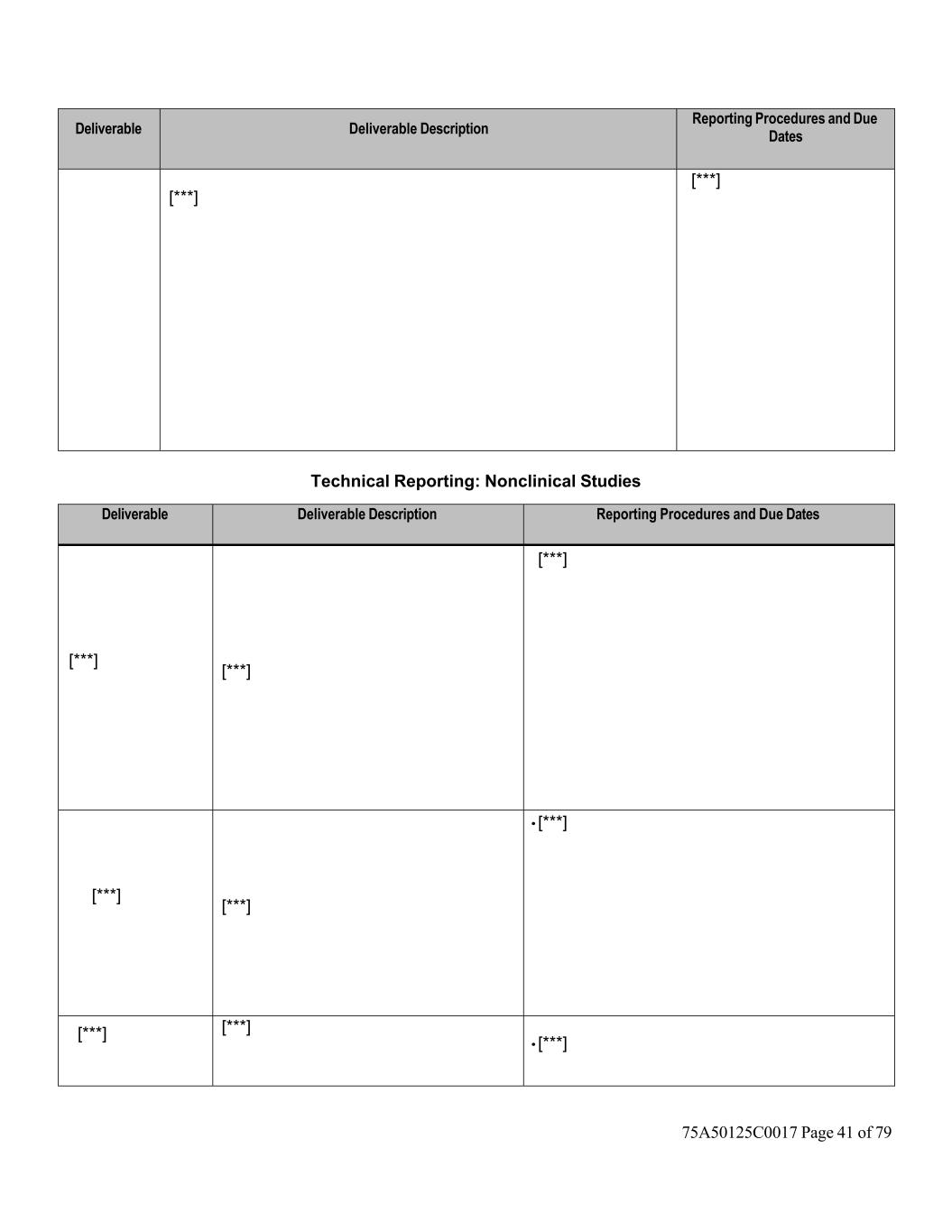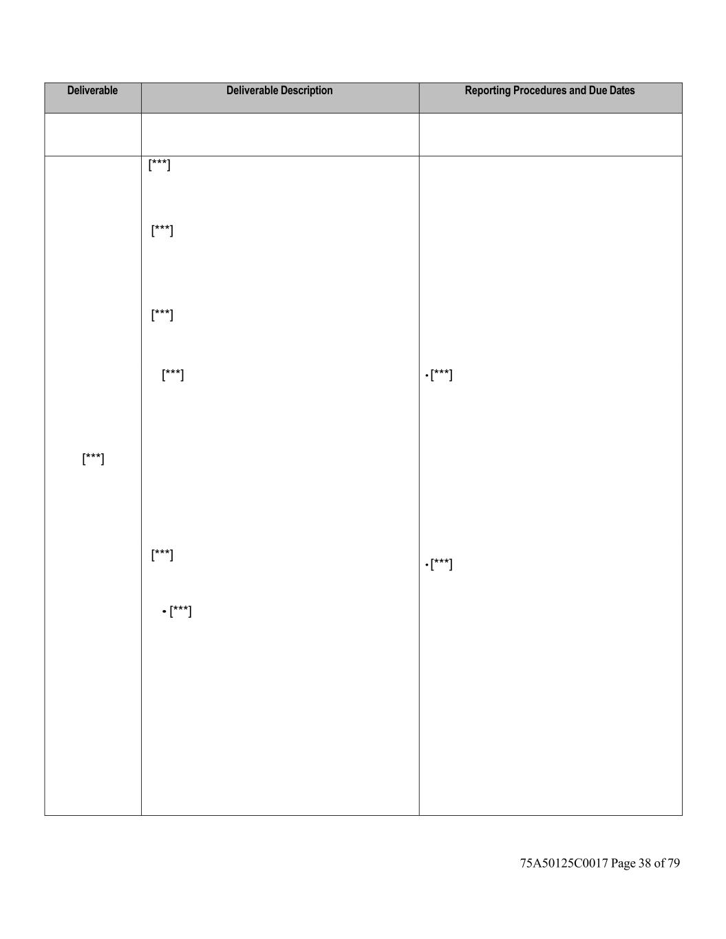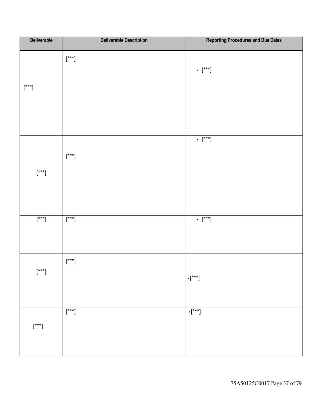 75A50125C0017 Page 46 of 79 Deliverable Deliverable Description Reporting Procedures and Due Dates [***] [***] • [***] [***] [***] • [***]. [***] [***] [***] [***] [***] [***]
