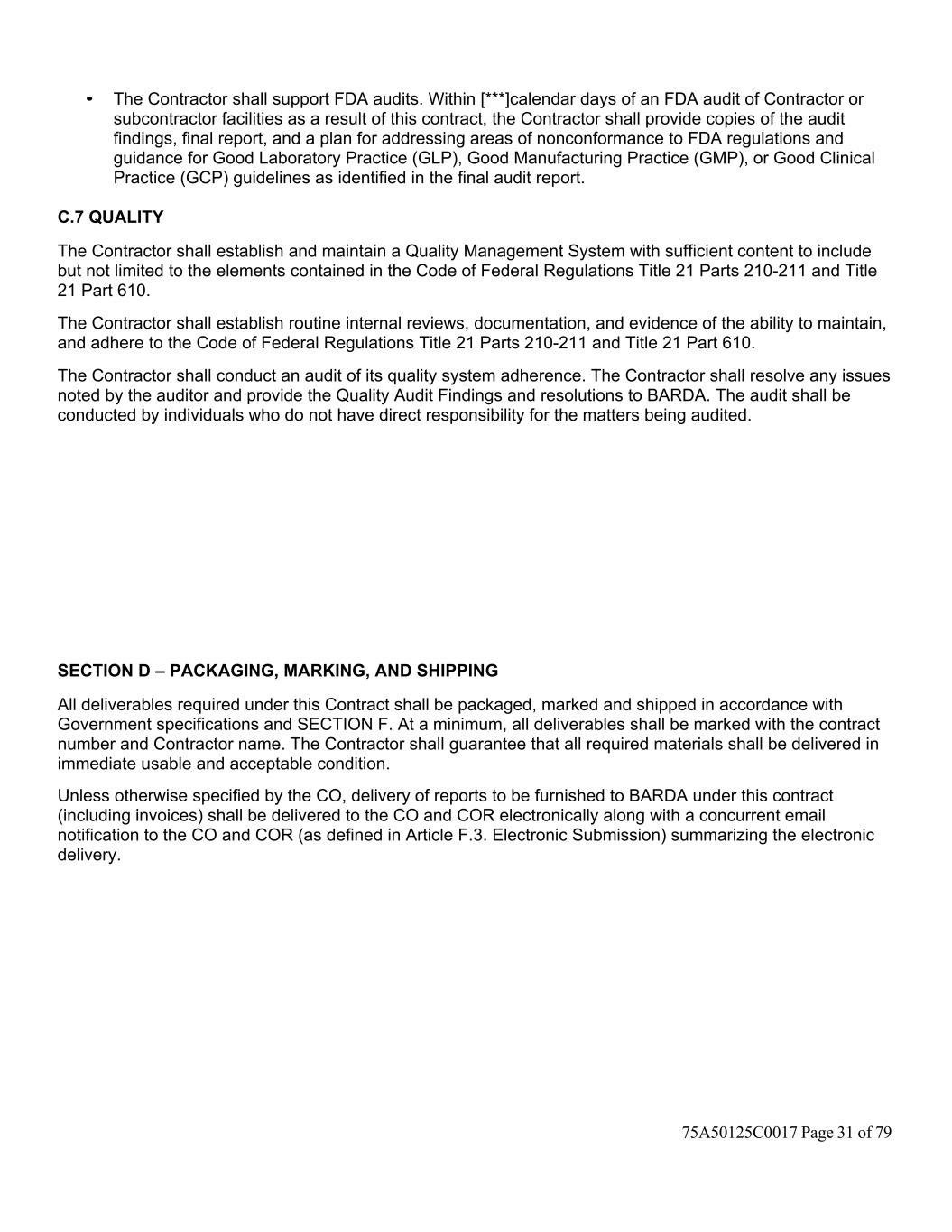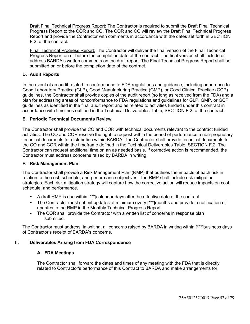 75A50125C0017 Page 52 of 79 Draft Final Technical Progress Report: The Contractor is required to submit the Draft Final Technical Progress Report to the COR and CO. The COR and CO will review the Draft Final Technical Progress Report and provide the Contractor with comments in accordance with the dates set forth in SECTION F.2. of the contract. Final Technical Progress Report: The Contractor will deliver the final version of the Final Technical Progress Report on or before the completion date of the contract. The final version shall include or address BARDA’s written comments on the draft report. The Final Technical Progress Report shall be submitted on or before the completion date of the contract. D. Audit Reports In the event of an audit related to conformance to FDA regulations and guidance, including adherence to Good Laboratory Practice (GLP), Good Manufacturing Practice (GMP), or Good Clinical Practice (GCP) guidelines, the Contractor shall provide copies of the audit report (so long as received from the FDA) and a plan for addressing areas of nonconformance to FDA regulations and guidelines for GLP, GMP, or GCP guidelines as identified in the final audit report and as related to activities funded under this contract in accordance with timelines outlined in the Technical Deliverables Table, SECTION F.2. of the contract. E. Periodic Technical Documents Review The Contractor shall provide the CO and COR with technical documents relevant to the contract funded activities. The CO and COR reserve the right to request within the period of performance a non-proprietary technical documents for distribution within BARDA. The Contractor shall provide technical documents to the CO and COR within the timeframe defined in the Technical Deliverables Table, SECTION F.2. The Contractor can request additional time on an as needed basis. If corrective action is recommended, the Contractor must address concerns raised by BARDA in writing. F. Risk Management Plan The Contractor shall provide a Risk Management Plan (RMP) that outlines the impacts of each risk in relation to the cost, schedule, and performance objectives. The RMP shall include risk mitigation strategies. Each risk mitigation strategy will capture how the corrective action will reduce impacts on cost, schedule, and performance. • A draft RMP is due within [***]calendar days after the effective date of the contract. • The Contractor must submit updates at minimum every [***]months and provide a notification of updates to the RMP in the Monthly Technical Progress Report. • The COR shall provide the Contractor with a written list of concerns in response plan submitted. The Contractor must address, in writing, all concerns raised by BARDA in writing within [***]business days of Contractor’s receipt of BARDA’s concerns. II. Deliverables Arising from FDA Correspondence A. FDA Meetings The Contractor shall forward the dates and times of any meeting with the FDA that is directly related to Contractor's performance of this Contract to BARDA and make arrangements for