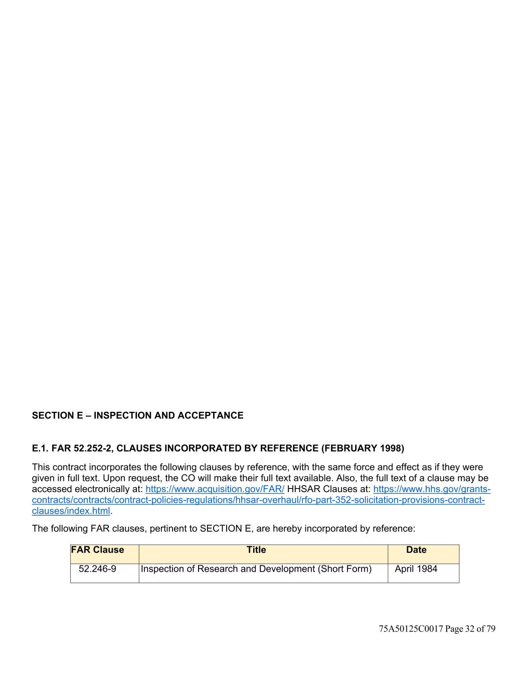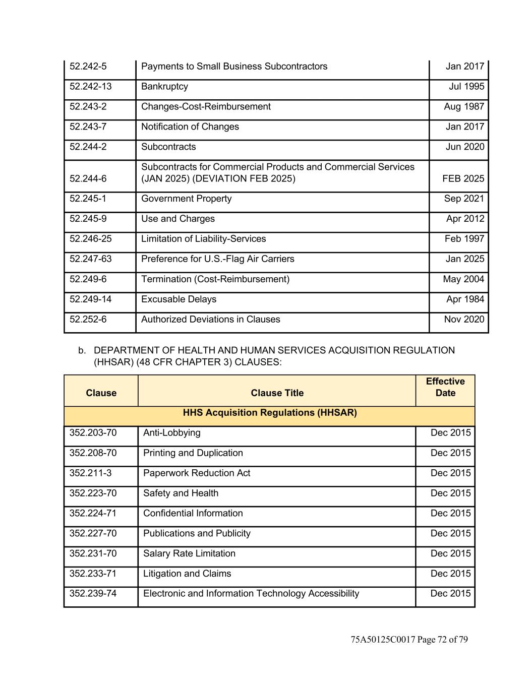 75A50125C0017 Page 72 of 79 52.242-5 Payments to Small Business Subcontractors Jan 2017 52.242-13 Bankruptcy Jul 1995 52.243-2 Changes-Cost-Reimbursement Aug 1987 52.243-7 Notification of Changes Jan 2017 52.244-2 Subcontracts Jun 2020 52.244-6 Subcontracts for Commercial Products and Commercial Services (JAN 2025) (DEVIATION FEB 2025) FEB 2025 52.245-1 Government Property Sep 2021 52.245-9 Use and Charges Apr 2012 52.246-25 Limitation of Liability-Services Feb 1997 52.247-63 Preference for U.S.-Flag Air Carriers Jan 2025 52.249-6 Termination (Cost-Reimbursement) May 2004 52.249-14 Excusable Delays Apr 1984 52.252-6 Authorized Deviations in Clauses Nov 2020 b. DEPARTMENT OF HEALTH AND HUMAN SERVICES ACQUISITION REGULATION (HHSAR) (48 CFR CHAPTER 3) CLAUSES: Clause Clause Title Effective Date HHS Acquisition Regulations (HHSAR) 352.203-70 Anti-Lobbying Dec 2015 352.208-70 Printing and Duplication Dec 2015 352.211-3 Paperwork Reduction Act Dec 2015 352.223-70 Safety and Health Dec 2015 352.224-71 Confidential Information Dec 2015 352.227-70 Publications and Publicity Dec 2015 352.231-70 Salary Rate Limitation Dec 2015 352.233-71 Litigation and Claims Dec 2015 352.239-74 Electronic and Information Technology Accessibility Dec 2015