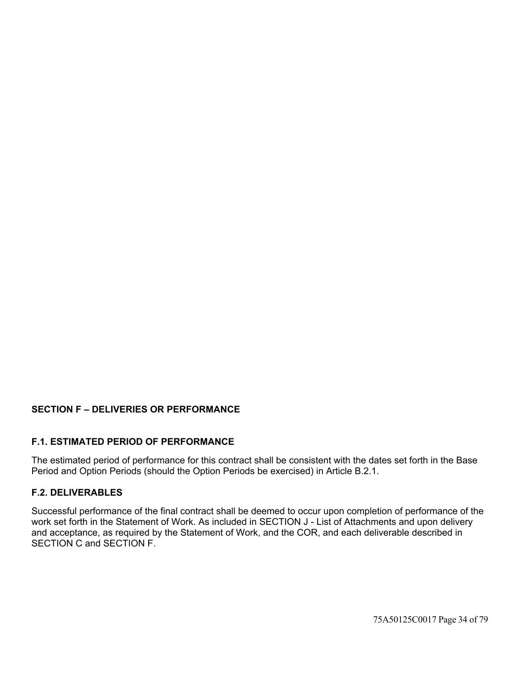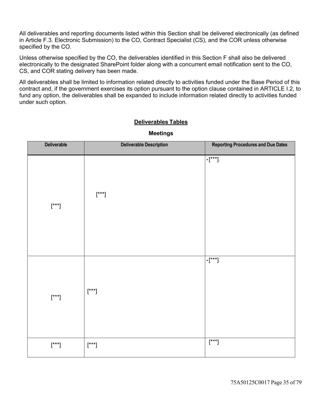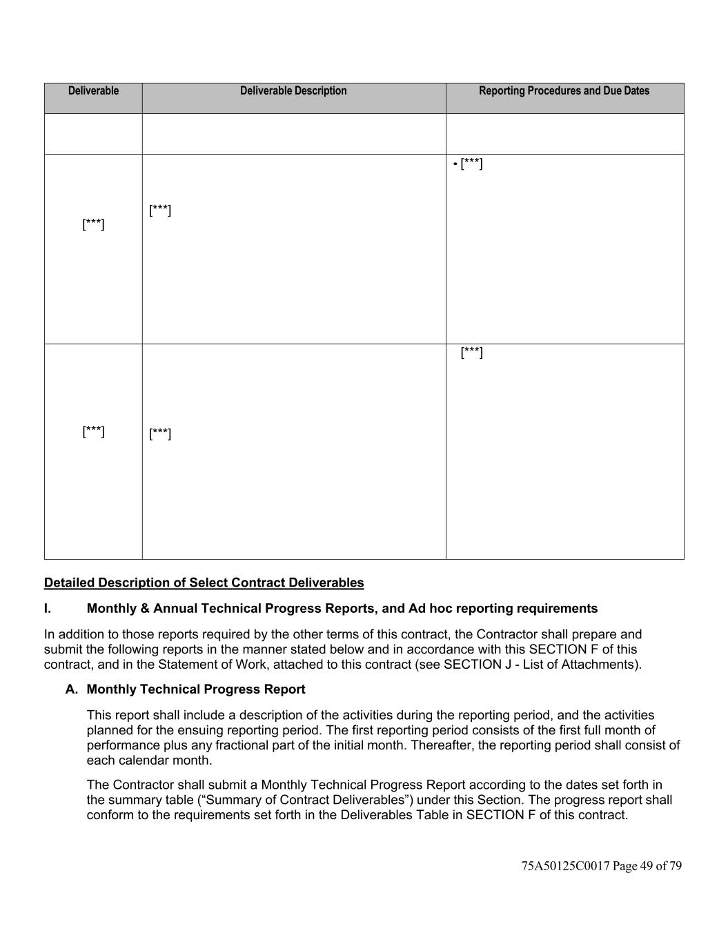 75A50125C0017 Page 49 of 79 Deliverable Deliverable Description Reporting Procedures and Due Dates [***] [***] • [***] [***] [***] [***] Detailed Description of Select Contract Deliverables I. Monthly & Annual Technical Progress Reports, and Ad hoc reporting requirements In addition to those reports required by the other terms of this contract, the Contractor shall prepare and submit the following reports in the manner stated below and in accordance with this SECTION F of this contract, and in the Statement of Work, attached to this contract (see SECTION J - List of Attachments). A. Monthly Technical Progress Report This report shall include a description of the activities during the reporting period, and the activities planned for the ensuing reporting period. The first reporting period consists of the first full month of performance plus any fractional part of the initial month. Thereafter, the reporting period shall consist of each calendar month. The Contractor shall submit a Monthly Technical Progress Report according to the dates set forth in the summary table (“Summary of Contract Deliverables”) under this Section. The progress report shall conform to the requirements set forth in the Deliverables Table in SECTION F of this contract.