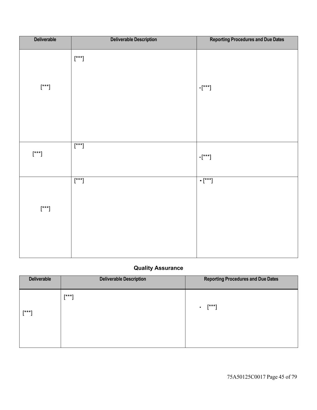 75A50125C0017 Page 45 of 79 Deliverable Deliverable Description Reporting Procedures and Due Dates [***] [***] • [***] [***] [***] • [***] [***] [***] • [***] Quality Assurance Deliverable Deliverable Description Reporting Procedures and Due Dates [***] [***] • [***]