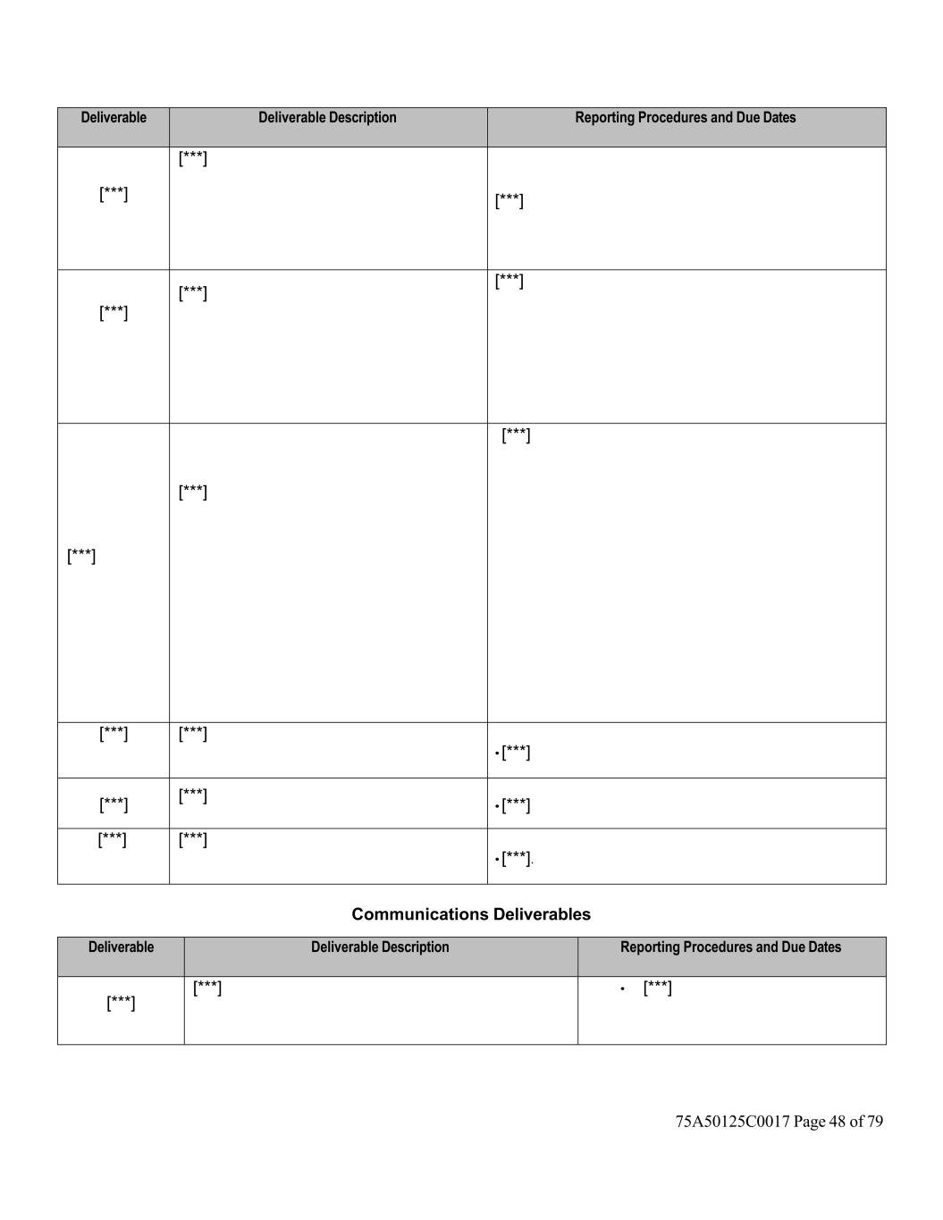 75A50125C0017 Page 48 of 79 Deliverable Deliverable Description Reporting Procedures and Due Dates [***] [***] [***] [***] [***] [***] [***] [***] [***] [***] [***] • [***] [***] [***] • [***] [***] [***] • [***]. Communications Deliverables Deliverable Deliverable Description Reporting Procedures and Due Dates [***] [***] • [***]