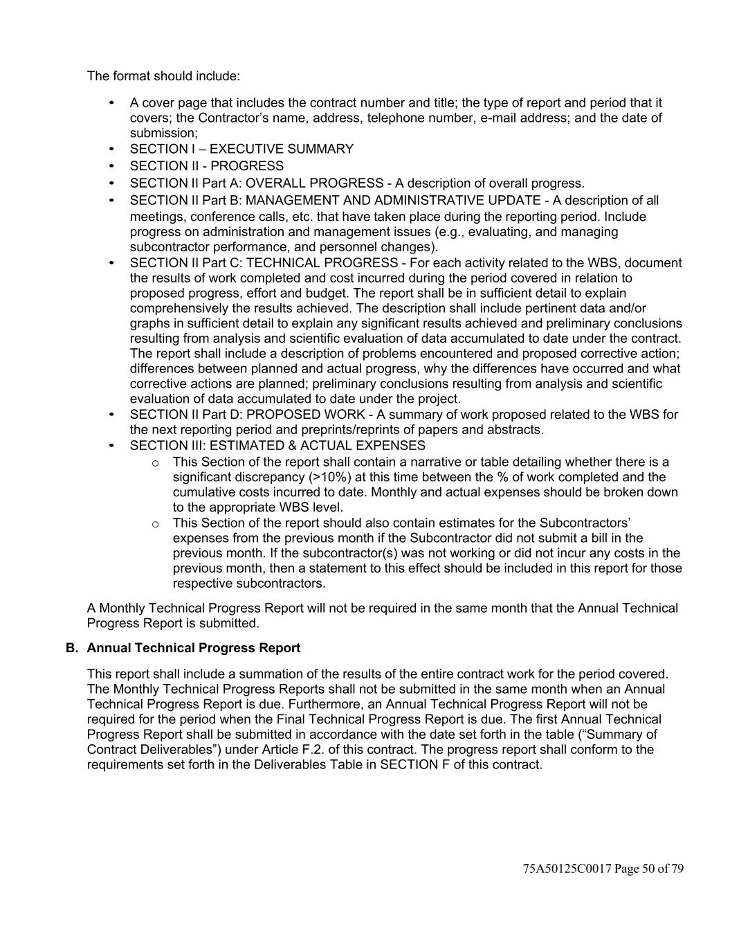 75A50125C0017 Page 50 of 79 The format should include: • A cover page that includes the contract number and title; the type of report and period that it covers; the Contractor’s name, address, telephone number, e-mail address; and the date of submission; • SECTION I – EXECUTIVE SUMMARY • SECTION II - PROGRESS • SECTION II Part A: OVERALL PROGRESS - A description of overall progress. • SECTION II Part B: MANAGEMENT AND ADMINISTRATIVE UPDATE - A description of all meetings, conference calls, etc. that have taken place during the reporting period. Include progress on administration and management issues (e.g., evaluating, and managing subcontractor performance, and personnel changes). • SECTION II Part C: TECHNICAL PROGRESS - For each activity related to the WBS, document the results of work completed and cost incurred during the period covered in relation to proposed progress, effort and budget. The report shall be in sufficient detail to explain comprehensively the results achieved. The description shall include pertinent data and/or graphs in sufficient detail to explain any significant results achieved and preliminary conclusions resulting from analysis and scientific evaluation of data accumulated to date under the contract. The report shall include a description of problems encountered and proposed corrective action; differences between planned and actual progress, why the differences have occurred and what corrective actions are planned; preliminary conclusions resulting from analysis and scientific evaluation of data accumulated to date under the project. • SECTION II Part D: PROPOSED WORK - A summary of work proposed related to the WBS for the next reporting period and preprints/reprints of papers and abstracts. • SECTION III: ESTIMATED & ACTUAL EXPENSES o This Section of the report shall contain a narrative or table detailing whether there is a significant discrepancy (>10%) at this time between the % of work completed and the cumulative costs incurred to date. Monthly and actual expenses should be broken down to the appropriate WBS level. o This Section of the report should also contain estimates for the Subcontractors’ expenses from the previous month if the Subcontractor did not submit a bill in the previous month. If the subcontractor(s) was not working or did not incur any costs in the previous month, then a statement to this effect should be included in this report for those respective subcontractors. A Monthly Technical Progress Report will not be required in the same month that the Annual Technical Progress Report is submitted. B. Annual Technical Progress Report This report shall include a summation of the results of the entire contract work for the period covered. The Monthly Technical Progress Reports shall not be submitted in the same month when an Annual Technical Progress Report is due. Furthermore, an Annual Technical Progress Report will not be required for the period when the Final Technical Progress Report is due. The first Annual Technical Progress Report shall be submitted in accordance with the date set forth in the table (“Summary of Contract Deliverables”) under Article F.2. of this contract. The progress report shall conform to the requirements set forth in the Deliverables Table in SECTION F of this contract.