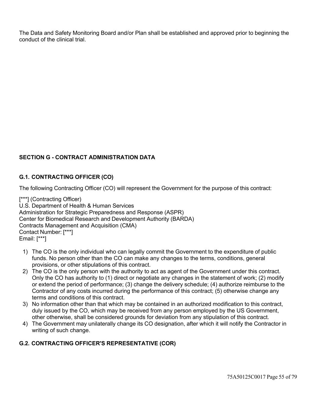 75A50125C0017 Page 55 of 79 The Data and Safety Monitoring Board and/or Plan shall be established and approved prior to beginning the conduct of the clinical trial. SECTION G - CONTRACT ADMINISTRATION DATA G.1. CONTRACTING OFFICER (CO) The following Contracting Officer (CO) will represent the Government for the purpose of this contract: [***] (Contracting Officer) U.S. Department of Health & Human Services Administration for Strategic Preparedness and Response (ASPR) Center for Biomedical Research and Development Authority (BARDA) Contracts Management and Acquisition (CMA) Contact Number: [***] Email: [***] 1) The CO is the only individual who can legally commit the Government to the expenditure of public funds. No person other than the CO can make any changes to the terms, conditions, general provisions, or other stipulations of this contract. 2) The CO is the only person with the authority to act as agent of the Government under this contract. Only the CO has authority to (1) direct or negotiate any changes in the statement of work; (2) modify or extend the period of performance; (3) change the delivery schedule; (4) authorize reimburse to the Contractor of any costs incurred during the performance of this contract; (5) otherwise change any terms and conditions of this contract. 3) No information other than that which may be contained in an authorized modification to this contract, duly issued by the CO, which may be received from any person employed by the US Government, other otherwise, shall be considered grounds for deviation from any stipulation of this contract. 4) The Government may unilaterally change its CO designation, after which it will notify the Contractor in writing of such change. G.2. CONTRACTING OFFICER'S REPRESENTATIVE (COR)