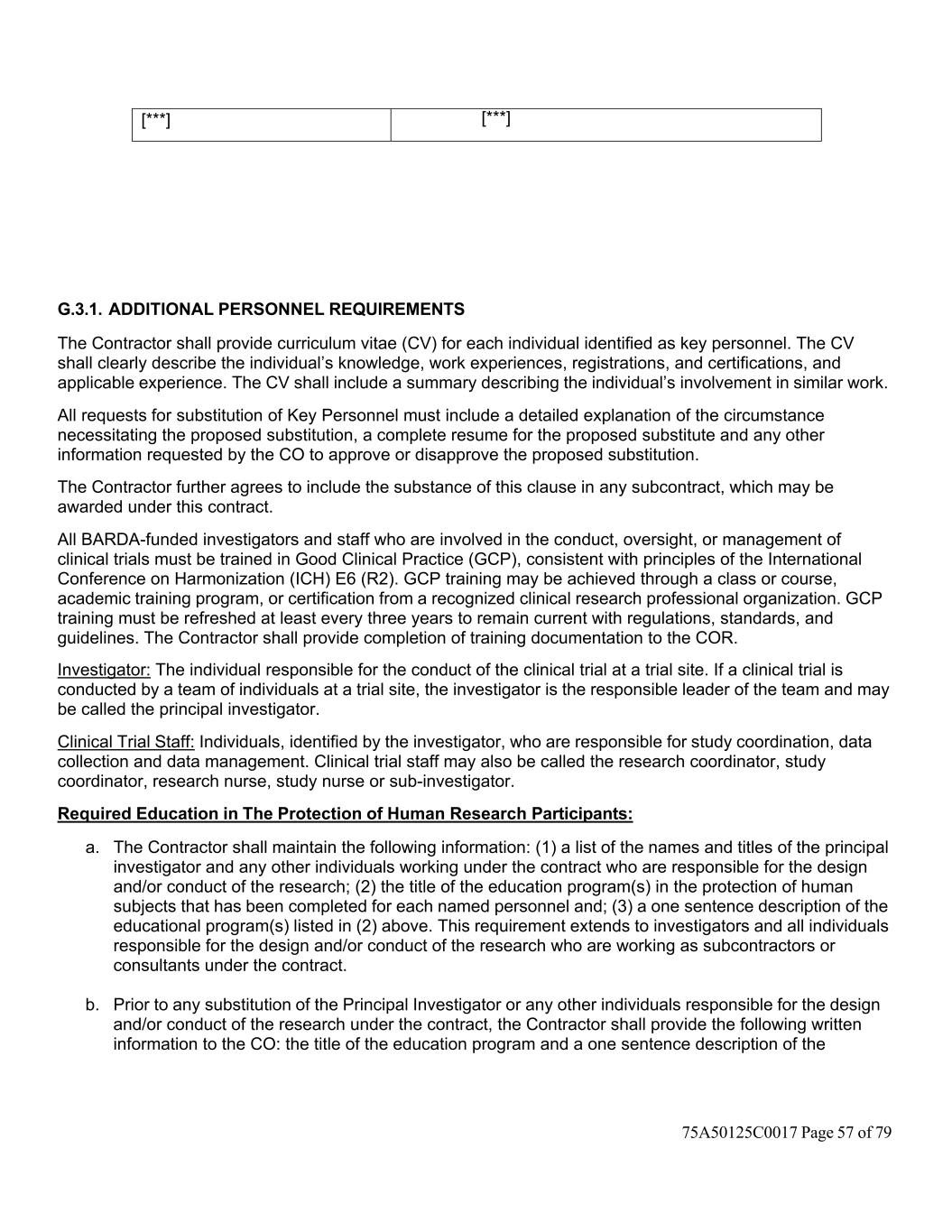 75A50125C0017 Page 57 of 79 [***] [***] G.3.1. ADDITIONAL PERSONNEL REQUIREMENTS The Contractor shall provide curriculum vitae (CV) for each individual identified as key personnel. The CV shall clearly describe the individual’s knowledge, work experiences, registrations, and certifications, and applicable experience. The CV shall include a summary describing the individual’s involvement in similar work. All requests for substitution of Key Personnel must include a detailed explanation of the circumstance necessitating the proposed substitution, a complete resume for the proposed substitute and any other information requested by the CO to approve or disapprove the proposed substitution. The Contractor further agrees to include the substance of this clause in any subcontract, which may be awarded under this contract. All BARDA-funded investigators and staff who are involved in the conduct, oversight, or management of clinical trials must be trained in Good Clinical Practice (GCP), consistent with principles of the International Conference on Harmonization (ICH) E6 (R2). GCP training may be achieved through a class or course, academic training program, or certification from a recognized clinical research professional organization. GCP training must be refreshed at least every three years to remain current with regulations, standards, and guidelines. The Contractor shall provide completion of training documentation to the COR. Investigator: The individual responsible for the conduct of the clinical trial at a trial site. If a clinical trial is conducted by a team of individuals at a trial site, the investigator is the responsible leader of the team and may be called the principal investigator. Clinical Trial Staff: Individuals, identified by the investigator, who are responsible for study coordination, data collection and data management. Clinical trial staff may also be called the research coordinator, study coordinator, research nurse, study nurse or sub-investigator. Required Education in The Protection of Human Research Participants: a. The Contractor shall maintain the following information: (1) a list of the names and titles of the principal investigator and any other individuals working under the contract who are responsible for the design and/or conduct of the research; (2) the title of the education program(s) in the protection of human subjects that has been completed for each named personnel and; (3) a one sentence description of the educational program(s) listed in (2) above. This requirement extends to investigators and all individuals responsible for the design and/or conduct of the research who are working as subcontractors or consultants under the contract. b. Prior to any substitution of the Principal Investigator or any other individuals responsible for the design and/or conduct of the research under the contract, the Contractor shall provide the following written information to the CO: the title of the education program and a one sentence description of the
