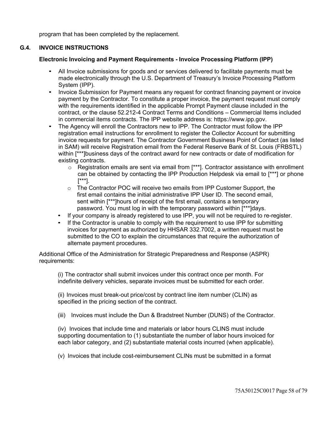 75A50125C0017 Page 58 of 79 program that has been completed by the replacement. G.4. INVOICE INSTRUCTIONS Electronic Invoicing and Payment Requirements - Invoice Processing Platform (IPP) • All Invoice submissions for goods and or services delivered to facilitate payments must be made electronically through the U.S. Department of Treasury’s Invoice Processing Platform System (IPP). • Invoice Submission for Payment means any request for contract financing payment or invoice payment by the Contractor. To constitute a proper invoice, the payment request must comply with the requirements identified in the applicable Prompt Payment clause included in the contract, or the clause 52.212-4 Contract Terms and Conditions – Commercial Items included in commercial items contracts. The IPP website address is: https://www.ipp.gov. • The Agency will enroll the Contractors new to IPP. The Contractor must follow the IPP registration email instructions for enrollment to register the Collector Account for submitting invoice requests for payment. The Contractor Government Business Point of Contact (as listed in SAM) will receive Registration email from the Federal Reserve Bank of St. Louis (FRBSTL) within [***]business days of the contract award for new contracts or date of modification for existing contracts. o Registration emails are sent via email from [***]. Contractor assistance with enrollment can be obtained by contacting the IPP Production Helpdesk via email to [***] or phone [***]. o The Contractor POC will receive two emails from IPP Customer Support, the first email contains the initial administrative IPP User ID. The second email, sent within [***]hours of receipt of the first email, contains a temporary password. You must log in with the temporary password within [***]days. • If your company is already registered to use IPP, you will not be required to re-register. • If the Contractor is unable to comply with the requirement to use IPP for submitting invoices for payment as authorized by HHSAR 332.7002, a written request must be submitted to the CO to explain the circumstances that require the authorization of alternate payment procedures. Additional Office of the Administration for Strategic Preparedness and Response (ASPR) requirements: (i) The contractor shall submit invoices under this contract once per month. For indefinite delivery vehicles, separate invoices must be submitted for each order. (ii) Invoices must break-out price/cost by contract line item number (CLIN) as specified in the pricing section of the contract. (iii) Invoices must include the Dun & Bradstreet Number (DUNS) of the Contractor. (iv) Invoices that include time and materials or labor hours CLINS must include supporting documentation to (1) substantiate the number of labor hours invoiced for each labor category, and (2) substantiate material costs incurred (when applicable). (v) Invoices that include cost-reimbursement CLINs must be submitted in a format