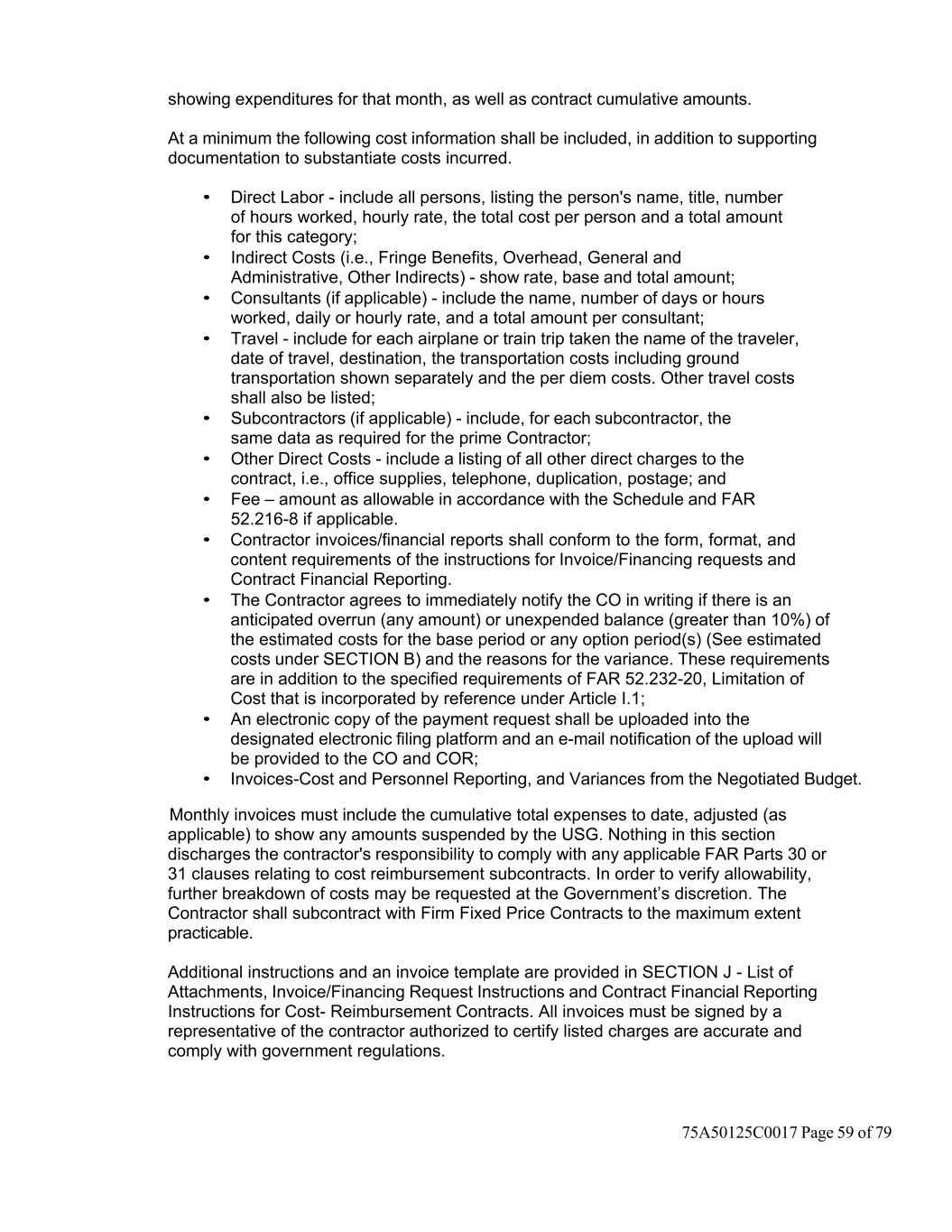 75A50125C0017 Page 59 of 79 showing expenditures for that month, as well as contract cumulative amounts. At a minimum the following cost information shall be included, in addition to supporting documentation to substantiate costs incurred. • Direct Labor - include all persons, listing the person's name, title, number of hours worked, hourly rate, the total cost per person and a total amount for this category; • Indirect Costs (i.e., Fringe Benefits, Overhead, General and Administrative, Other Indirects) - show rate, base and total amount; • Consultants (if applicable) - include the name, number of days or hours worked, daily or hourly rate, and a total amount per consultant; • Travel - include for each airplane or train trip taken the name of the traveler, date of travel, destination, the transportation costs including ground transportation shown separately and the per diem costs. Other travel costs shall also be listed; • Subcontractors (if applicable) - include, for each subcontractor, the same data as required for the prime Contractor; • Other Direct Costs - include a listing of all other direct charges to the contract, i.e., office supplies, telephone, duplication, postage; and • Fee – amount as allowable in accordance with the Schedule and FAR 52.216-8 if applicable. • Contractor invoices/financial reports shall conform to the form, format, and content requirements of the instructions for Invoice/Financing requests and Contract Financial Reporting. • The Contractor agrees to immediately notify the CO in writing if there is an anticipated overrun (any amount) or unexpended balance (greater than 10%) of the estimated costs for the base period or any option period(s) (See estimated costs under SECTION B) and the reasons for the variance. These requirements are in addition to the specified requirements of FAR 52.232-20, Limitation of Cost that is incorporated by reference under Article I.1; • An electronic copy of the payment request shall be uploaded into the designated electronic filing platform and an e-mail notification of the upload will be provided to the CO and COR; • Invoices-Cost and Personnel Reporting, and Variances from the Negotiated Budget. Monthly invoices must include the cumulative total expenses to date, adjusted (as applicable) to show any amounts suspended by the USG. Nothing in this section discharges the contractor's responsibility to comply with any applicable FAR Parts 30 or 31 clauses relating to cost reimbursement subcontracts. In order to verify allowability, further breakdown of costs may be requested at the Government’s discretion. The Contractor shall subcontract with Firm Fixed Price Contracts to the maximum extent practicable. Additional instructions and an invoice template are provided in SECTION J - List of Attachments, Invoice/Financing Request Instructions and Contract Financial Reporting Instructions for Cost- Reimbursement Contracts. All invoices must be signed by a representative of the contractor authorized to certify listed charges are accurate and comply with government regulations.