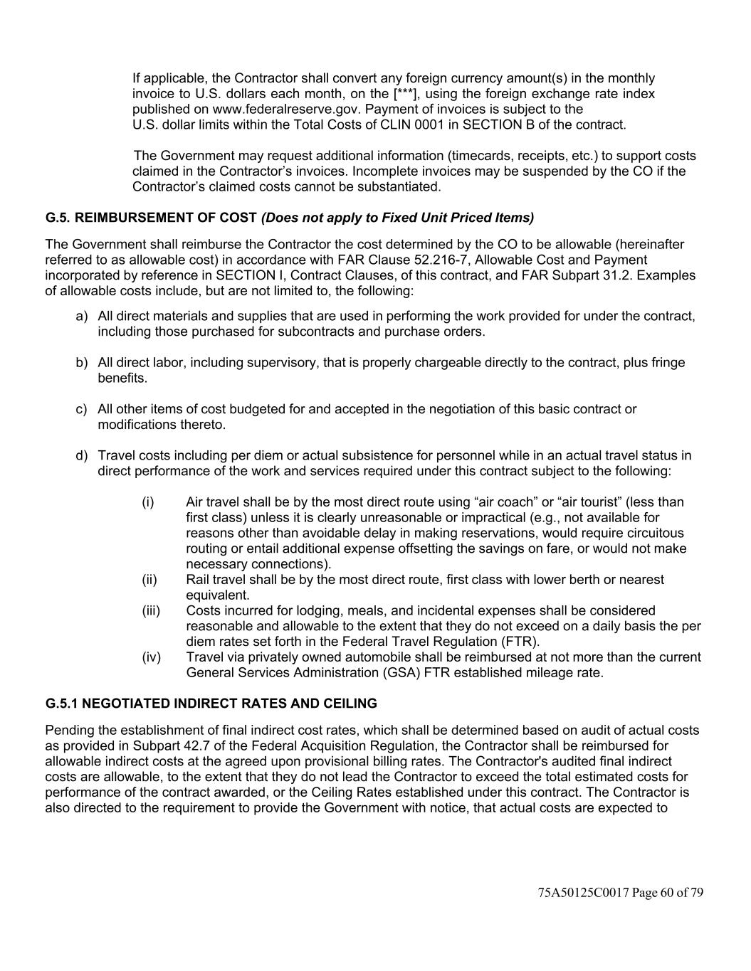 75A50125C0017 Page 60 of 79 If applicable, the Contractor shall convert any foreign currency amount(s) in the monthly invoice to U.S. dollars each month, on the [***], using the foreign exchange rate index published on www.federalreserve.gov. Payment of invoices is subject to the U.S. dollar limits within the Total Costs of CLIN 0001 in SECTION B of the contract. The Government may request additional information (timecards, receipts, etc.) to support costs claimed in the Contractor’s invoices. Incomplete invoices may be suspended by the CO if the Contractor’s claimed costs cannot be substantiated. G.5. REIMBURSEMENT OF COST (Does not apply to Fixed Unit Priced Items) The Government shall reimburse the Contractor the cost determined by the CO to be allowable (hereinafter referred to as allowable cost) in accordance with FAR Clause 52.216-7, Allowable Cost and Payment incorporated by reference in SECTION I, Contract Clauses, of this contract, and FAR Subpart 31.2. Examples of allowable costs include, but are not limited to, the following: a) All direct materials and supplies that are used in performing the work provided for under the contract, including those purchased for subcontracts and purchase orders. b) All direct labor, including supervisory, that is properly chargeable directly to the contract, plus fringe benefits. c) All other items of cost budgeted for and accepted in the negotiation of this basic contract or modifications thereto. d) Travel costs including per diem or actual subsistence for personnel while in an actual travel status in direct performance of the work and services required under this contract subject to the following: (i) Air travel shall be by the most direct route using “air coach” or “air tourist” (less than first class) unless it is clearly unreasonable or impractical (e.g., not available for reasons other than avoidable delay in making reservations, would require circuitous routing or entail additional expense offsetting the savings on fare, or would not make necessary connections). (ii) Rail travel shall be by the most direct route, first class with lower berth or nearest equivalent. (iii) Costs incurred for lodging, meals, and incidental expenses shall be considered reasonable and allowable to the extent that they do not exceed on a daily basis the per diem rates set forth in the Federal Travel Regulation (FTR). (iv) Travel via privately owned automobile shall be reimbursed at not more than the current General Services Administration (GSA) FTR established mileage rate. G.5.1 NEGOTIATED INDIRECT RATES AND CEILING Pending the establishment of final indirect cost rates, which shall be determined based on audit of actual costs as provided in Subpart 42.7 of the Federal Acquisition Regulation, the Contractor shall be reimbursed for allowable indirect costs at the agreed upon provisional billing rates. The Contractor's audited final indirect costs are allowable, to the extent that they do not lead the Contractor to exceed the total estimated costs for performance of the contract awarded, or the Ceiling Rates established under this contract. The Contractor is also directed to the requirement to provide the Government with notice, that actual costs are expected to