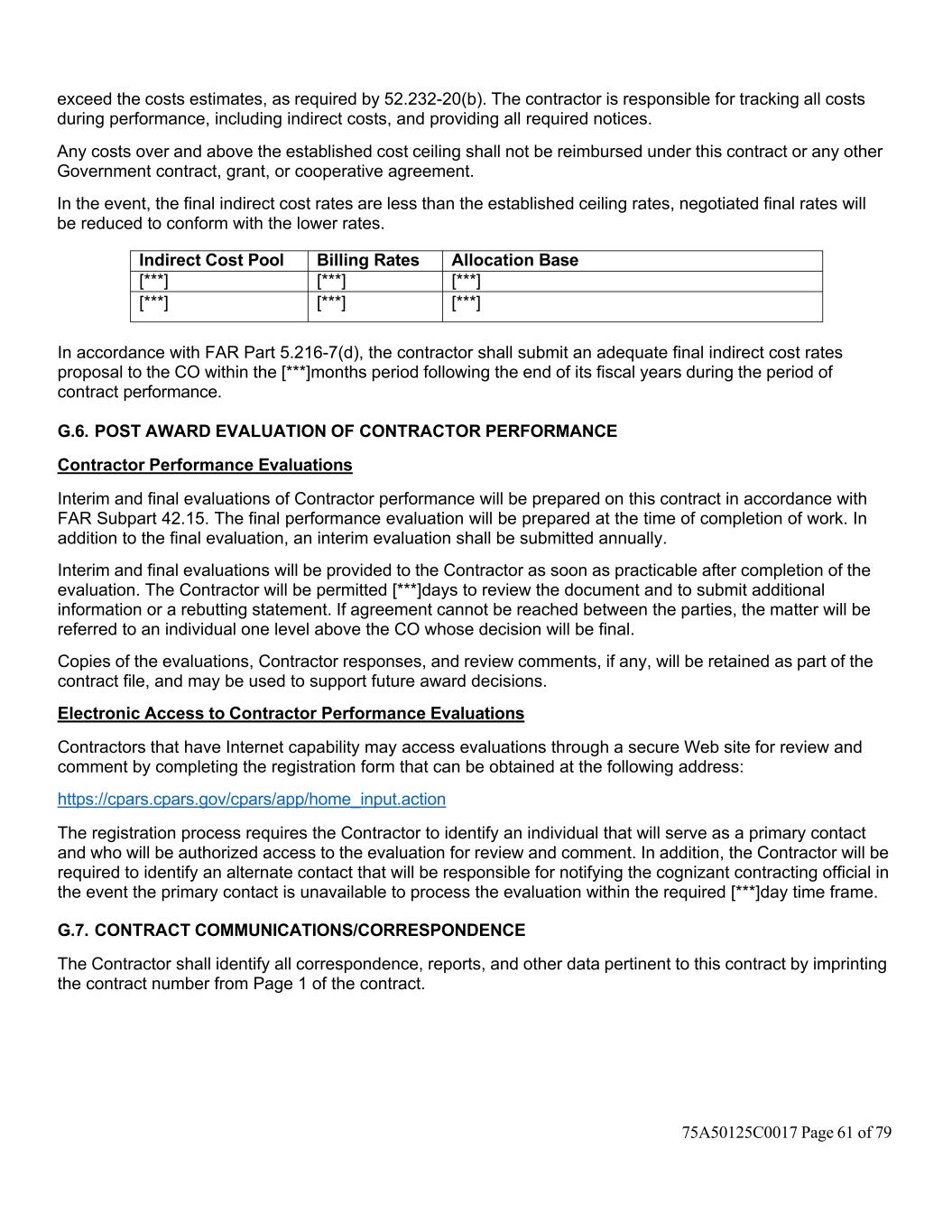 75A50125C0017 Page 61 of 79 exceed the costs estimates, as required by 52.232-20(b). The contractor is responsible for tracking all costs during performance, including indirect costs, and providing all required notices. Any costs over and above the established cost ceiling shall not be reimbursed under this contract or any other Government contract, grant, or cooperative agreement. In the event, the final indirect cost rates are less than the established ceiling rates, negotiated final rates will be reduced to conform with the lower rates. Indirect Cost Pool Billing Rates Allocation Base [***] [***] [***] [***] [***] [***] In accordance with FAR Part 5.216-7(d), the contractor shall submit an adequate final indirect cost rates proposal to the CO within the [***]months period following the end of its fiscal years during the period of contract performance. G.6. POST AWARD EVALUATION OF CONTRACTOR PERFORMANCE Contractor Performance Evaluations Interim and final evaluations of Contractor performance will be prepared on this contract in accordance with FAR Subpart 42.15. The final performance evaluation will be prepared at the time of completion of work. In addition to the final evaluation, an interim evaluation shall be submitted annually. Interim and final evaluations will be provided to the Contractor as soon as practicable after completion of the evaluation. The Contractor will be permitted [***]days to review the document and to submit additional information or a rebutting statement. If agreement cannot be reached between the parties, the matter will be referred to an individual one level above the CO whose decision will be final. Copies of the evaluations, Contractor responses, and review comments, if any, will be retained as part of the contract file, and may be used to support future award decisions. Electronic Access to Contractor Performance Evaluations Contractors that have Internet capability may access evaluations through a secure Web site for review and comment by completing the registration form that can be obtained at the following address: https://cpars.cpars.gov/cpars/app/home_input.action The registration process requires the Contractor to identify an individual that will serve as a primary contact and who will be authorized access to the evaluation for review and comment. In addition, the Contractor will be required to identify an alternate contact that will be responsible for notifying the cognizant contracting official in the event the primary contact is unavailable to process the evaluation within the required [***]day time frame. G.7. CONTRACT COMMUNICATIONS/CORRESPONDENCE The Contractor shall identify all correspondence, reports, and other data pertinent to this contract by imprinting the contract number from Page 1 of the contract.