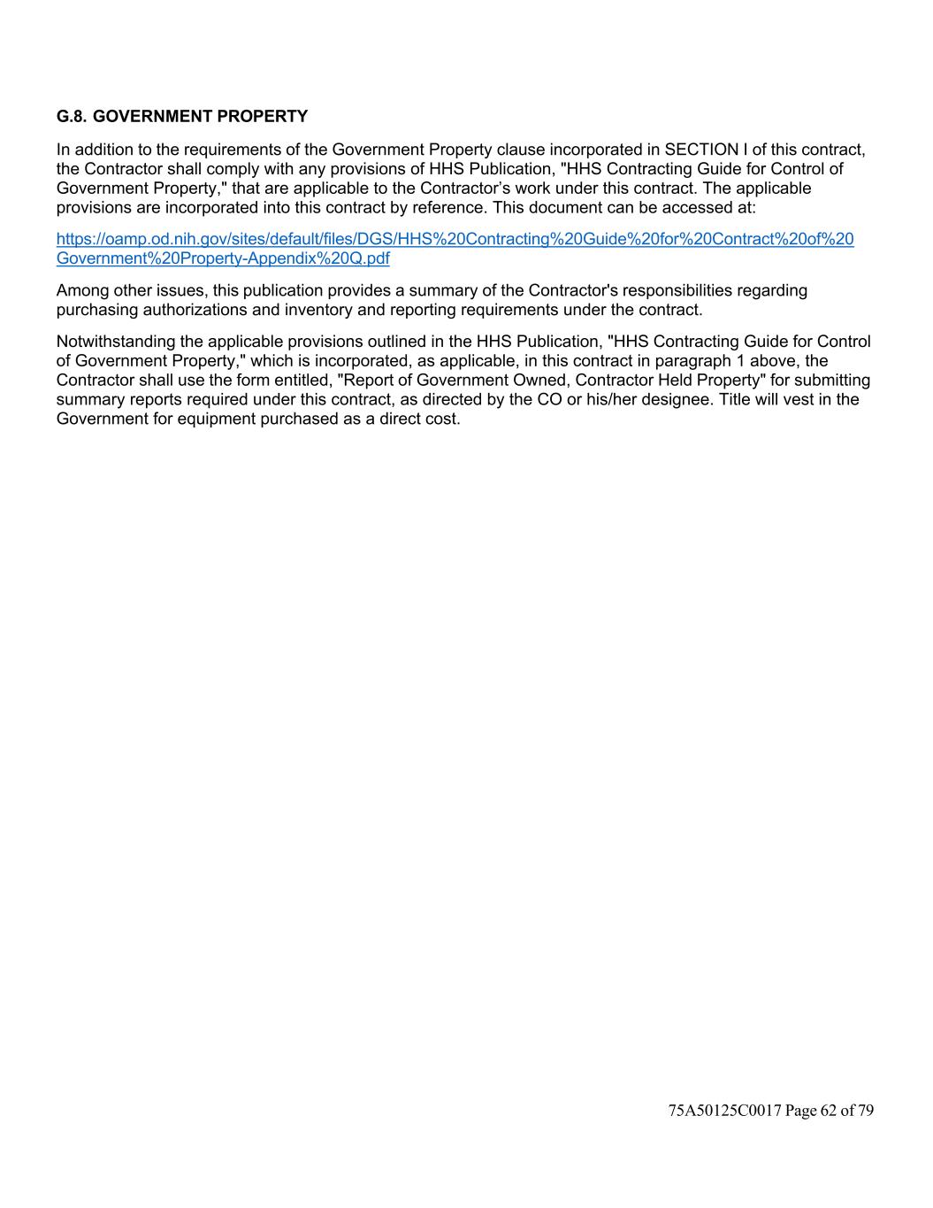 75A50125C0017 Page 62 of 79 G.8. GOVERNMENT PROPERTY In addition to the requirements of the Government Property clause incorporated in SECTION I of this contract, the Contractor shall comply with any provisions of HHS Publication, "HHS Contracting Guide for Control of Government Property," that are applicable to the Contractor’s work under this contract. The applicable provisions are incorporated into this contract by reference. This document can be accessed at: https://oamp.od.nih.gov/sites/default/files/DGS/HHS%20Contracting%20Guide%20for%20Contract%20of%20 Government%20Property-Appendix%20Q.pdf Among other issues, this publication provides a summary of the Contractor's responsibilities regarding purchasing authorizations and inventory and reporting requirements under the contract. Notwithstanding the applicable provisions outlined in the HHS Publication, "HHS Contracting Guide for Control of Government Property," which is incorporated, as applicable, in this contract in paragraph 1 above, the Contractor shall use the form entitled, "Report of Government Owned, Contractor Held Property" for submitting summary reports required under this contract, as directed by the CO or his/her designee. Title will vest in the Government for equipment purchased as a direct cost.