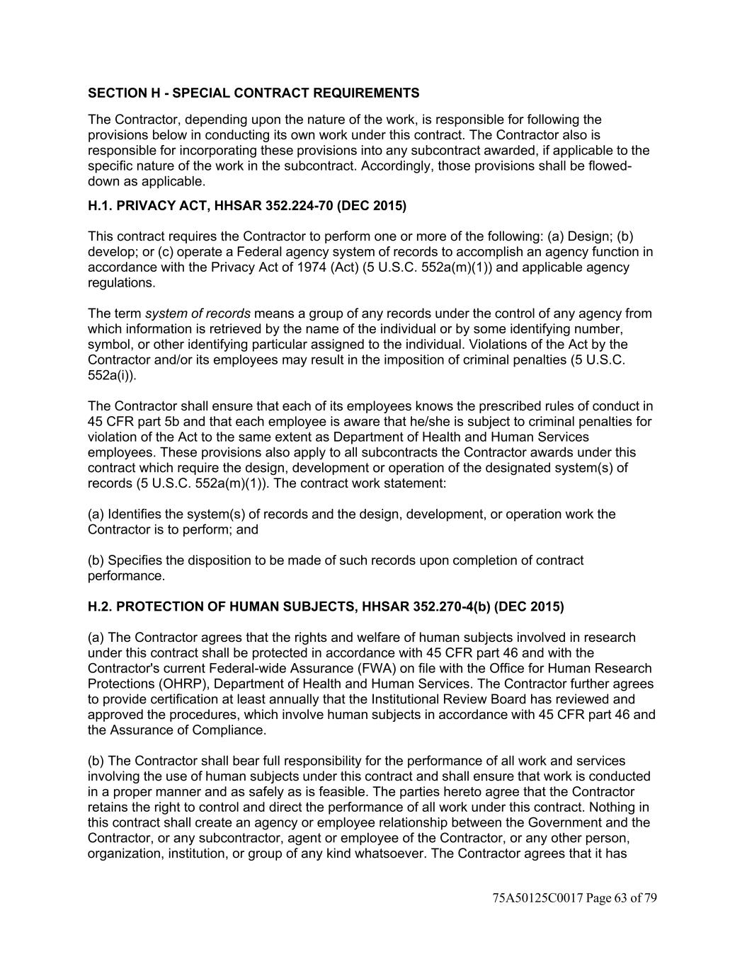 75A50125C0017 Page 63 of 79 SECTION H - SPECIAL CONTRACT REQUIREMENTS The Contractor, depending upon the nature of the work, is responsible for following the provisions below in conducting its own work under this contract. The Contractor also is responsible for incorporating these provisions into any subcontract awarded, if applicable to the specific nature of the work in the subcontract. Accordingly, those provisions shall be flowed- down as applicable. H.1. PRIVACY ACT, HHSAR 352.224-70 (DEC 2015) This contract requires the Contractor to perform one or more of the following: (a) Design; (b) develop; or (c) operate a Federal agency system of records to accomplish an agency function in accordance with the Privacy Act of 1974 (Act) (5 U.S.C. 552a(m)(1)) and applicable agency regulations. The term system of records means a group of any records under the control of any agency from which information is retrieved by the name of the individual or by some identifying number, symbol, or other identifying particular assigned to the individual. Violations of the Act by the Contractor and/or its employees may result in the imposition of criminal penalties (5 U.S.C. 552a(i)). The Contractor shall ensure that each of its employees knows the prescribed rules of conduct in 45 CFR part 5b and that each employee is aware that he/she is subject to criminal penalties for violation of the Act to the same extent as Department of Health and Human Services employees. These provisions also apply to all subcontracts the Contractor awards under this contract which require the design, development or operation of the designated system(s) of records (5 U.S.C. 552a(m)(1)). The contract work statement: (a) Identifies the system(s) of records and the design, development, or operation work the Contractor is to perform; and (b) Specifies the disposition to be made of such records upon completion of contract performance. H.2. PROTECTION OF HUMAN SUBJECTS, HHSAR 352.270-4(b) (DEC 2015) (a) The Contractor agrees that the rights and welfare of human subjects involved in research under this contract shall be protected in accordance with 45 CFR part 46 and with the Contractor's current Federal-wide Assurance (FWA) on file with the Office for Human Research Protections (OHRP), Department of Health and Human Services. The Contractor further agrees to provide certification at least annually that the Institutional Review Board has reviewed and approved the procedures, which involve human subjects in accordance with 45 CFR part 46 and the Assurance of Compliance. (b) The Contractor shall bear full responsibility for the performance of all work and services involving the use of human subjects under this contract and shall ensure that work is conducted in a proper manner and as safely as is feasible. The parties hereto agree that the Contractor retains the right to control and direct the performance of all work under this contract. Nothing in this contract shall create an agency or employee relationship between the Government and the Contractor, or any subcontractor, agent or employee of the Contractor, or any other person, organization, institution, or group of any kind whatsoever. The Contractor agrees that it has