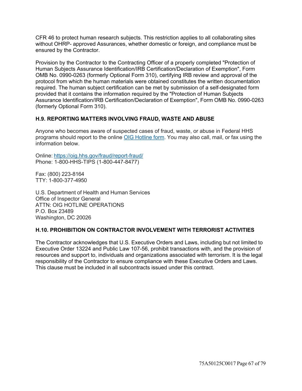 75A50125C0017 Page 67 of 79 CFR 46 to protect human research subjects. This restriction applies to all collaborating sites without OHRP- approved Assurances, whether domestic or foreign, and compliance must be ensured by the Contractor. Provision by the Contractor to the Contracting Officer of a properly completed "Protection of Human Subjects Assurance Identification/IRB Certification/Declaration of Exemption", Form OMB No. 0990-0263 (formerly Optional Form 310), certifying IRB review and approval of the protocol from which the human materials were obtained constitutes the written documentation required. The human subject certification can be met by submission of a self-designated form provided that it contains the information required by the "Protection of Human Subjects Assurance Identification/IRB Certification/Declaration of Exemption", Form OMB No. 0990-0263 (formerly Optional Form 310). H.9. REPORTING MATTERS INVOLVING FRAUD, WASTE AND ABUSE Anyone who becomes aware of suspected cases of fraud, waste, or abuse in Federal HHS programs should report to the online OIG Hotline form. You may also call, mail, or fax using the information below. Online: https://oig.hhs.gov/fraud/report-fraud/ Phone: 1-800-HHS-TIPS (1-800-447-8477) Fax: (800) 223-8164 TTY: 1-800-377-4950 U.S. Department of Health and Human Services Office of Inspector General ATTN: OIG HOTLINE OPERATIONS P.O. Box 23489 Washington, DC 20026 H.10. PROHIBITION ON CONTRACTOR INVOLVEMENT WITH TERRORIST ACTIVITIES The Contractor acknowledges that U.S. Executive Orders and Laws, including but not limited to Executive Order 13224 and Public Law 107-56, prohibit transactions with, and the provision of resources and support to, individuals and organizations associated with terrorism. It is the legal responsibility of the Contractor to ensure compliance with these Executive Orders and Laws. This clause must be included in all subcontracts issued under this contract.