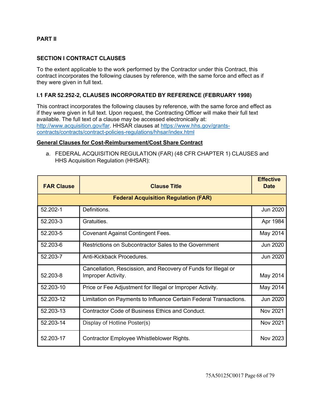 75A50125C0017 Page 68 of 79 PART II SECTION I CONTRACT CLAUSES To the extent applicable to the work performed by the Contractor under this Contract, this contract incorporates the following clauses by reference, with the same force and effect as if they were given in full text. I.1 FAR 52.252-2, CLAUSES INCORPORATED BY REFERENCE (FEBRUARY 1998) This contract incorporates the following clauses by reference, with the same force and effect as if they were given in full text. Upon request, the Contracting Officer will make their full text available. The full text of a clause may be accessed electronically at: http://www.acquisition.gov/far. HHSAR clauses at https://www.hhs.gov/grants- contracts/contracts/contract-policies-regulations/hhsar/index.html General Clauses for Cost-Reimbursement/Cost Share Contract a. FEDERAL ACQUISITION REGULATION (FAR) (48 CFR CHAPTER 1) CLAUSES and HHS Acquisition Regulation (HHSAR): FAR Clause Clause Title Effective Date Federal Acquisition Regulation (FAR) 52.202-1 Definitions. Jun 2020 52.203-3 Gratuities. Apr 1984 52.203-5 Covenant Against Contingent Fees. May 2014 52.203-6 Restrictions on Subcontractor Sales to the Government Jun 2020 52.203-7 Anti-Kickback Procedures. Jun 2020 52.203-8 Cancellation, Rescission, and Recovery of Funds for Illegal or Improper Activity. May 2014 52.203-10 Price or Fee Adjustment for Illegal or Improper Activity. May 2014 52.203-12 Limitation on Payments to Influence Certain Federal Transactions. Jun 2020 52.203-13 Contractor Code of Business Ethics and Conduct. Nov 2021 52.203-14 Display of Hotline Poster(s) Nov 2021 52.203-17 Contractor Employee Whistleblower Rights. Nov 2023