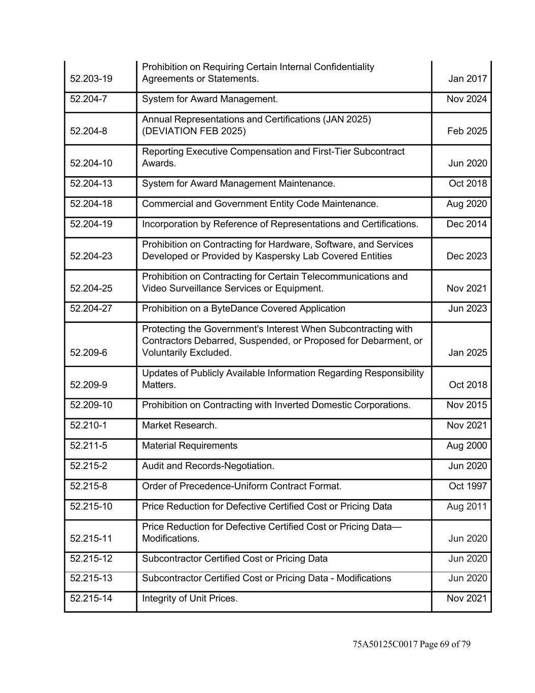 75A50125C0017 Page 69 of 79 52.203-19 Prohibition on Requiring Certain Internal Confidentiality Agreements or Statements. Jan 2017 52.204-7 System for Award Management. Nov 2024 52.204-8 Annual Representations and Certifications (JAN 2025) (DEVIATION FEB 2025) Feb 2025 52.204-10 Reporting Executive Compensation and First-Tier Subcontract Awards. Jun 2020 52.204-13 System for Award Management Maintenance. Oct 2018 52.204-18 Commercial and Government Entity Code Maintenance. Aug 2020 52.204-19 Incorporation by Reference of Representations and Certifications. Dec 2014 52.204-23 Prohibition on Contracting for Hardware, Software, and Services Developed or Provided by Kaspersky Lab Covered Entities Dec 2023 52.204-25 Prohibition on Contracting for Certain Telecommunications and Video Surveillance Services or Equipment. Nov 2021 52.204-27 Prohibition on a ByteDance Covered Application Jun 2023 52.209-6 Protecting the Government's Interest When Subcontracting with Contractors Debarred, Suspended, or Proposed for Debarment, or Voluntarily Excluded. Jan 2025 52.209-9 Updates of Publicly Available Information Regarding Responsibility Matters. Oct 2018 52.209-10 Prohibition on Contracting with Inverted Domestic Corporations. Nov 2015 52.210-1 Market Research. Nov 2021 52.211-5 Material Requirements Aug 2000 52.215-2 Audit and Records-Negotiation. Jun 2020 52.215-8 Order of Precedence-Uniform Contract Format. Oct 1997 52.215-10 Price Reduction for Defective Certified Cost or Pricing Data Aug 2011 52.215-11 Price Reduction for Defective Certified Cost or Pricing Data— Modifications. Jun 2020 52.215-12 Subcontractor Certified Cost or Pricing Data Jun 2020 52.215-13 Subcontractor Certified Cost or Pricing Data - Modifications Jun 2020 52.215-14 Integrity of Unit Prices. Nov 2021