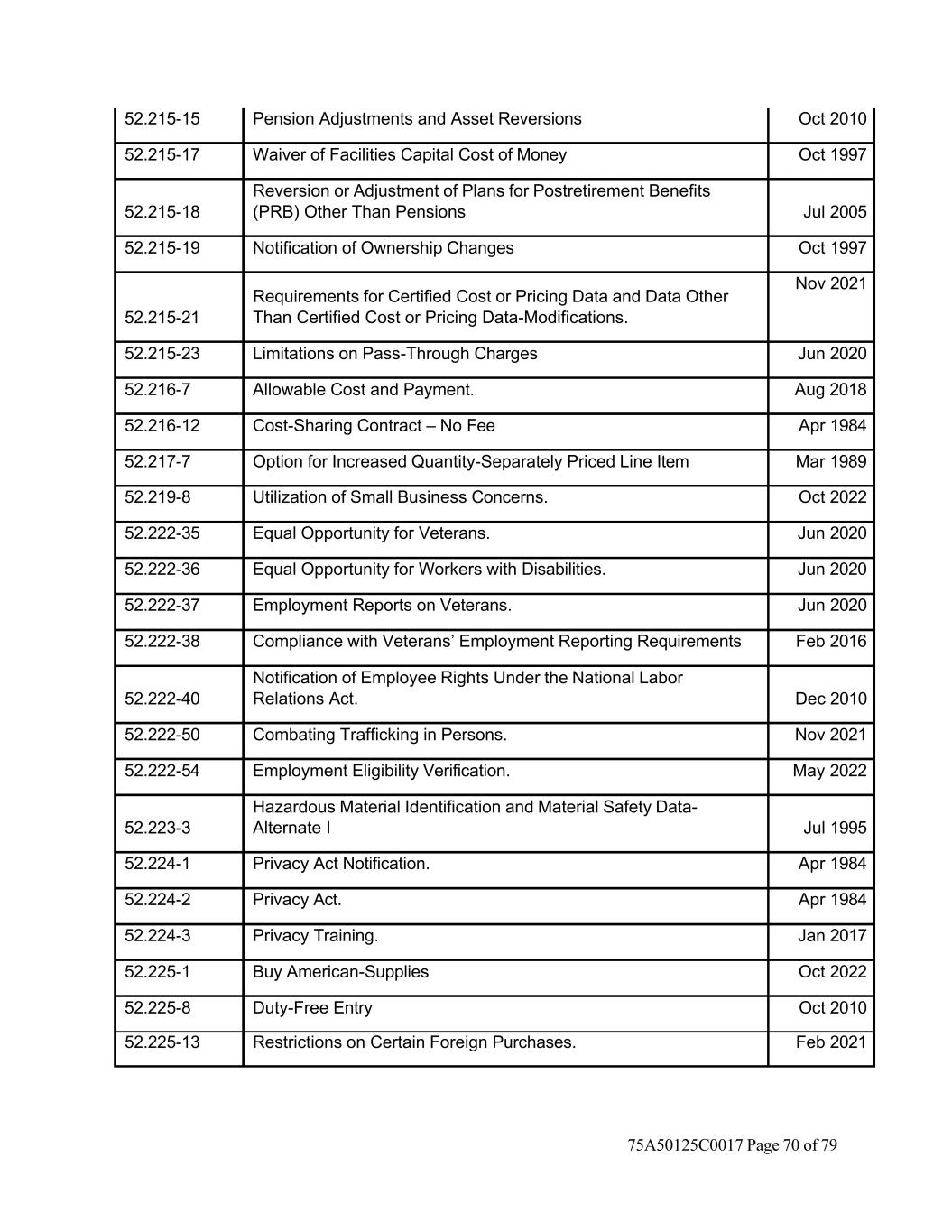 75A50125C0017 Page 70 of 79 52.215-15 Pension Adjustments and Asset Reversions Oct 2010 52.215-17 Waiver of Facilities Capital Cost of Money Oct 1997 52.215-18 Reversion or Adjustment of Plans for Postretirement Benefits (PRB) Other Than Pensions Jul 2005 52.215-19 Notification of Ownership Changes Oct 1997 52.215-21 Requirements for Certified Cost or Pricing Data and Data Other Than Certified Cost or Pricing Data-Modifications. Nov 2021 52.215-23 Limitations on Pass-Through Charges Jun 2020 52.216-7 Allowable Cost and Payment. Aug 2018 52.216-12 Cost-Sharing Contract – No Fee Apr 1984 52.217-7 Option for Increased Quantity-Separately Priced Line Item Mar 1989 52.219-8 Utilization of Small Business Concerns. Oct 2022 52.222-35 Equal Opportunity for Veterans. Jun 2020 52.222-36 Equal Opportunity for Workers with Disabilities. Jun 2020 52.222-37 Employment Reports on Veterans. Jun 2020 52.222-38 Compliance with Veterans’ Employment Reporting Requirements Feb 2016 52.222-40 Notification of Employee Rights Under the National Labor Relations Act. Dec 2010 52.222-50 Combating Trafficking in Persons. Nov 2021 52.222-54 Employment Eligibility Verification. May 2022 52.223-3 Hazardous Material Identification and Material Safety Data- Alternate I Jul 1995 52.224-1 Privacy Act Notification. Apr 1984 52.224-2 Privacy Act. Apr 1984 52.224-3 Privacy Training. Jan 2017 52.225-1 Buy American-Supplies Oct 2022 52.225-8 Duty-Free Entry Oct 2010 52.225-13 Restrictions on Certain Foreign Purchases. Feb 2021