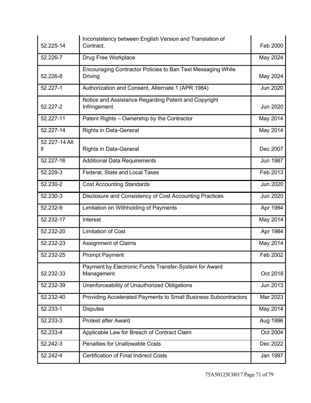 75A50125C0017 Page 71 of 79 52.225-14 Inconsistency between English Version and Translation of Contract. Feb 2000 52.226-7 Drug Free Workplace May 2024 52.226-8 Encouraging Contractor Policies to Ban Text Messaging While Driving May 2024 52.227-1 Authorization and Consent, Alternate 1 (APR 1984) Jun 2020 52.227-2 Notice and Assistance Regarding Patent and Copyright Infringement Jun 2020 52.227-11 Patent Rights – Ownership by the Contractor May 2014 52.227-14 Rights in Data-General May 2014 52.227-14 Alt II Rights in Data-General Dec 2007 52.227-16 Additional Data Requirements Jun 1987 52.229-3 Federal, State and Local Taxes Feb 2013 52.230-2 Cost Accounting Standards Jun 2020 52.230-3 Disclosure and Consistency of Cost Accounting Practices Jun 2020 52.232-9 Limitation on Withholding of Payments Apr 1984 52.232-17 Interest May 2014 52.232-20 Limitation of Cost Apr 1984 52.232-23 Assignment of Claims May 2014 52.232-25 Prompt Payment Feb 2002 52.232-33 Payment by Electronic Funds Transfer-System for Award Management Oct 2018 52.232-39 Unenforceability of Unauthorized Obligations Jun 2013 52.232-40 Providing Accelerated Payments to Small Business Subcontractors Mar 2023 52.233-1 Disputes May 2014 52.233-3 Protest after Award Aug 1996 52.233-4 Applicable Law for Breach of Contract Claim Oct 2004 52.242-3 Penalties for Unallowable Costs Dec 2022 52.242-4 Certification of Final Indirect Costs Jan 1997