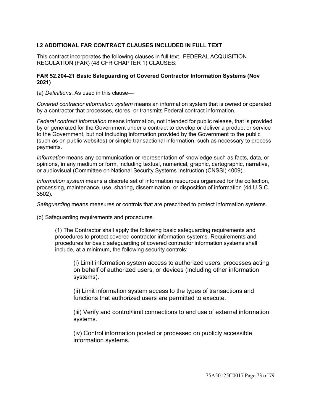 75A50125C0017 Page 73 of 79 I.2 ADDITIONAL FAR CONTRACT CLAUSES INCLUDED IN FULL TEXT This contract incorporates the following clauses in full text. FEDERAL ACQUISITION REGULATION (FAR) (48 CFR CHAPTER 1) CLAUSES: FAR 52.204-21 Basic Safeguarding of Covered Contractor Information Systems (Nov 2021) (a) Definitions. As used in this clause— Covered contractor information system means an information system that is owned or operated by a contractor that processes, stores, or transmits Federal contract information. Federal contract information means information, not intended for public release, that is provided by or generated for the Government under a contract to develop or deliver a product or service to the Government, but not including information provided by the Government to the public (such as on public websites) or simple transactional information, such as necessary to process payments. Information means any communication or representation of knowledge such as facts, data, or opinions, in any medium or form, including textual, numerical, graphic, cartographic, narrative, or audiovisual (Committee on National Security Systems Instruction (CNSSI) 4009). Information system means a discrete set of information resources organized for the collection, processing, maintenance, use, sharing, dissemination, or disposition of information (44 U.S.C. 3502). Safeguarding means measures or controls that are prescribed to protect information systems. (b) Safeguarding requirements and procedures. (1) The Contractor shall apply the following basic safeguarding requirements and procedures to protect covered contractor information systems. Requirements and procedures for basic safeguarding of covered contractor information systems shall include, at a minimum, the following security controls: (i) Limit information system access to authorized users, processes acting on behalf of authorized users, or devices (including other information systems). (ii) Limit information system access to the types of transactions and functions that authorized users are permitted to execute. (iii) Verify and control/limit connections to and use of external information systems. (iv) Control information posted or processed on publicly accessible information systems.