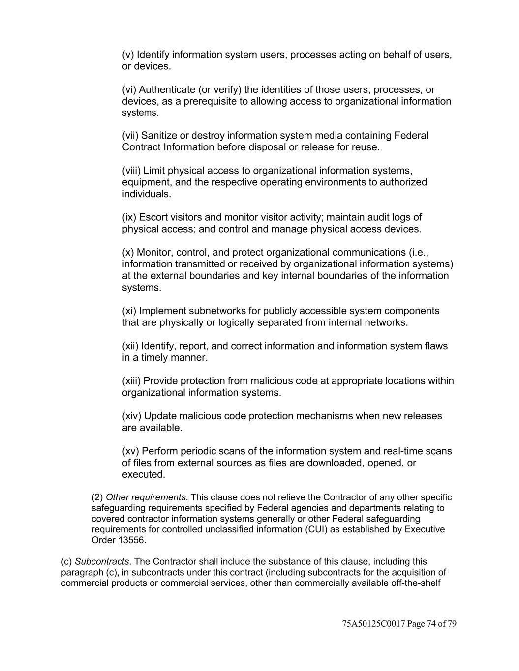 75A50125C0017 Page 74 of 79 (v) Identify information system users, processes acting on behalf of users, or devices. (vi) Authenticate (or verify) the identities of those users, processes, or devices, as a prerequisite to allowing access to organizational information systems. (vii) Sanitize or destroy information system media containing Federal Contract Information before disposal or release for reuse. (viii) Limit physical access to organizational information systems, equipment, and the respective operating environments to authorized individuals. (ix) Escort visitors and monitor visitor activity; maintain audit logs of physical access; and control and manage physical access devices. (x) Monitor, control, and protect organizational communications (i.e., information transmitted or received by organizational information systems) at the external boundaries and key internal boundaries of the information systems. (xi) Implement subnetworks for publicly accessible system components that are physically or logically separated from internal networks. (xii) Identify, report, and correct information and information system flaws in a timely manner. (xiii) Provide protection from malicious code at appropriate locations within organizational information systems. (xiv) Update malicious code protection mechanisms when new releases are available. (xv) Perform periodic scans of the information system and real-time scans of files from external sources as files are downloaded, opened, or executed. (2) Other requirements. This clause does not relieve the Contractor of any other specific safeguarding requirements specified by Federal agencies and departments relating to covered contractor information systems generally or other Federal safeguarding requirements for controlled unclassified information (CUI) as established by Executive Order 13556. (c) Subcontracts. The Contractor shall include the substance of this clause, including this paragraph (c), in subcontracts under this contract (including subcontracts for the acquisition of commercial products or commercial services, other than commercially available off-the-shelf