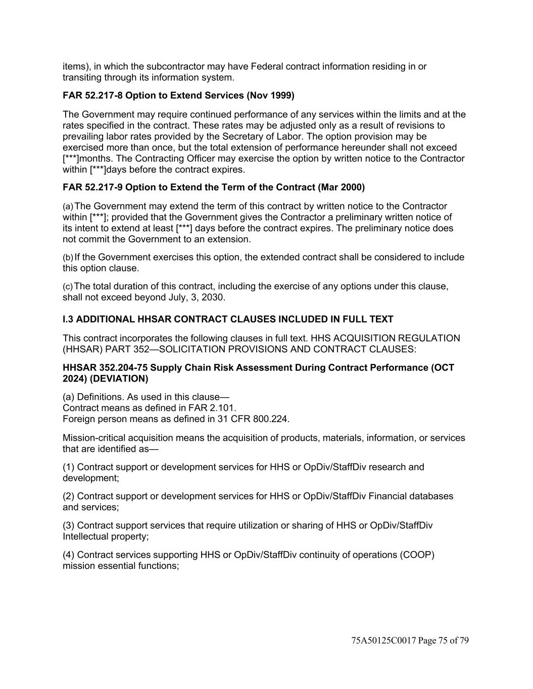 75A50125C0017 Page 75 of 79 items), in which the subcontractor may have Federal contract information residing in or transiting through its information system. FAR 52.217-8 Option to Extend Services (Nov 1999) The Government may require continued performance of any services within the limits and at the rates specified in the contract. These rates may be adjusted only as a result of revisions to prevailing labor rates provided by the Secretary of Labor. The option provision may be exercised more than once, but the total extension of performance hereunder shall not exceed [***]months. The Contracting Officer may exercise the option by written notice to the Contractor within [***]days before the contract expires. FAR 52.217-9 Option to Extend the Term of the Contract (Mar 2000) (a) The Government may extend the term of this contract by written notice to the Contractor within [***]; provided that the Government gives the Contractor a preliminary written notice of its intent to extend at least [***] days before the contract expires. The preliminary notice does not commit the Government to an extension. (b) If the Government exercises this option, the extended contract shall be considered to include this option clause. (c) The total duration of this contract, including the exercise of any options under this clause, shall not exceed beyond July, 3, 2030. I.3 ADDITIONAL HHSAR CONTRACT CLAUSES INCLUDED IN FULL TEXT This contract incorporates the following clauses in full text. HHS ACQUISITION REGULATION (HHSAR) PART 352—SOLICITATION PROVISIONS AND CONTRACT CLAUSES: HHSAR 352.204-75 Supply Chain Risk Assessment During Contract Performance (OCT 2024) (DEVIATION) (a) Definitions. As used in this clause— Contract means as defined in FAR 2.101. Foreign person means as defined in 31 CFR 800.224. Mission-critical acquisition means the acquisition of products, materials, information, or services that are identified as— (1) Contract support or development services for HHS or OpDiv/StaffDiv research and development; (2) Contract support or development services for HHS or OpDiv/StaffDiv Financial databases and services; (3) Contract support services that require utilization or sharing of HHS or OpDiv/StaffDiv Intellectual property; (4) Contract services supporting HHS or OpDiv/StaffDiv continuity of operations (COOP) mission essential functions;