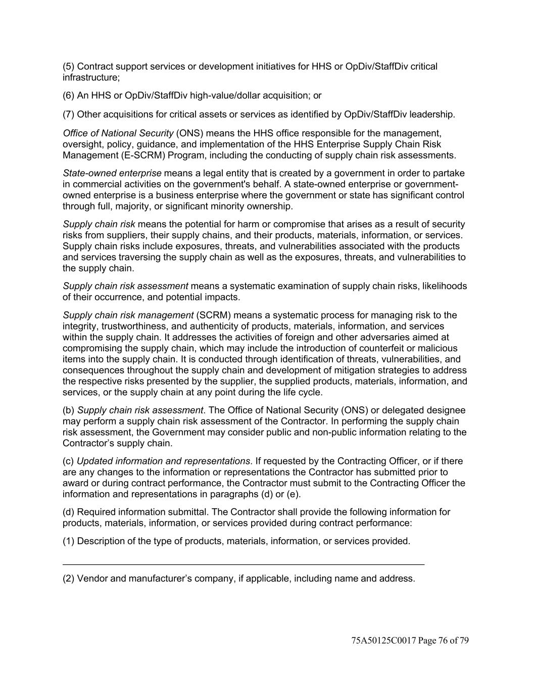 75A50125C0017 Page 76 of 79 (5) Contract support services or development initiatives for HHS or OpDiv/StaffDiv critical infrastructure; (6) An HHS or OpDiv/StaffDiv high-value/dollar acquisition; or (7) Other acquisitions for critical assets or services as identified by OpDiv/StaffDiv leadership. Office of National Security (ONS) means the HHS office responsible for the management, oversight, policy, guidance, and implementation of the HHS Enterprise Supply Chain Risk Management (E-SCRM) Program, including the conducting of supply chain risk assessments. State-owned enterprise means a legal entity that is created by a government in order to partake in commercial activities on the government's behalf. A state-owned enterprise or government- owned enterprise is a business enterprise where the government or state has significant control through full, majority, or significant minority ownership. Supply chain risk means the potential for harm or compromise that arises as a result of security risks from suppliers, their supply chains, and their products, materials, information, or services. Supply chain risks include exposures, threats, and vulnerabilities associated with the products and services traversing the supply chain as well as the exposures, threats, and vulnerabilities to the supply chain. Supply chain risk assessment means a systematic examination of supply chain risks, likelihoods of their occurrence, and potential impacts. Supply chain risk management (SCRM) means a systematic process for managing risk to the integrity, trustworthiness, and authenticity of products, materials, information, and services within the supply chain. It addresses the activities of foreign and other adversaries aimed at compromising the supply chain, which may include the introduction of counterfeit or malicious items into the supply chain. It is conducted through identification of threats, vulnerabilities, and consequences throughout the supply chain and development of mitigation strategies to address the respective risks presented by the supplier, the supplied products, materials, information, and services, or the supply chain at any point during the life cycle. (b) Supply chain risk assessment. The Office of National Security (ONS) or delegated designee may perform a supply chain risk assessment of the Contractor. In performing the supply chain risk assessment, the Government may consider public and non-public information relating to the Contractor’s supply chain. (c) Updated information and representations. If requested by the Contracting Officer, or if there are any changes to the information or representations the Contractor has submitted prior to award or during contract performance, the Contractor must submit to the Contracting Officer the information and representations in paragraphs (d) or (e). (d) Required information submittal. The Contractor shall provide the following information for products, materials, information, or services provided during contract performance: (1) Description of the type of products, materials, information, or services provided. (2) Vendor and manufacturer’s company, if applicable, including name and address.